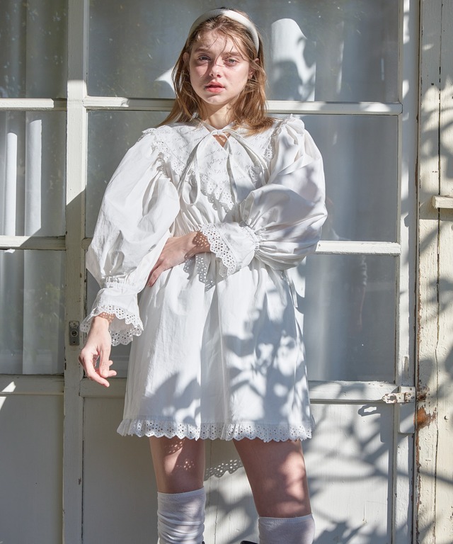 フランス語刺繍襟のカシュクールミニワンピース ◆point 襟にフランス語の刺繍を施した、ロマンティックなワンピース。 カシュクールの仕様で、ウエストを調整していただけます。 カシュクールの内側はボタンでとめれるようになっており、外側(左脇)はリボンでとめれるようになっています。 首元のリボンがチョーカーのようなアクセントに。 ◆fabric 少し肉厚の綿素材を使用しました。 透けにくいですが、ペチコートなどをお召いただくと安心です。 襟周りや袖口、裾はレースでトリミングしています。 ………………………………………… 生地の厚み: やや厚手 生地の透け感: ややあり 生地の伸縮性: なし 生地の光沢感: なし ポケット: なし 裏地: なし 着脱方法: 右脇の内ボタンと左脇のリボンで着脱 品質表示:本体 綿100%、レース部分 綿100% made in China ………………………………………… ◆coordinate ロングブーツと合わせるとバランス良くきまります。 1枚でワンピースとしてはもちろん、デニムに合わせてチュニックのようにご使用いただくのもおすすめです。 ◆color white ◆size 着丈83cm、バスト100cm、ウエスト68cm 着用モデル:174cm ※照明の関係により、実際よりも色味が違って見える場合があります。またパソコン・スマートフォンなどの環境により、製品と画像のカラーが若干異なる場合もございます。予めご了承ください。 管理品番:126003 white