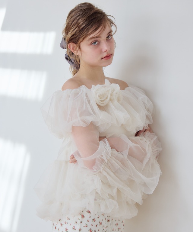 ローズチュールオフショルブラウス ◆point デコルテに薔薇のモチーフのついたチュールのブラウス。 デコルテはゴム仕様なので、オフショルにもなり、2wayでお召いただけます。 ◆fabric チュール生地をふんだんに使用しました。 ………………………………………… 生地の厚み: 薄手 生地の透け感: あり 生地の伸縮性: あり 生地の光沢感: なし ポケット: なし 裏地: なし 着脱方法: 被りで着脱 品質表示:ポリエステル100% made in China ………………………………………… ◆coordinate インナーは付属しておりませんので、ベアトップや、キャミソールなどお好きなスタイルでお楽しみください。 デニムやミニスカートなどを合わせてカジュアルにお使いいただいたり、きれいめのパンツなどを合わせて結婚式や二次会などのフォーマルなシーンにお使いいただいたり、多様なシーンで活躍する優秀トップスです。 ◆color white ◆size 着丈55cm、バスト84cm、裄丈80cm 着用モデル:174cm ※照明の関係により、実際よりも色味が違って見える場合があります。またパソコン・スマートフォンなどの環境により、製品と画像のカラーが若干異なる場合もございます。予めご了承ください。 管理品番:126006 white