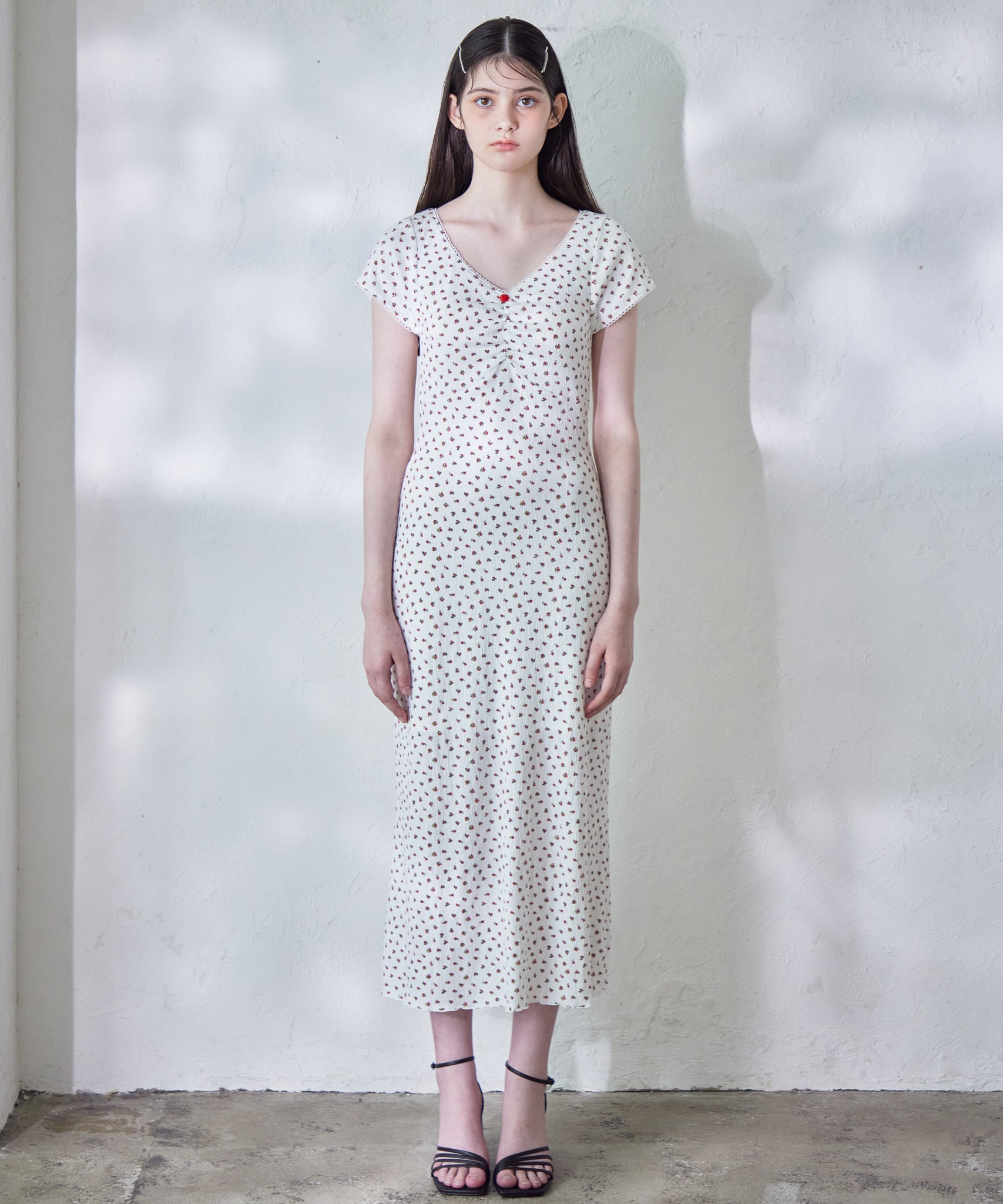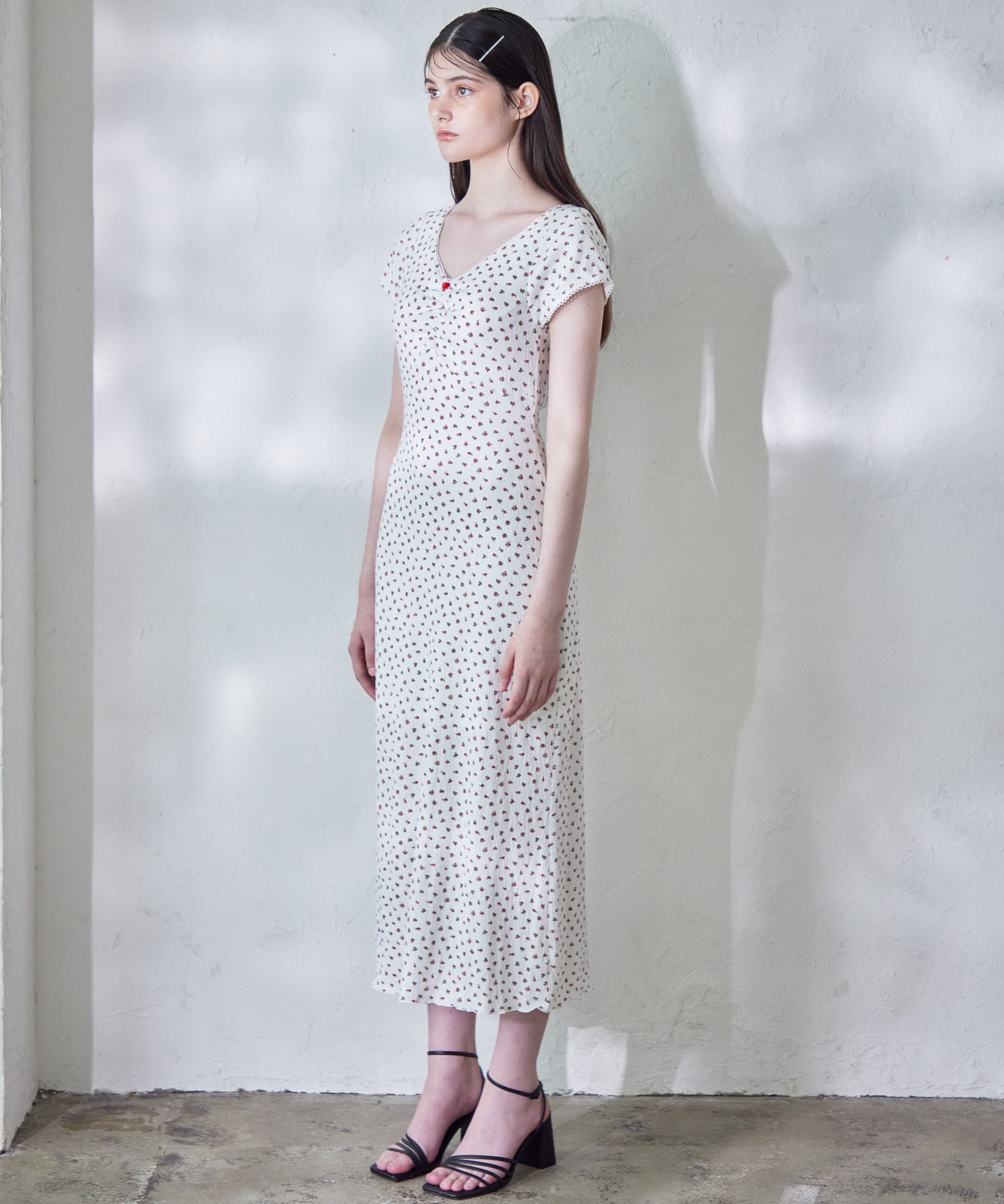 胸元の小さな薔薇がアクセントに。