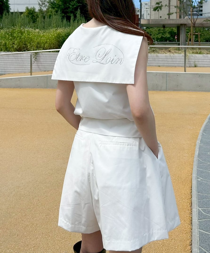 セーラーカラーに、ラインストーンでロゴを施したシャツブラウス。