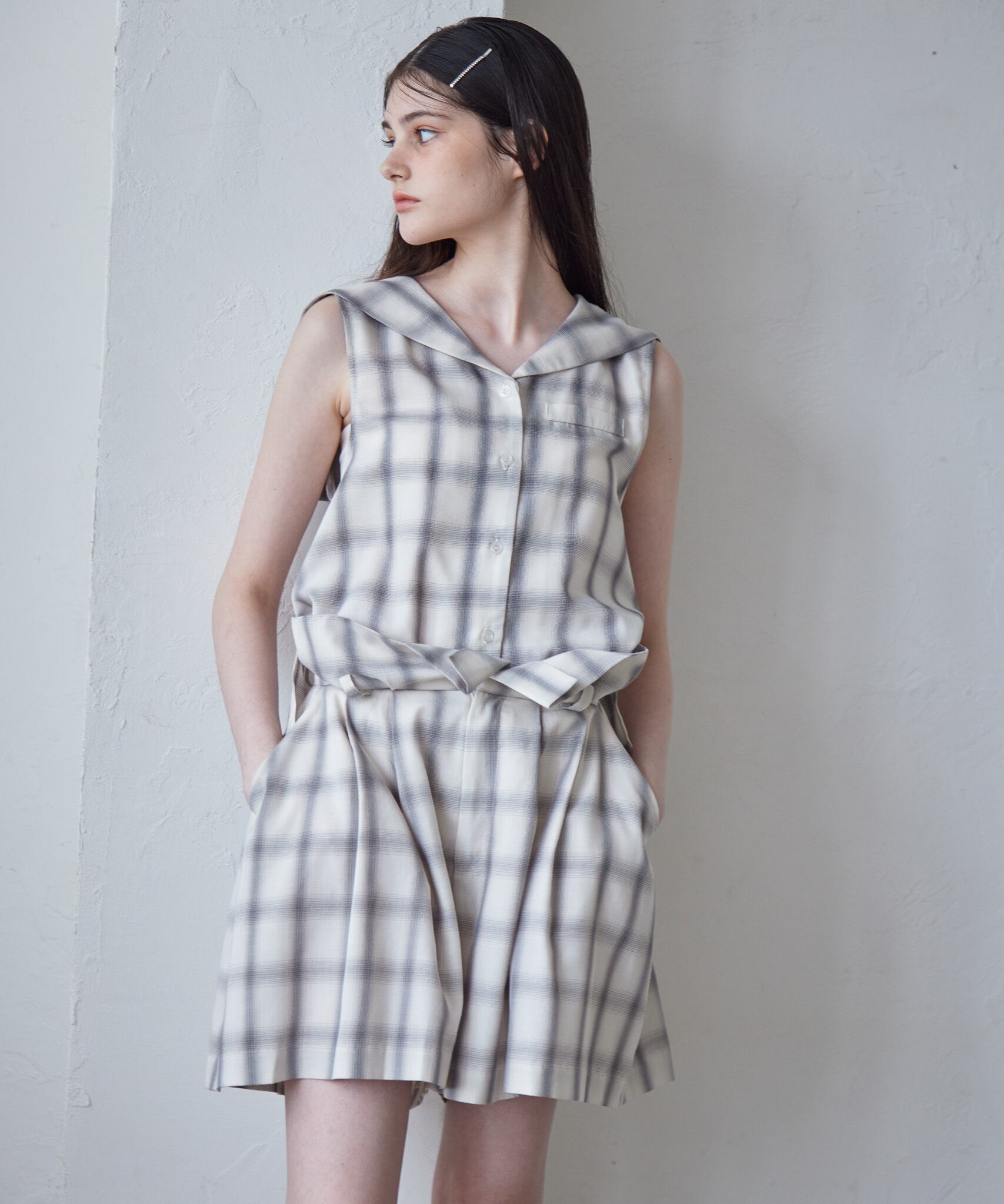 同じ生地の、Rhinestone logo sailor collar shirt(品番:125030)とセットアップで着用するのもおすすめです!