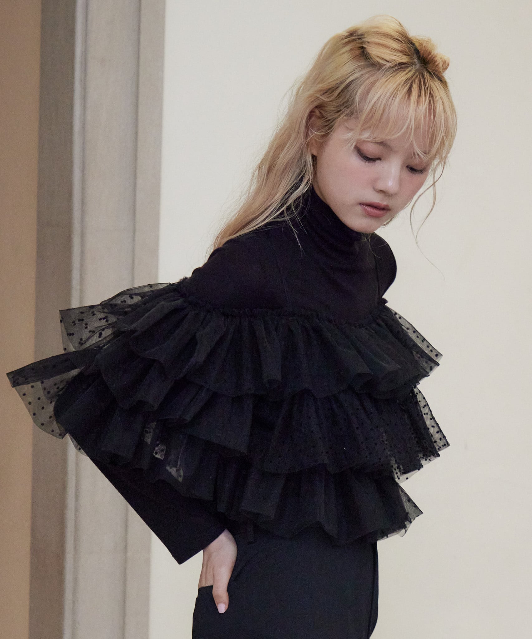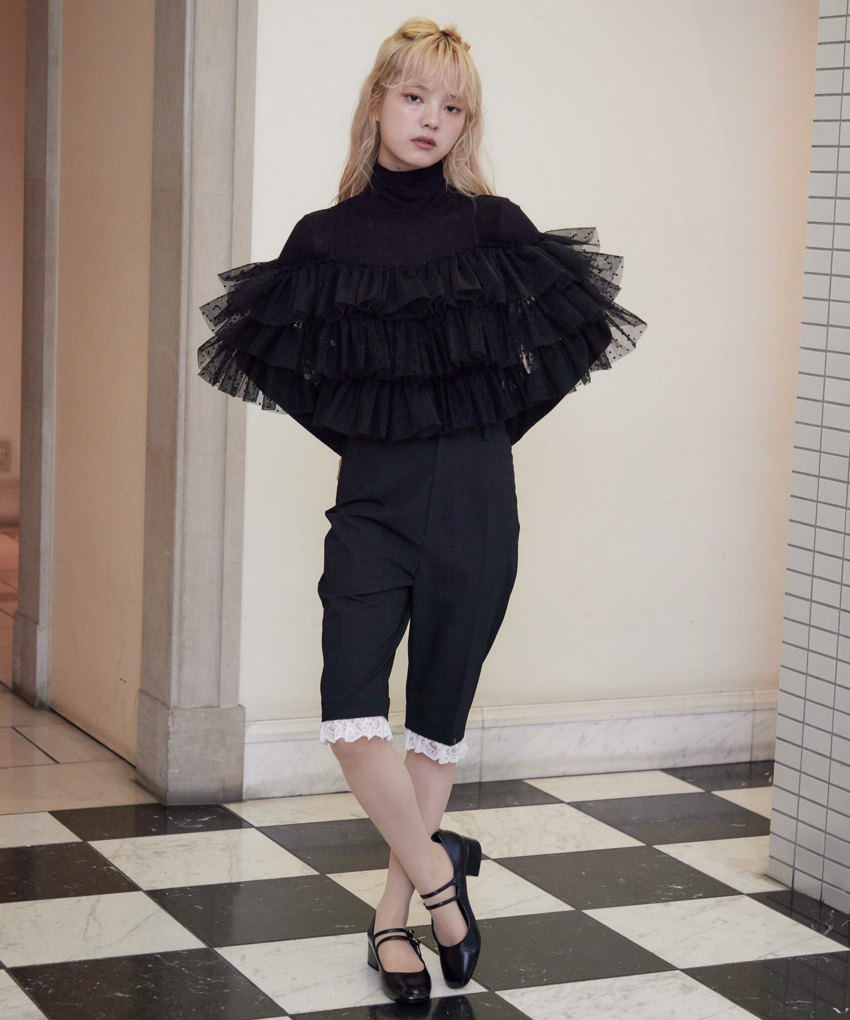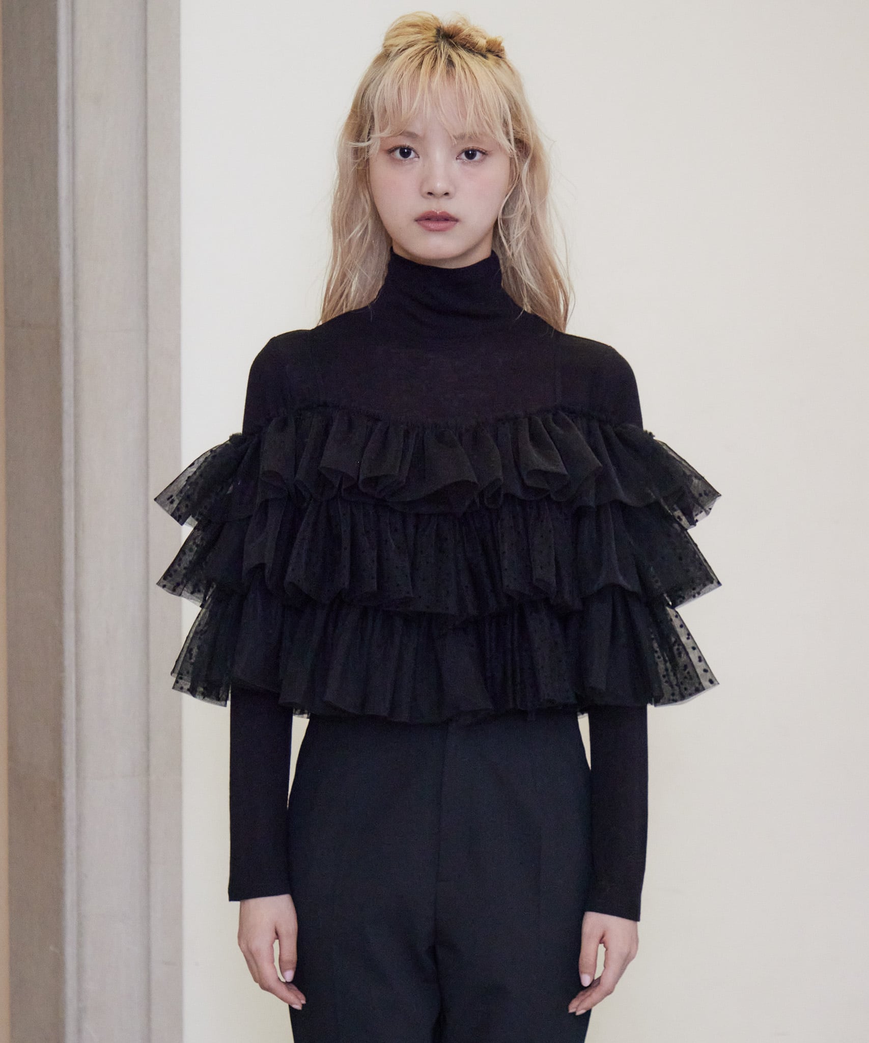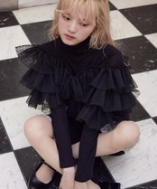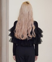 Dot tulle ruffle & knit top set【black】125047