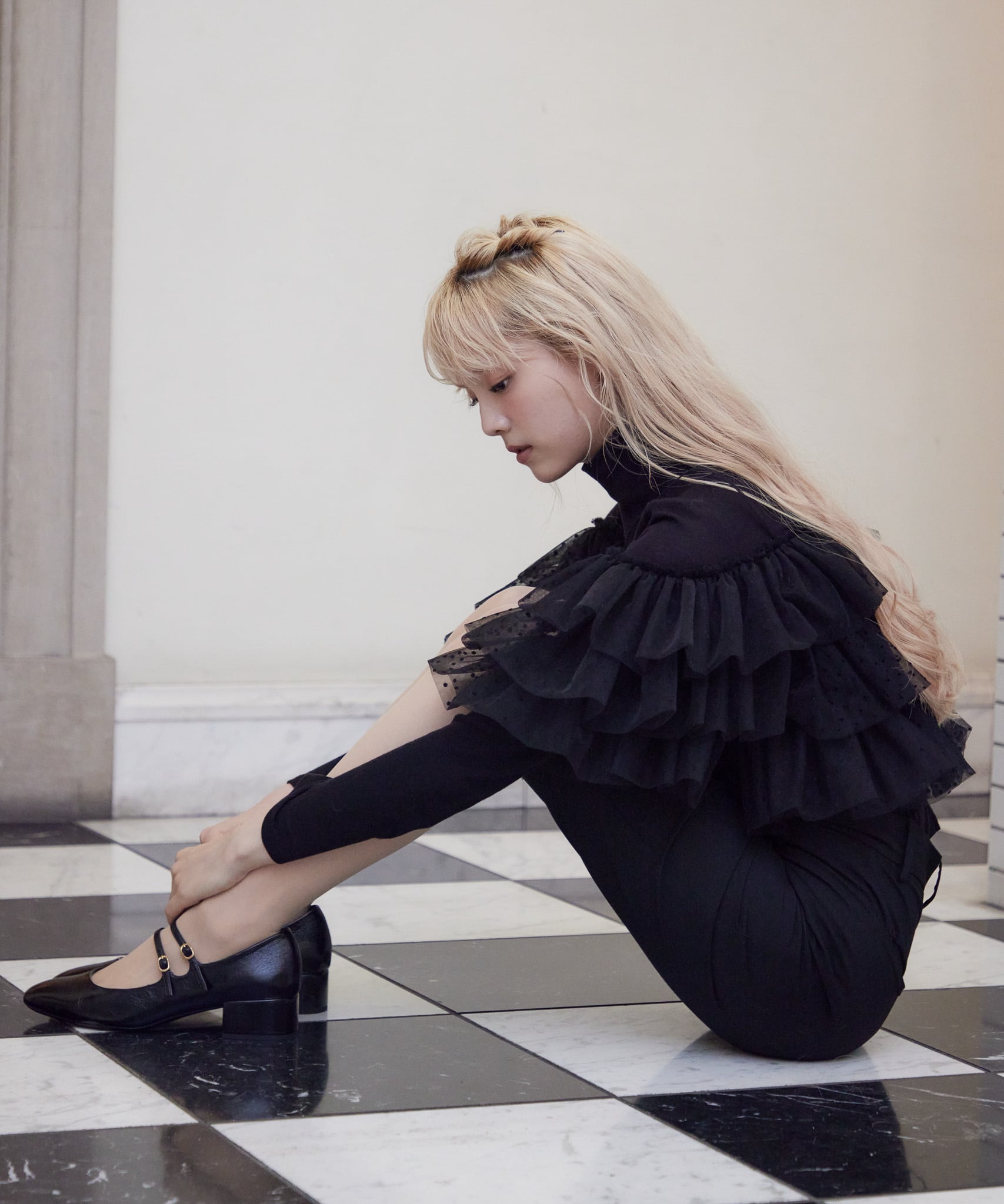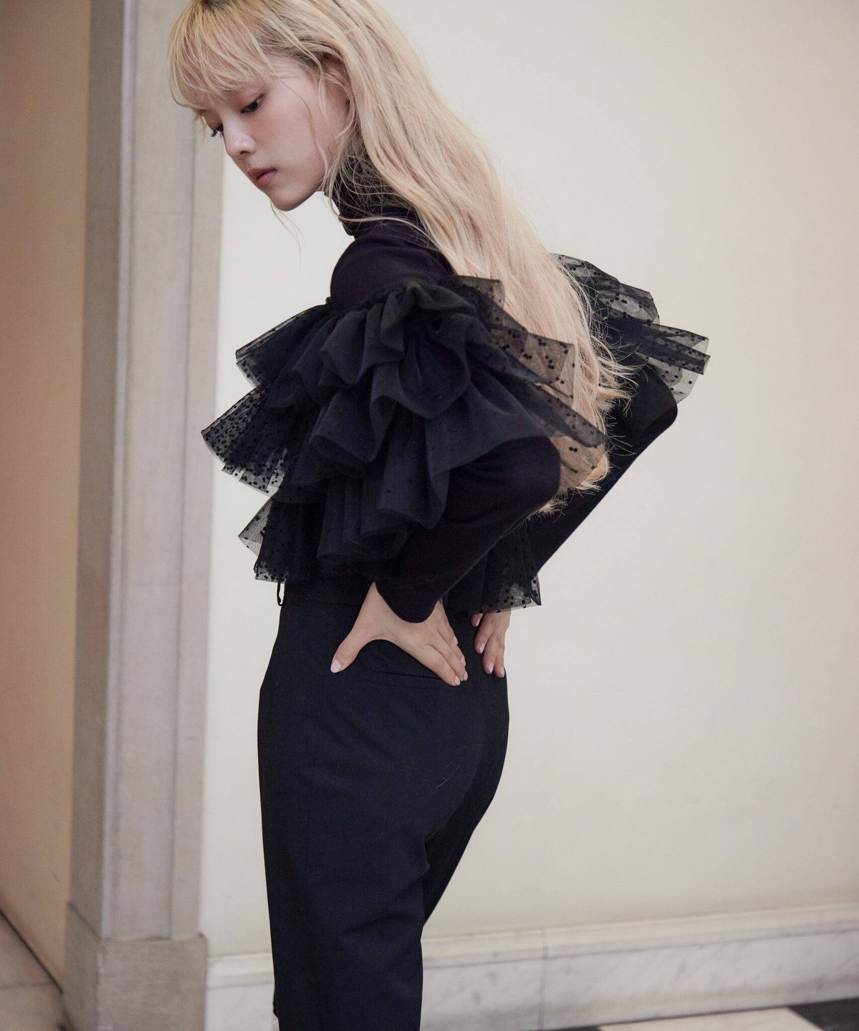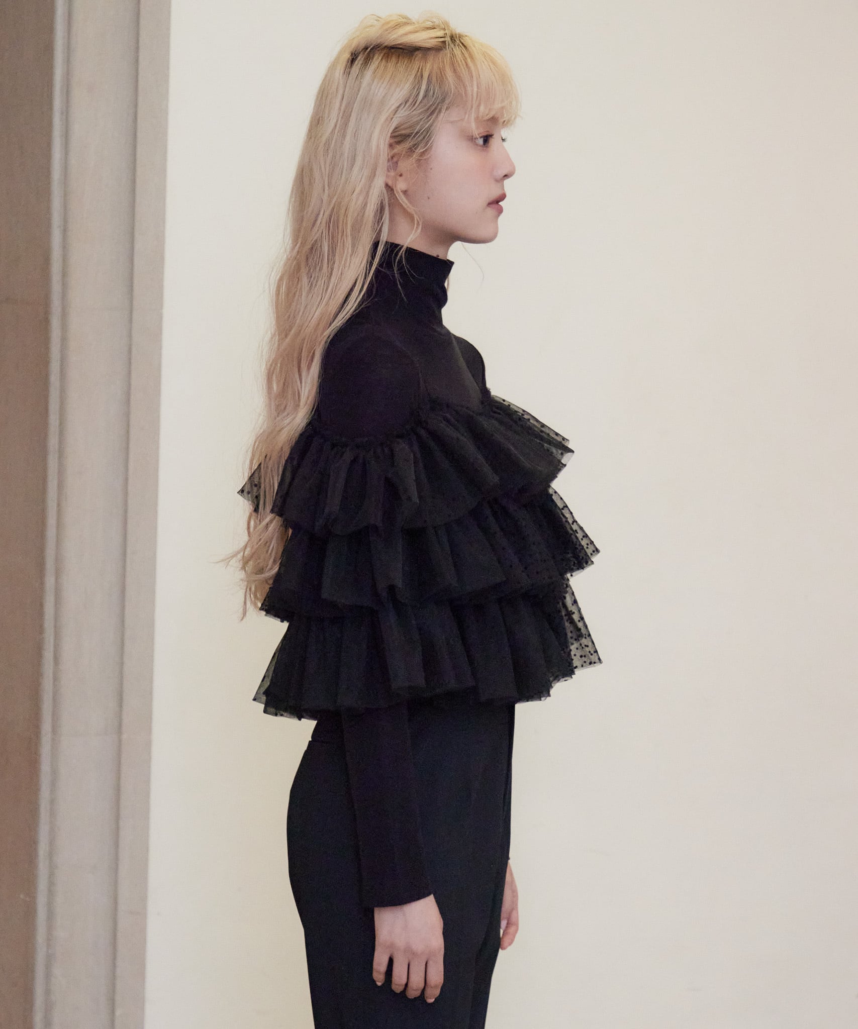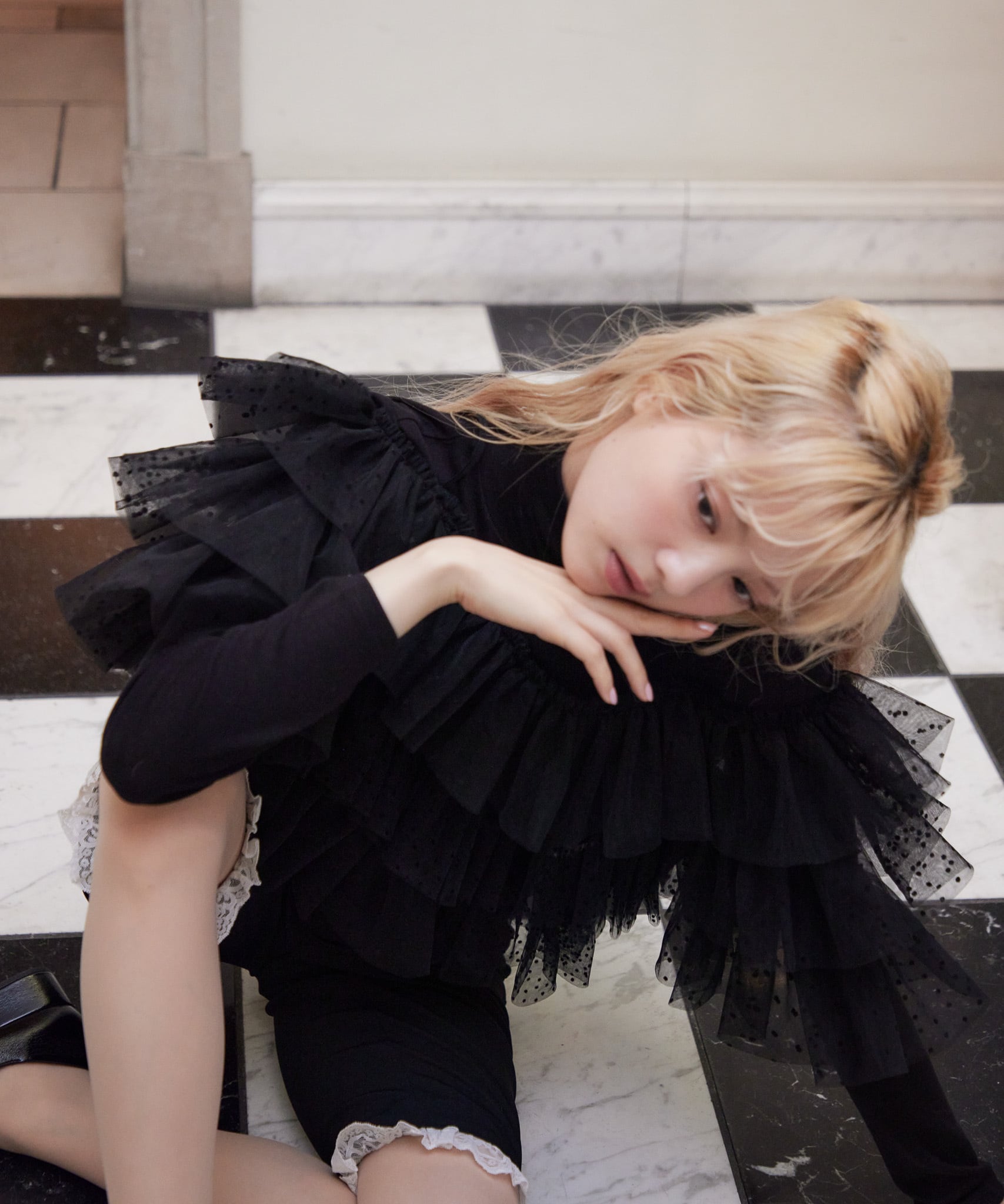 Dot tulle ruffle & knit top set【black】125047