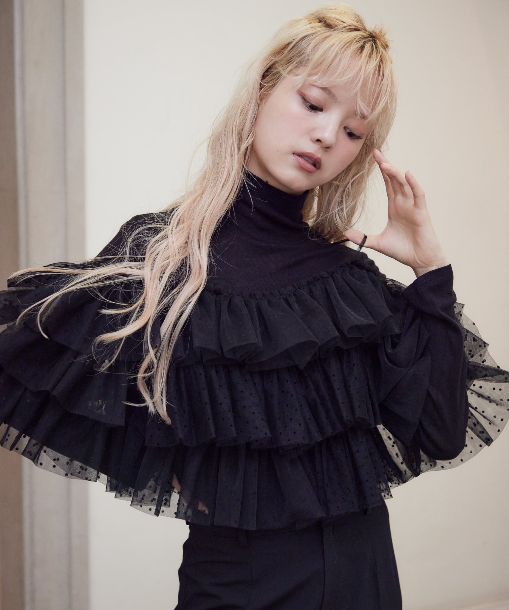 たっぷりのフリルのキャミソールと、タートルネックニットのセット。