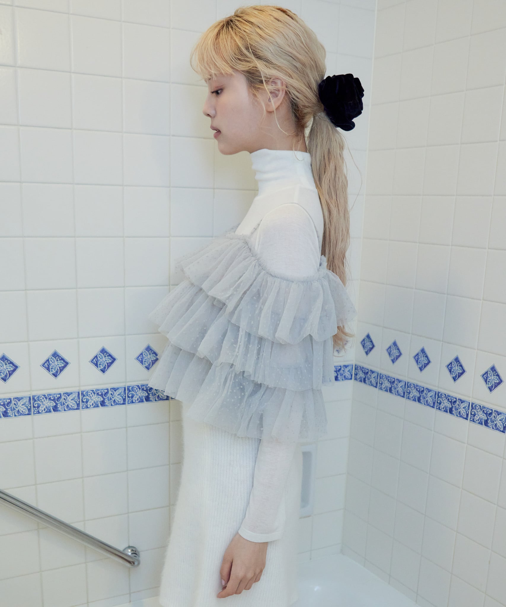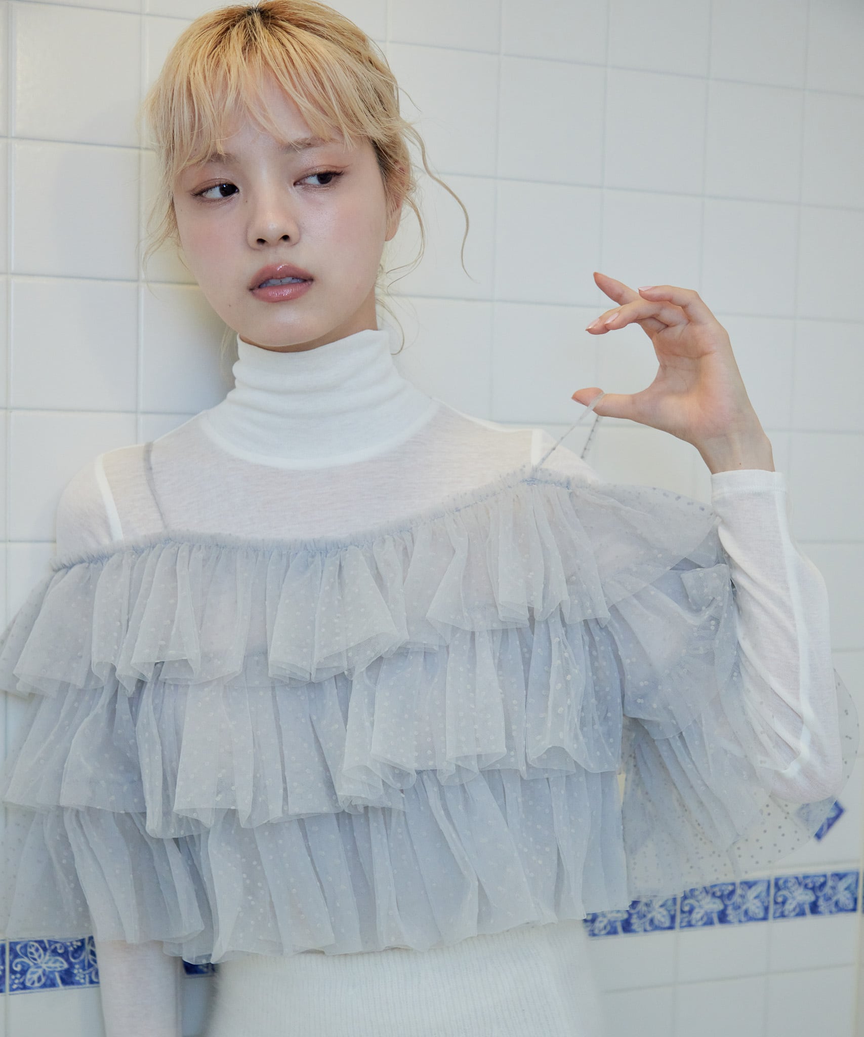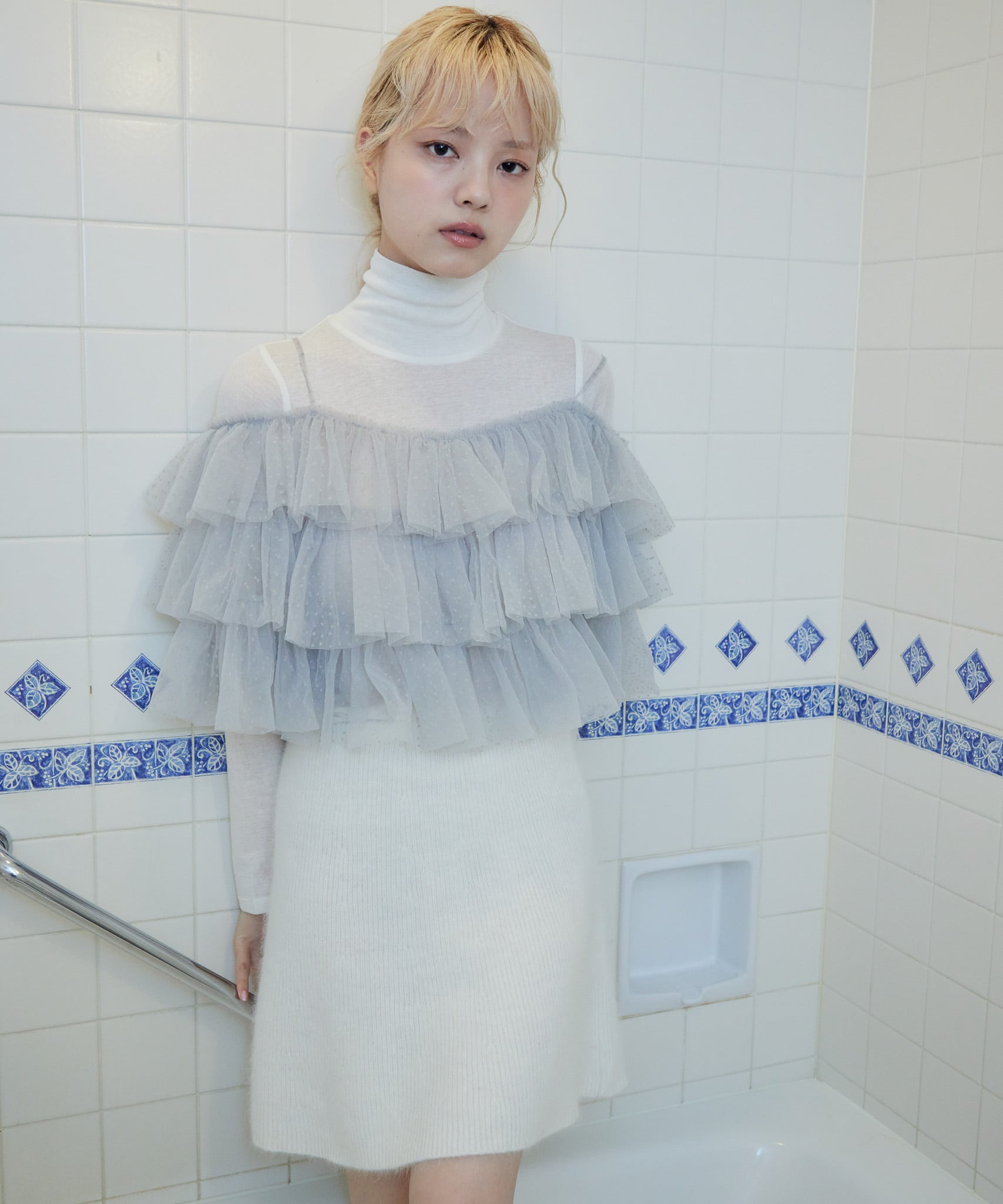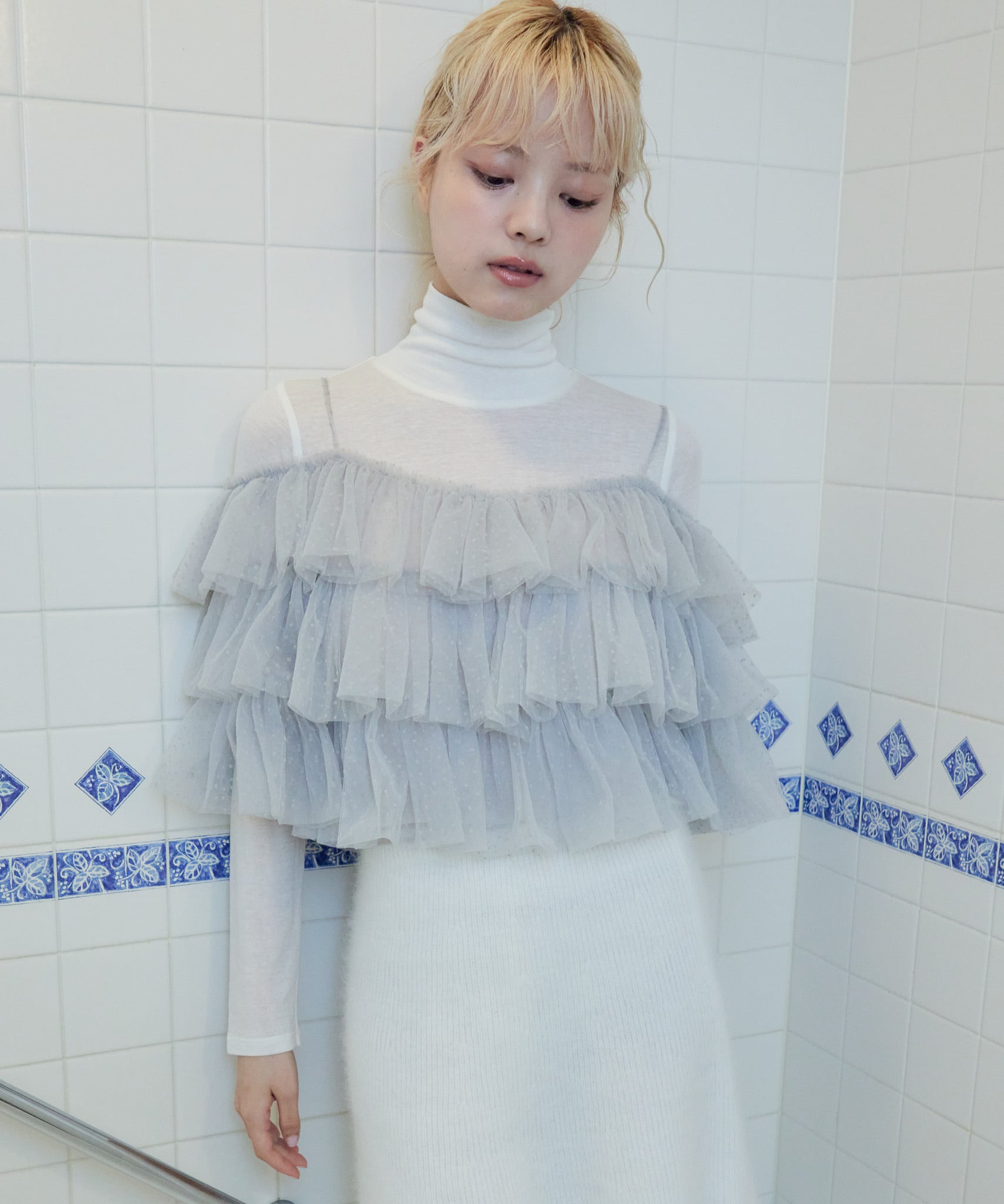 たっぷりのフリルのキャミソールと、タートルネックニットのセット。
