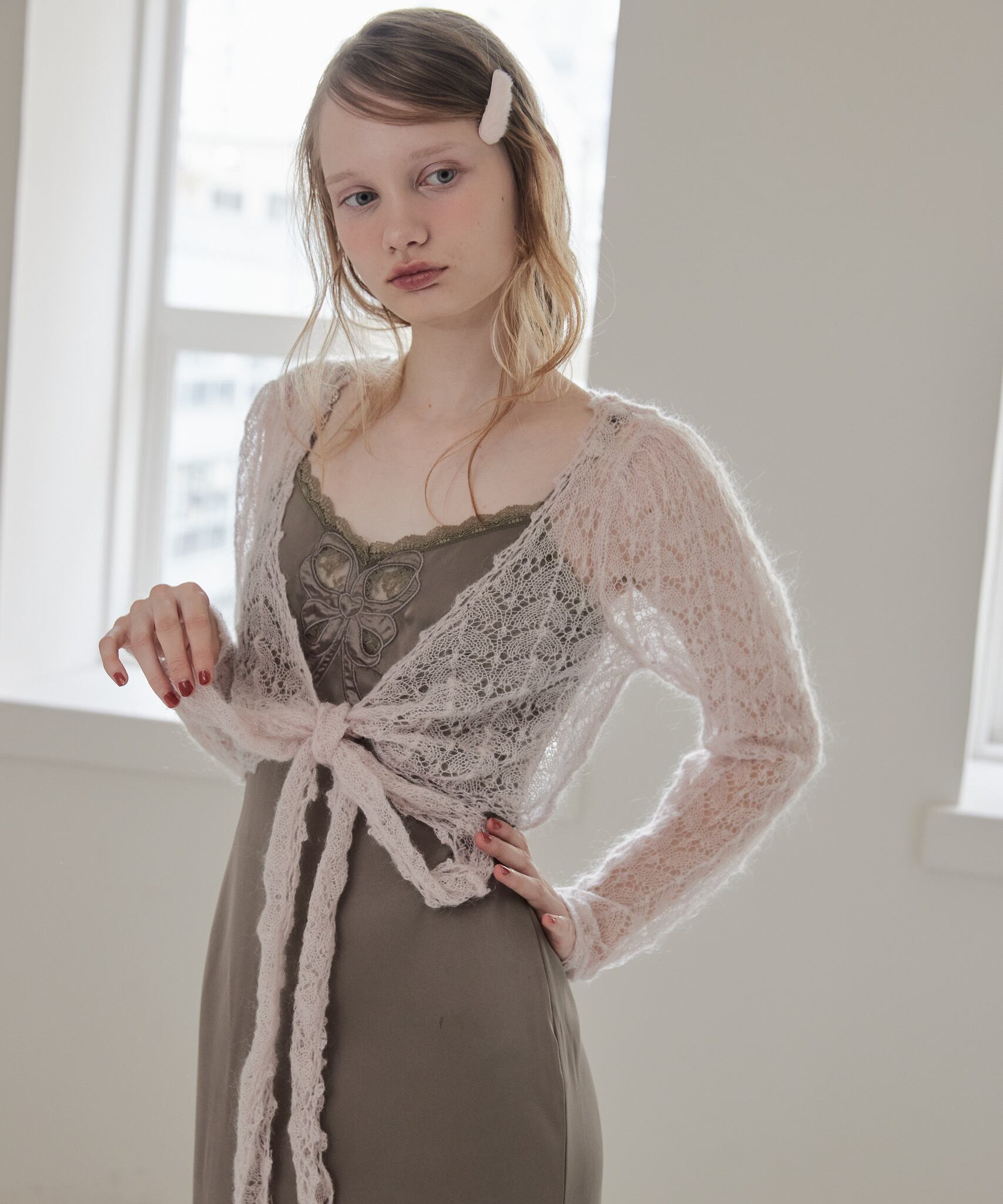 リボンの刺繡部分はレースで透け感があり、ロマンティックな印象に。