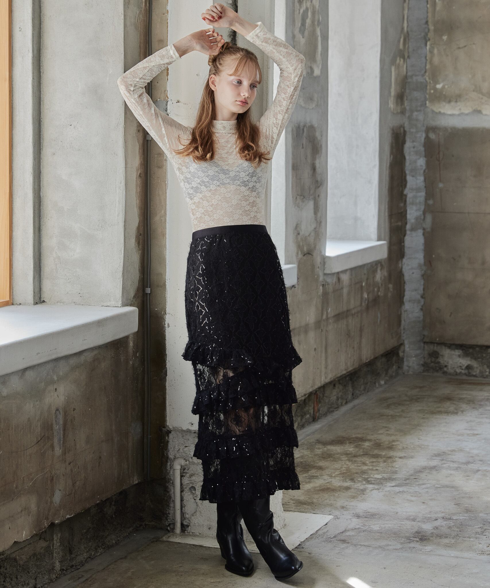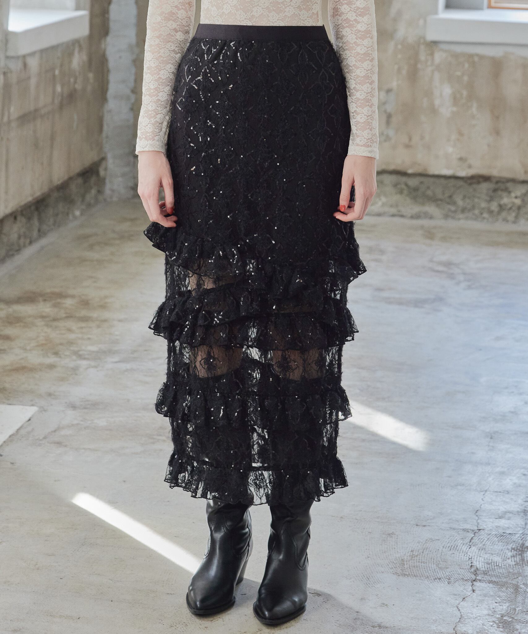 スパンコールと、シャギー感のあるレースでホリデーシーズンにぴったりなスカートです。