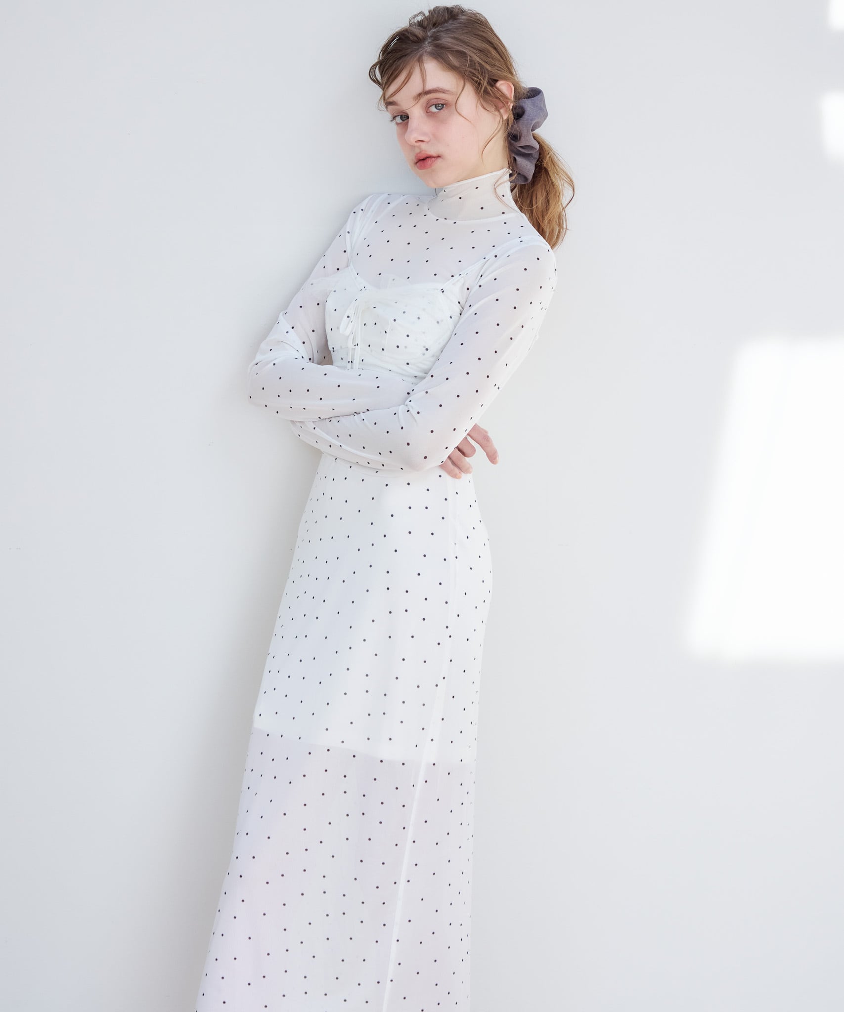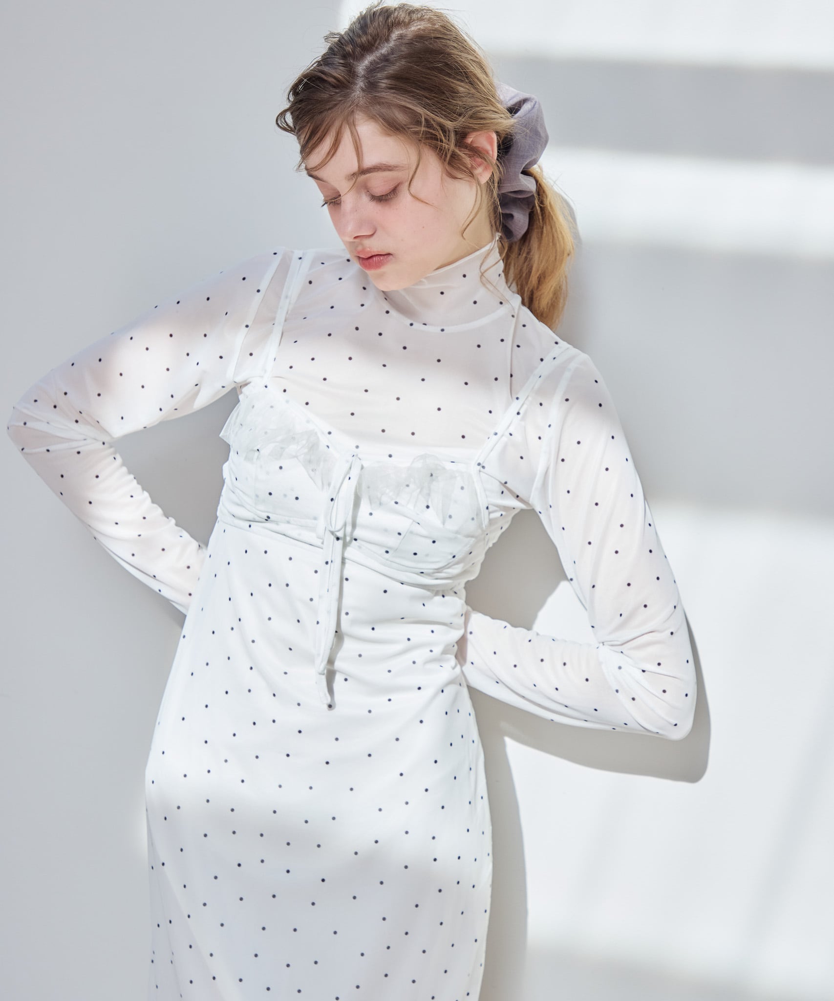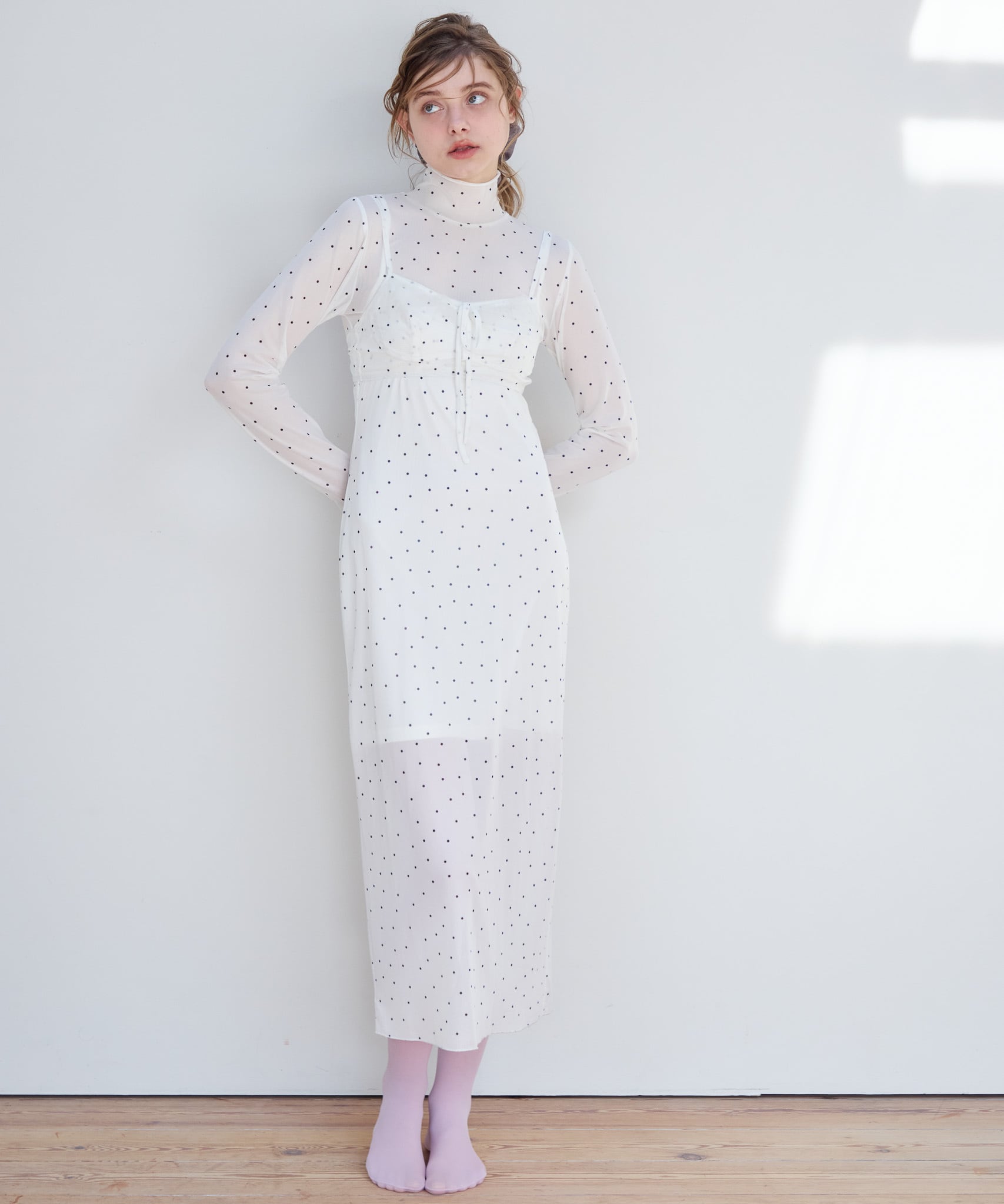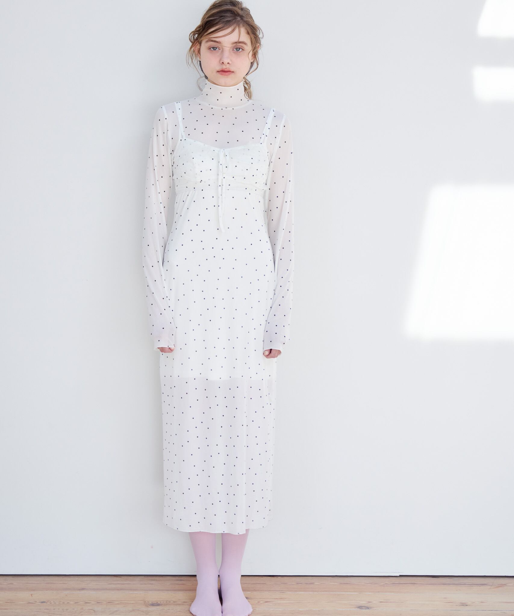インナーキャミソールがついているのでワンピース1枚でお召いただけます。