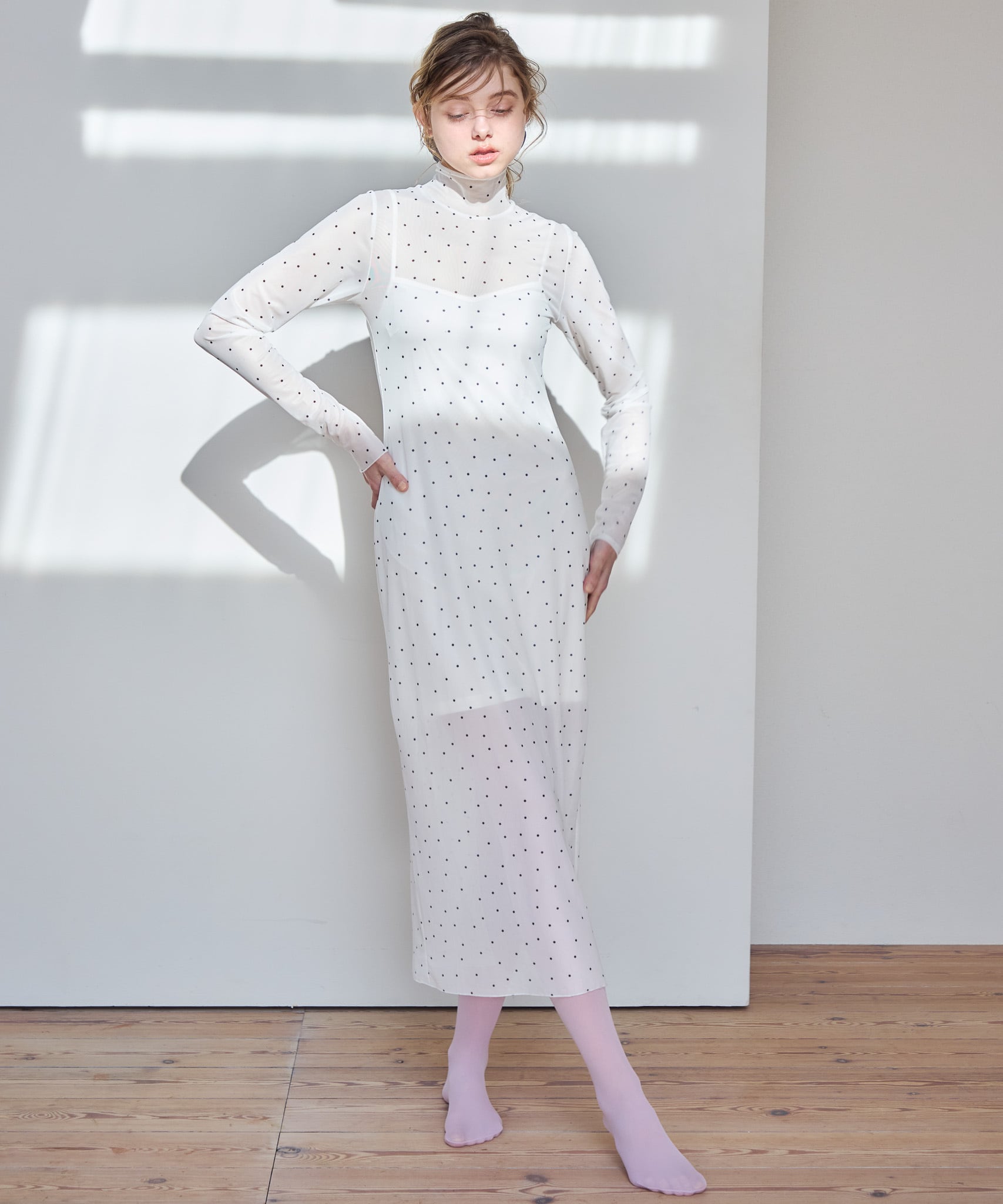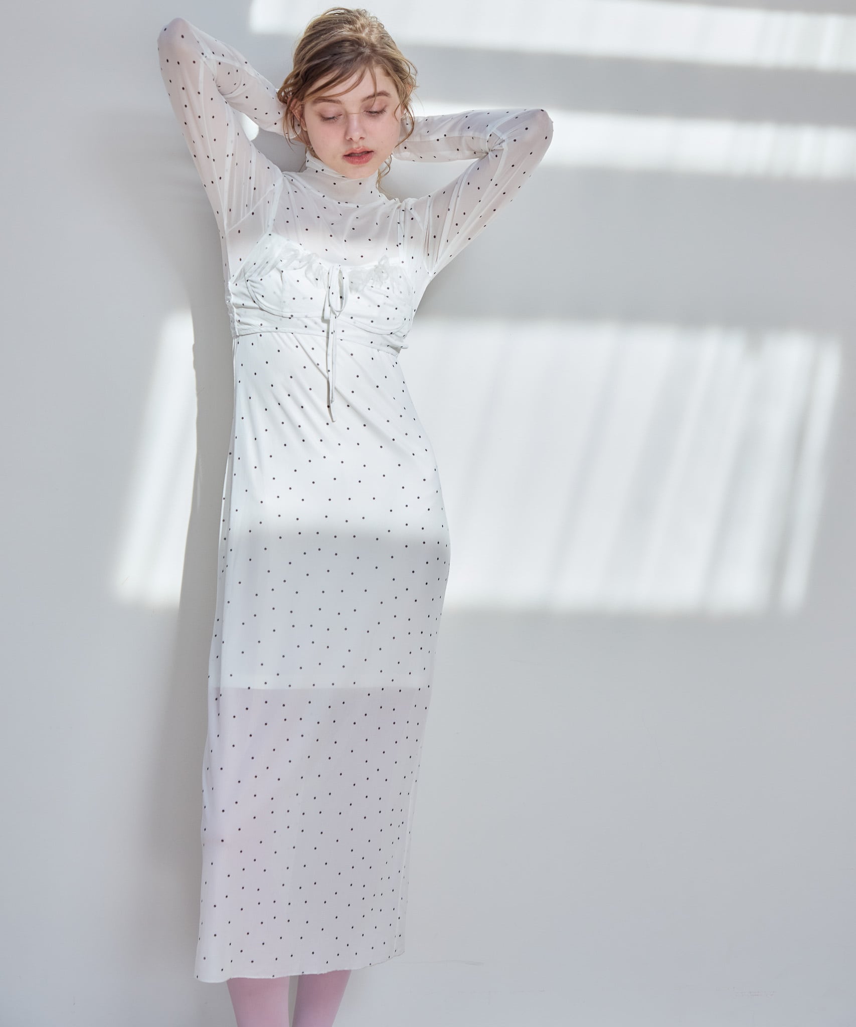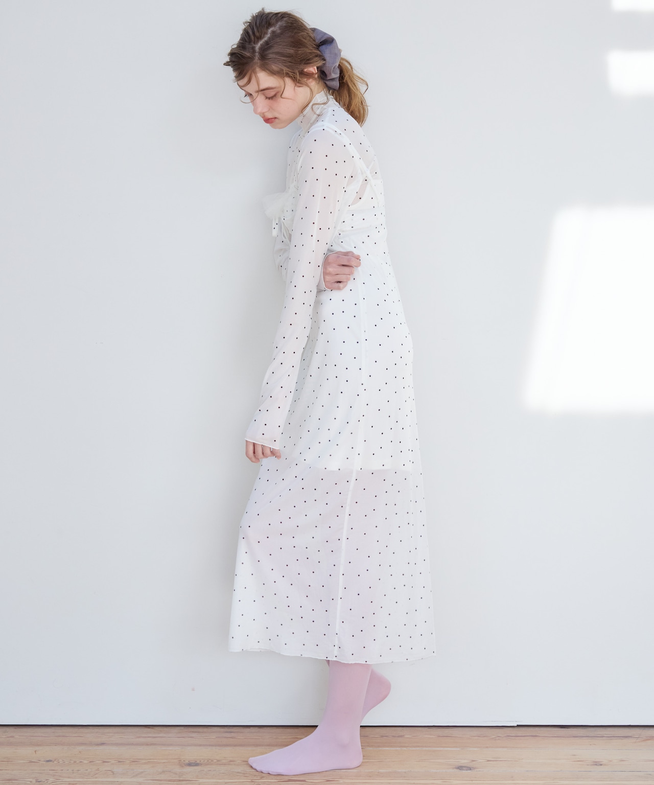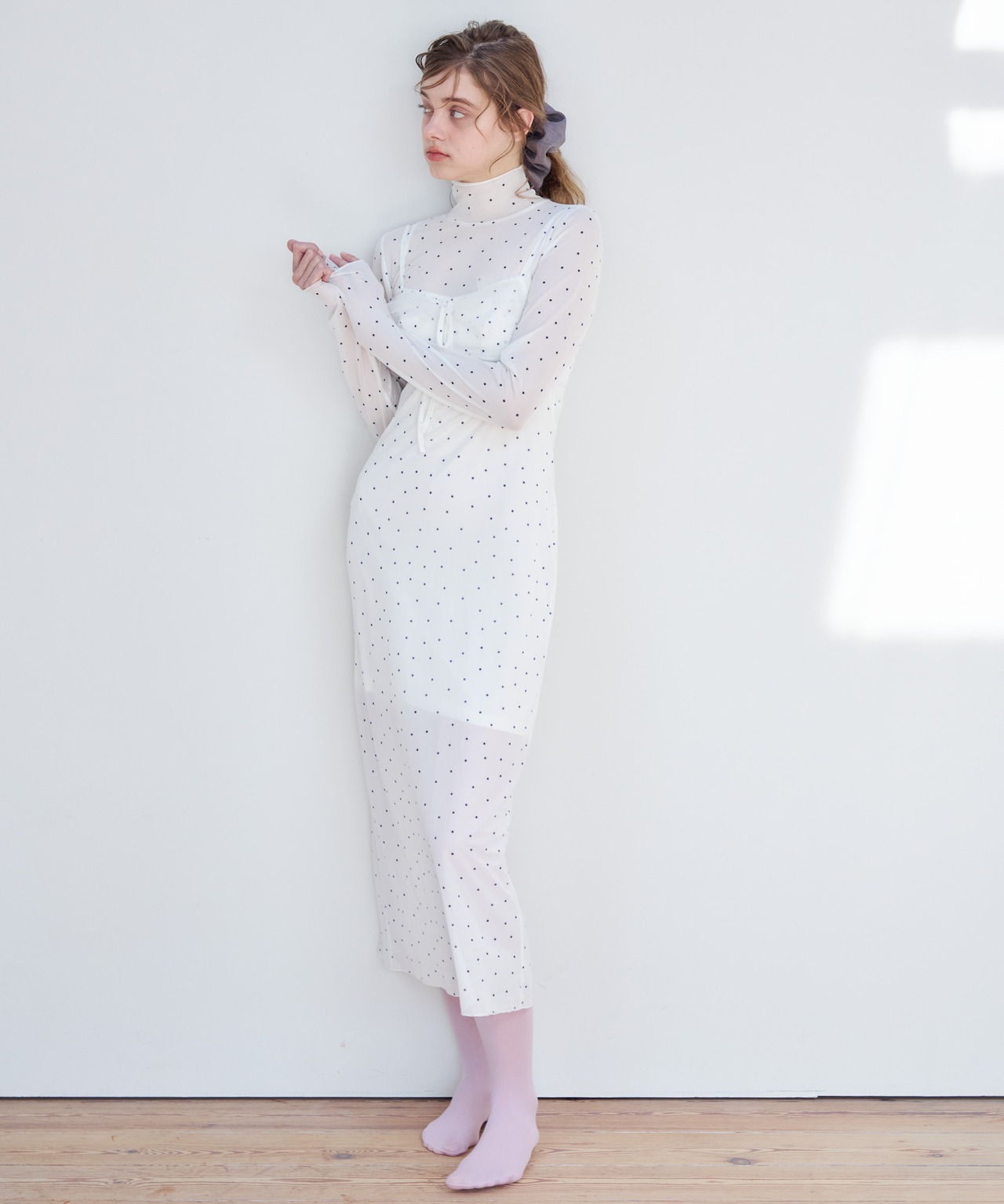 インナーキャミソールがついているのでワンピース1枚でお召いただけます。
