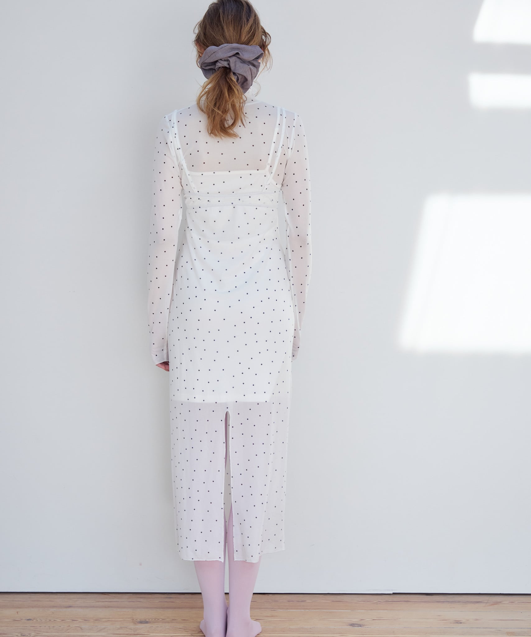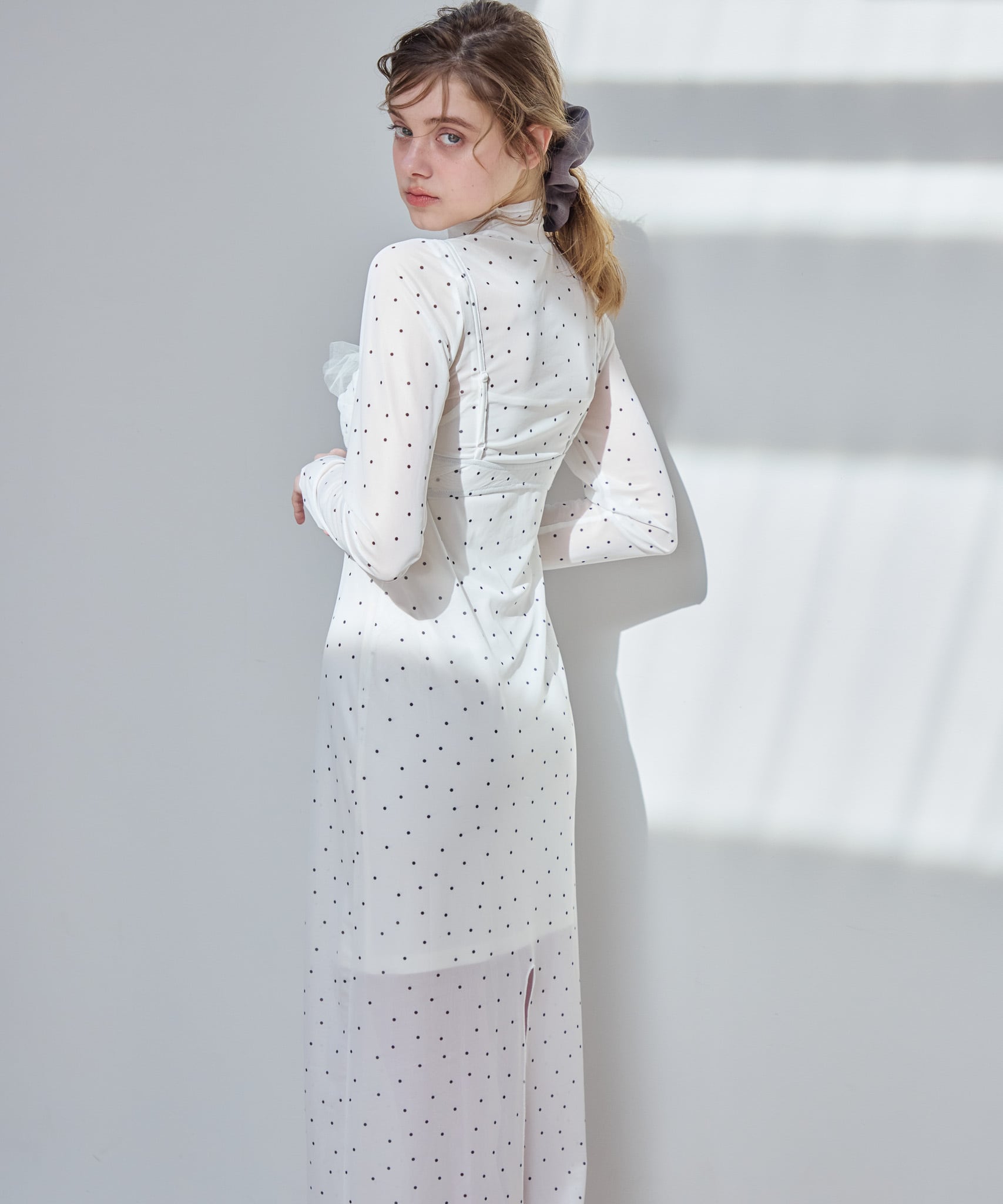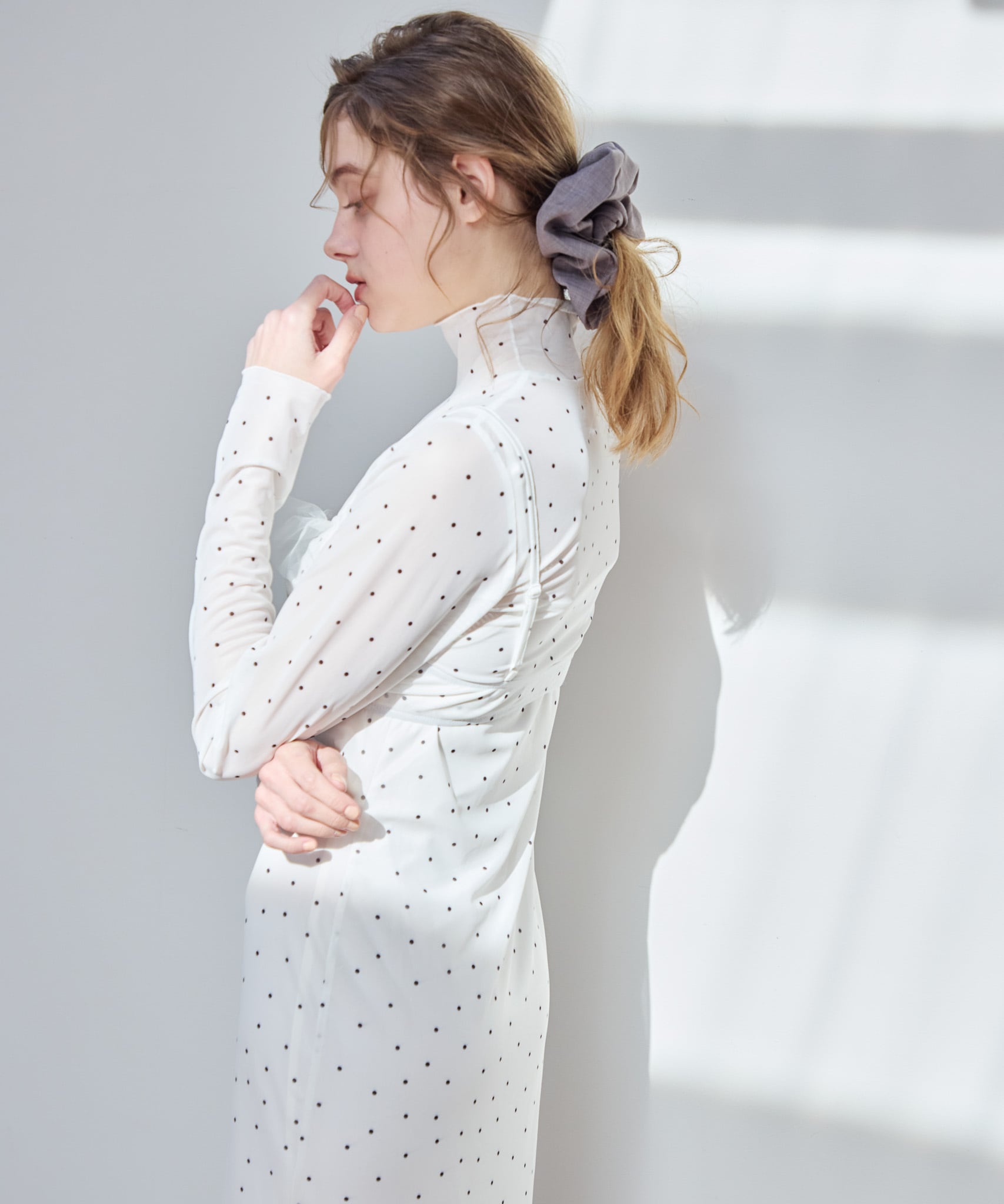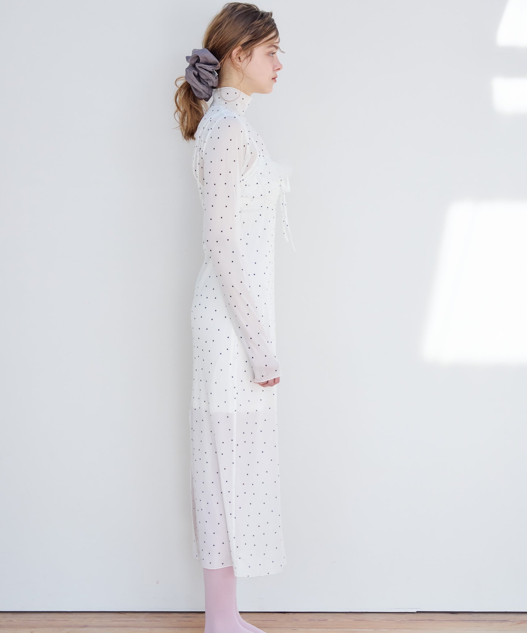 インナーキャミソールがついているのでワンピース1枚でお召いただけます。