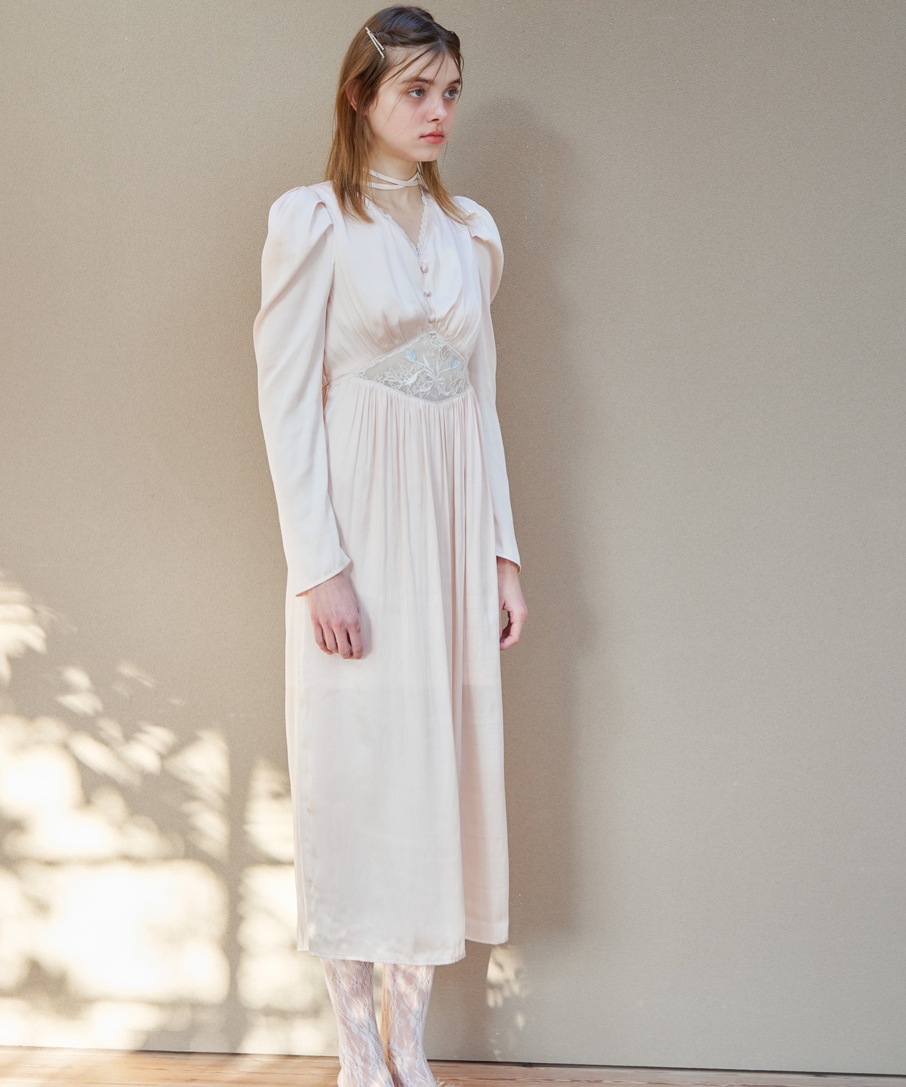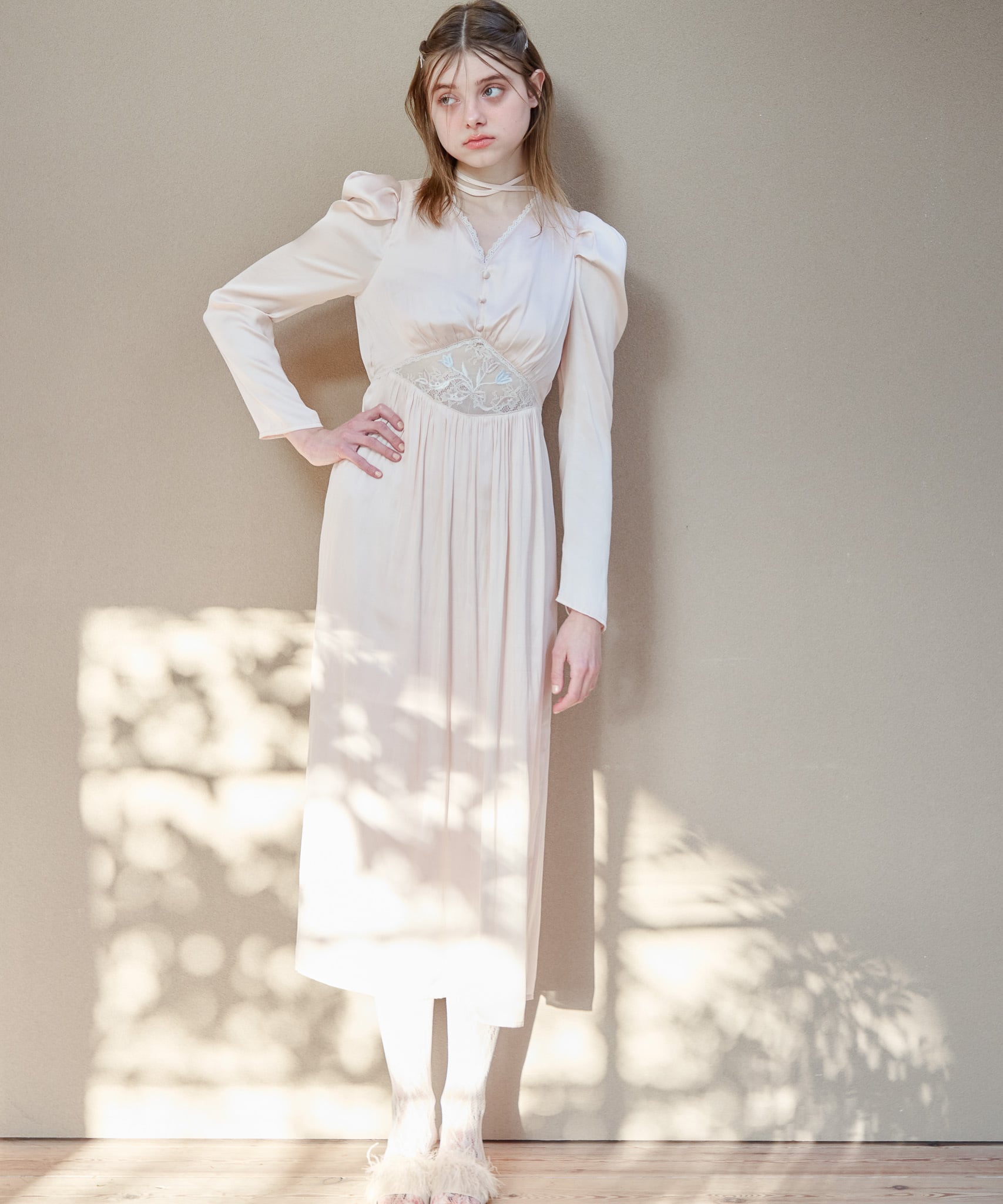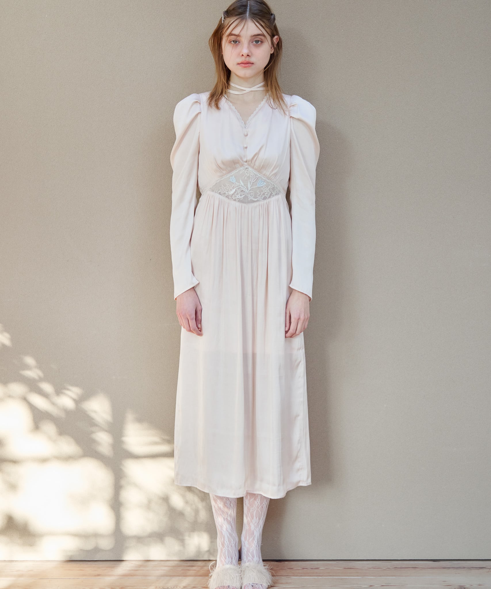 おなか部分にチューリップの刺繍を施したノスタルジックなワンピース。