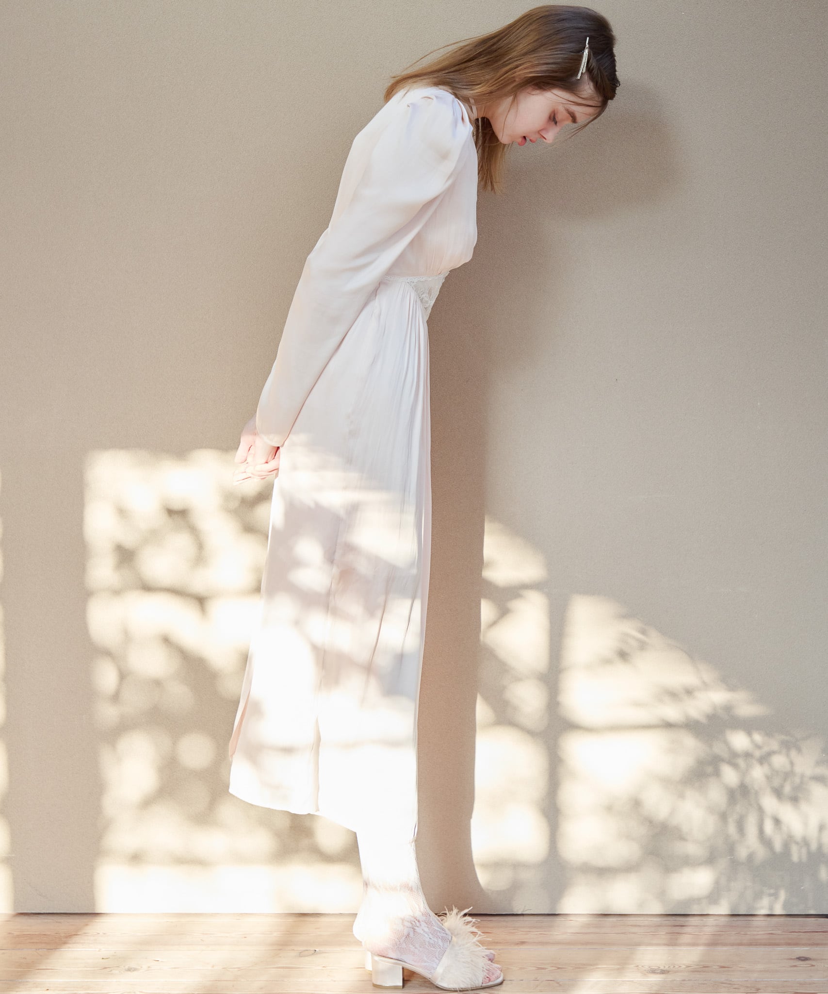 首元のリボンは前でも後ろでも結んでいただけ、トレンド感が増します。