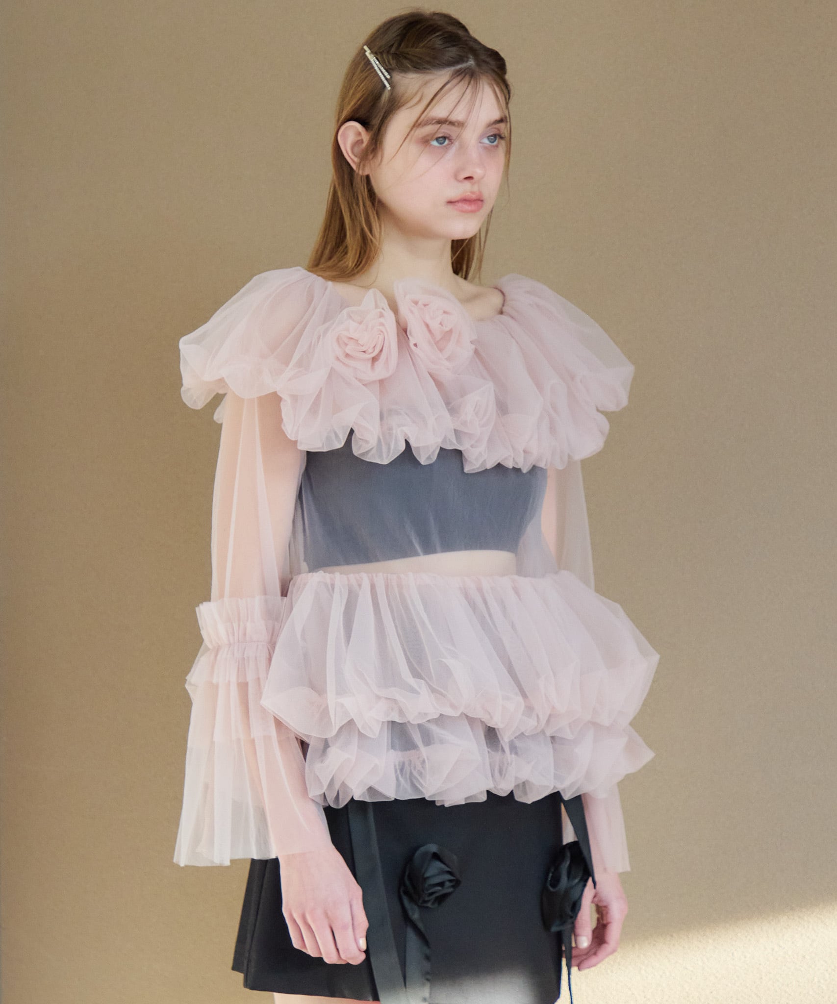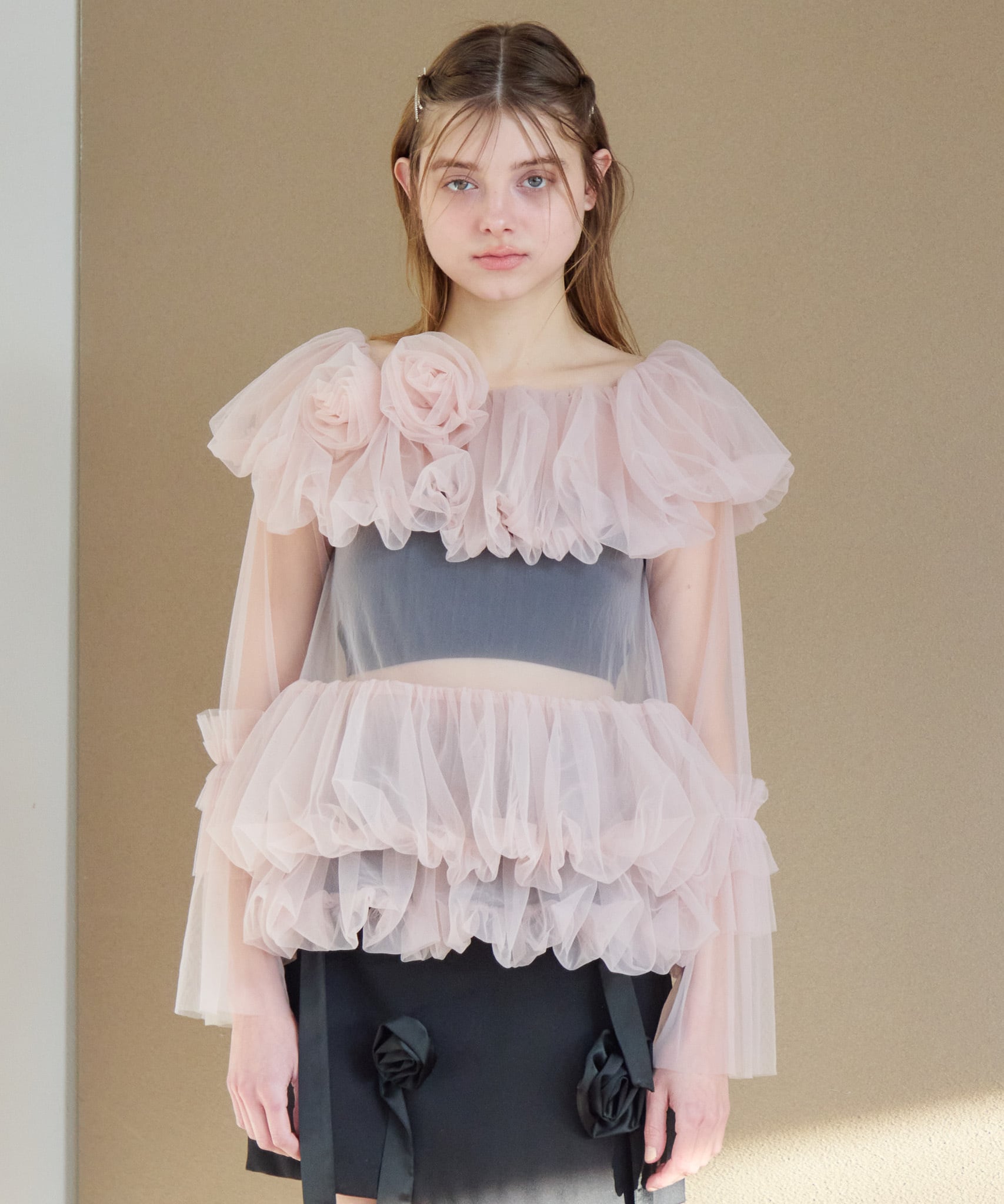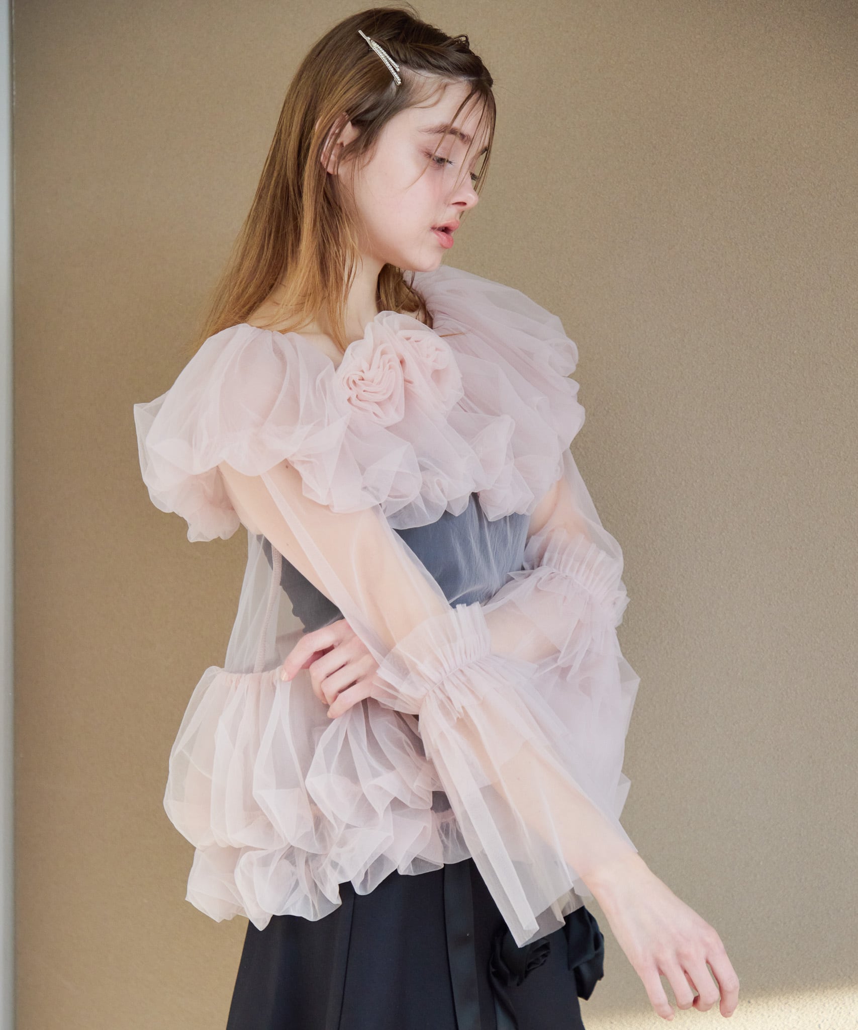 デコルテに薔薇のモチーフのついたチュールのブラウス。
