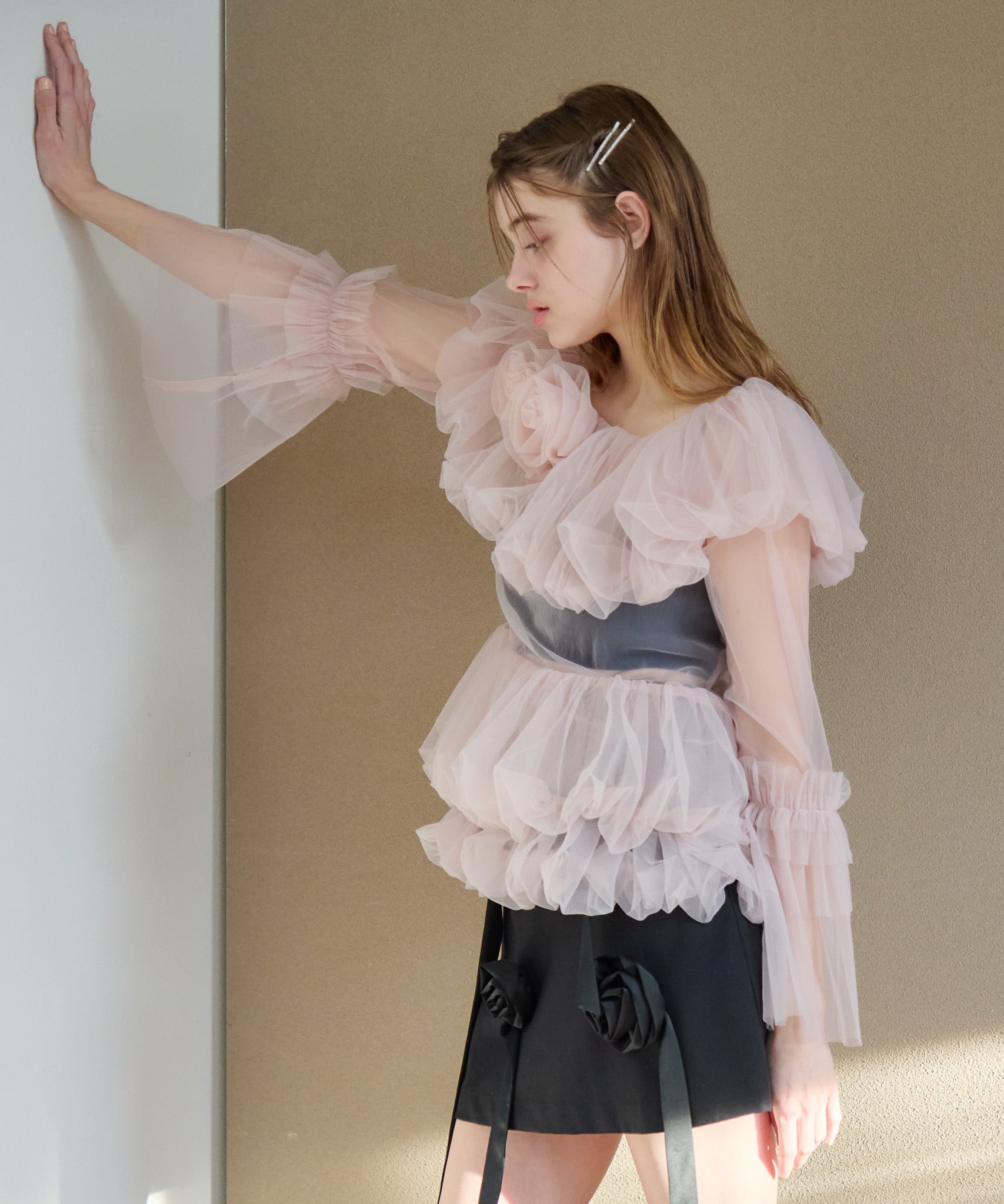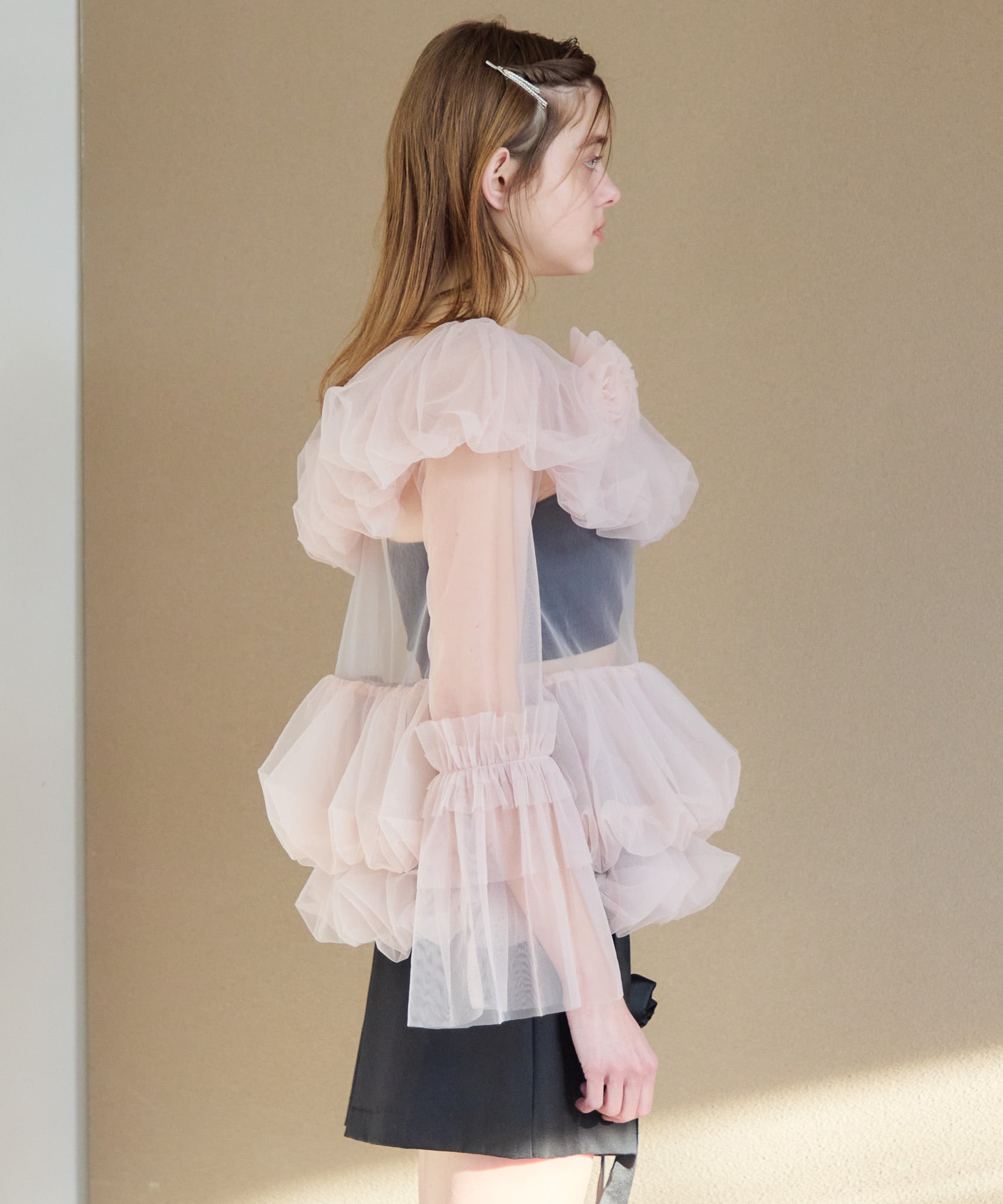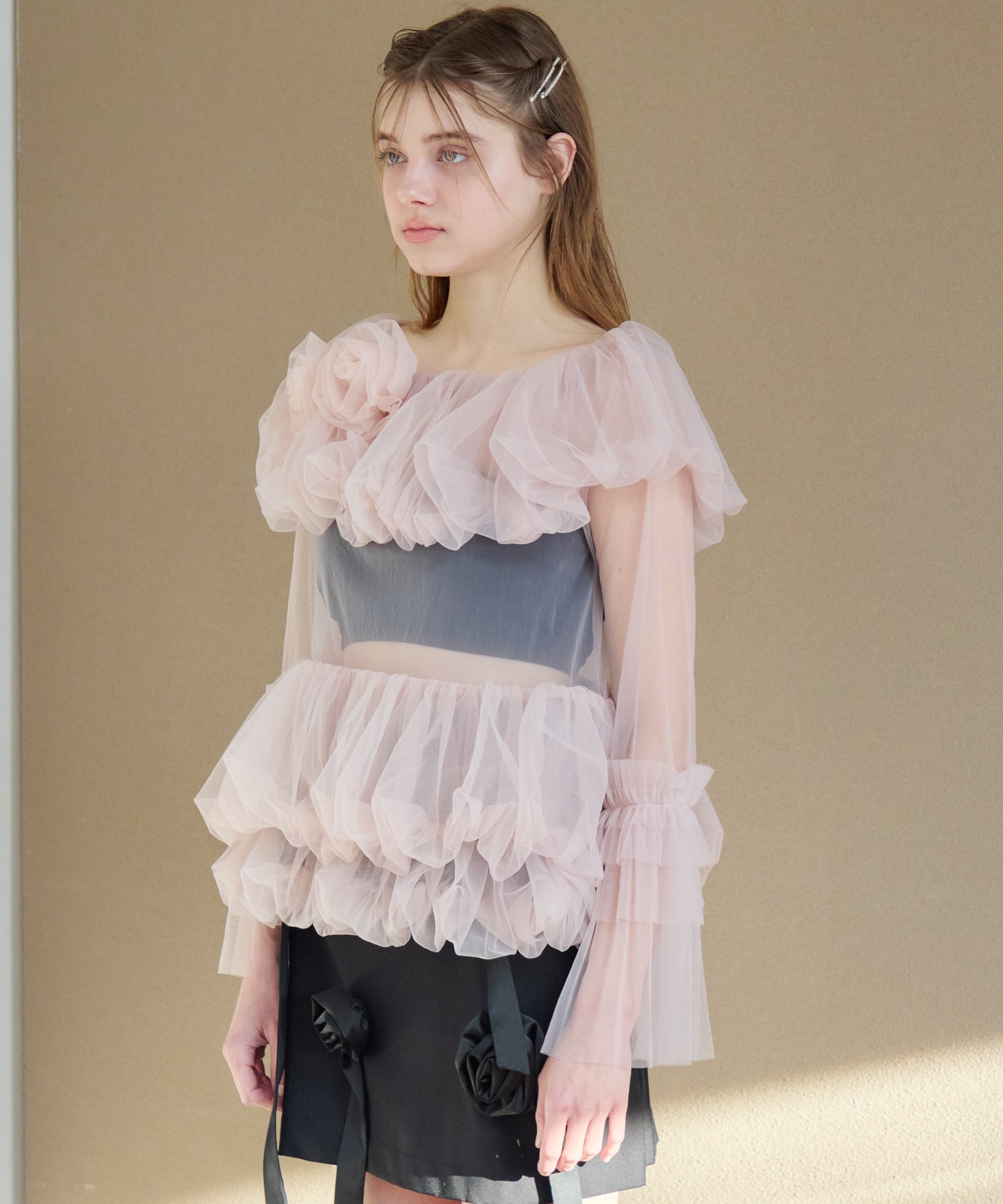 デコルテに薔薇のモチーフのついたチュールのブラウス。