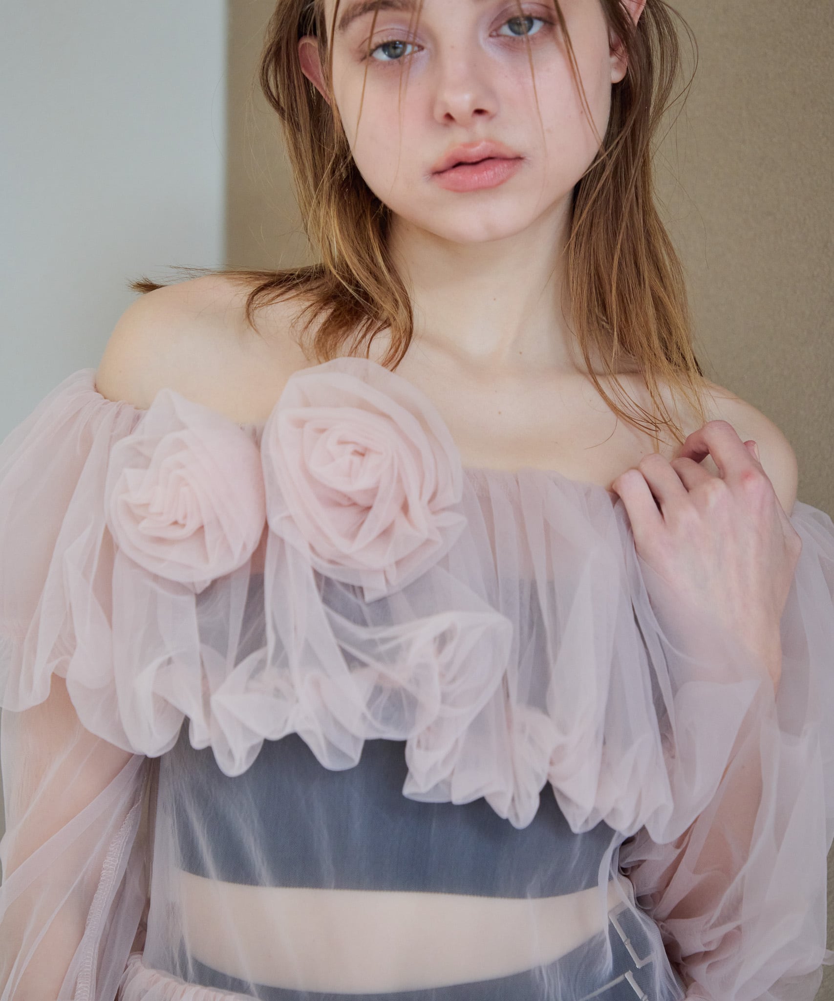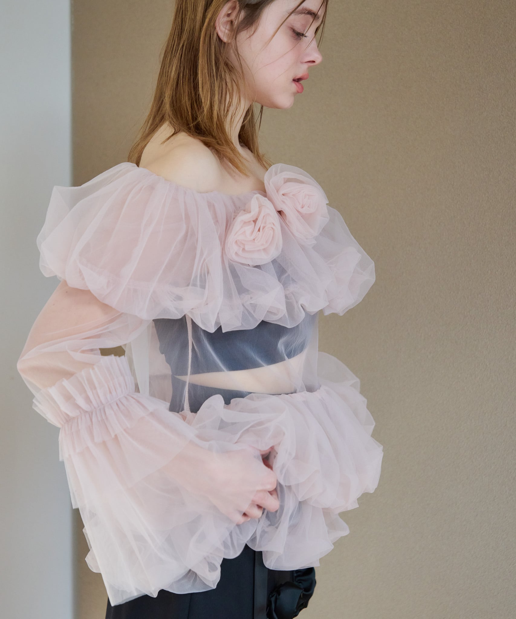 ローズチュールオフショルブラウス