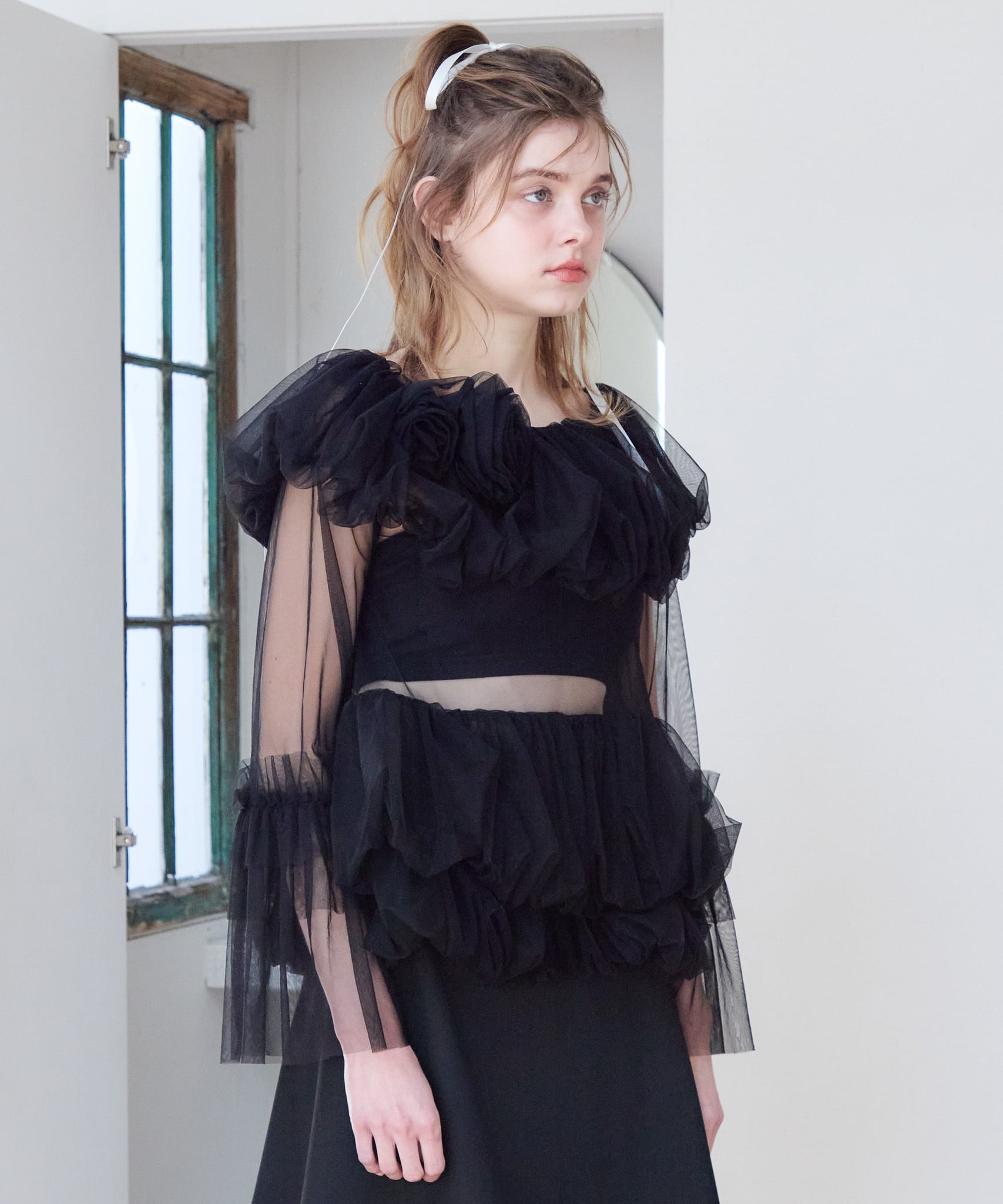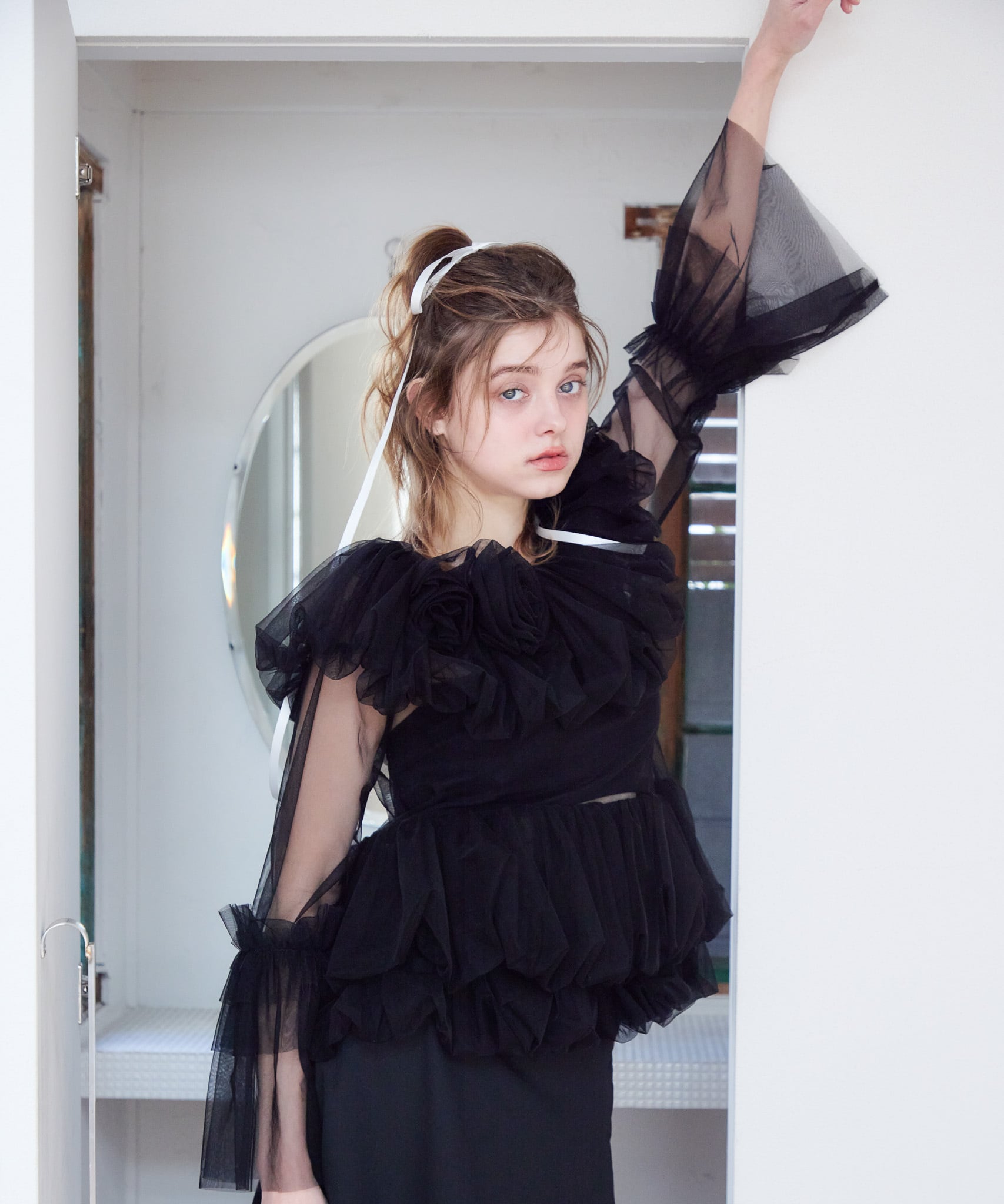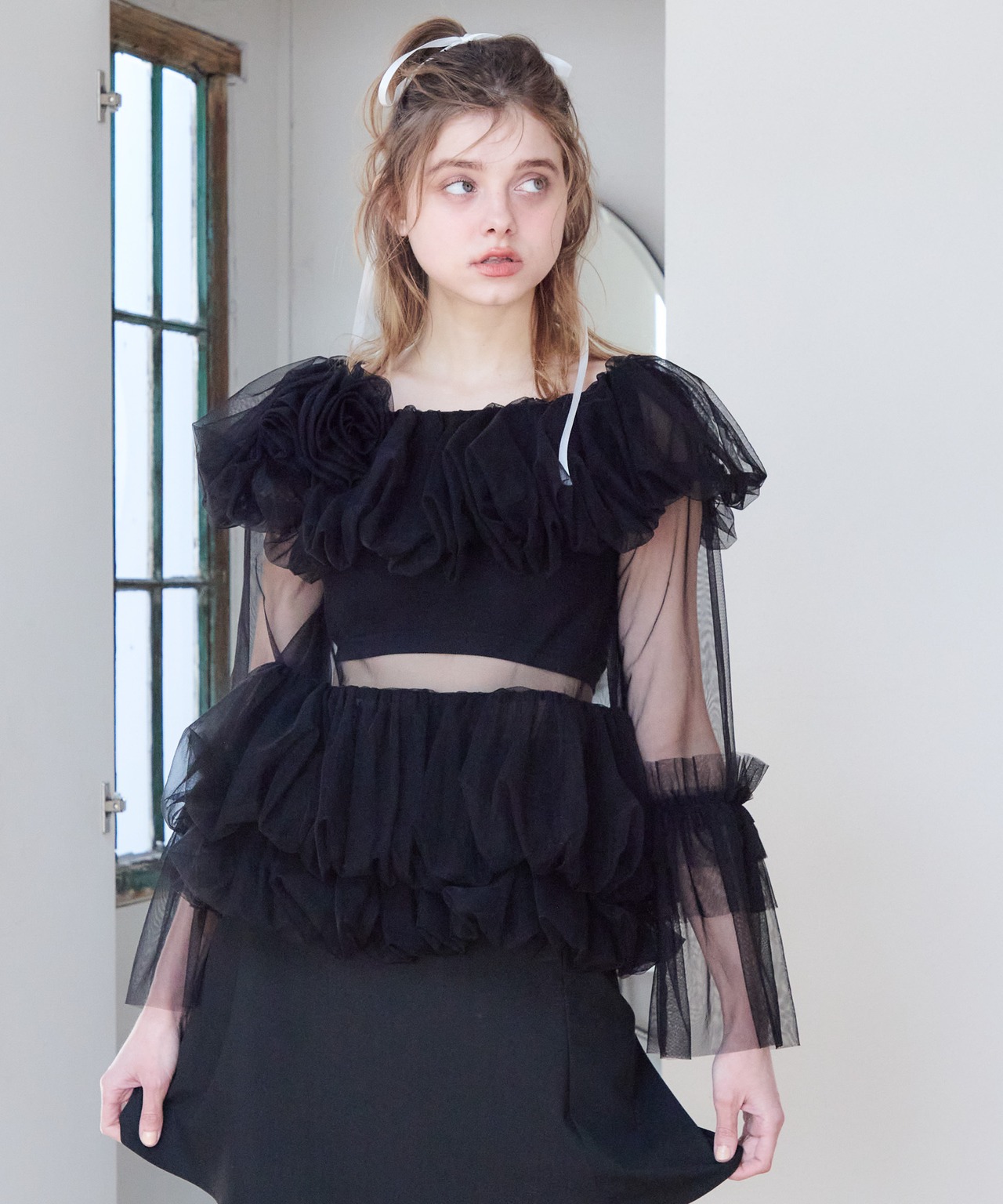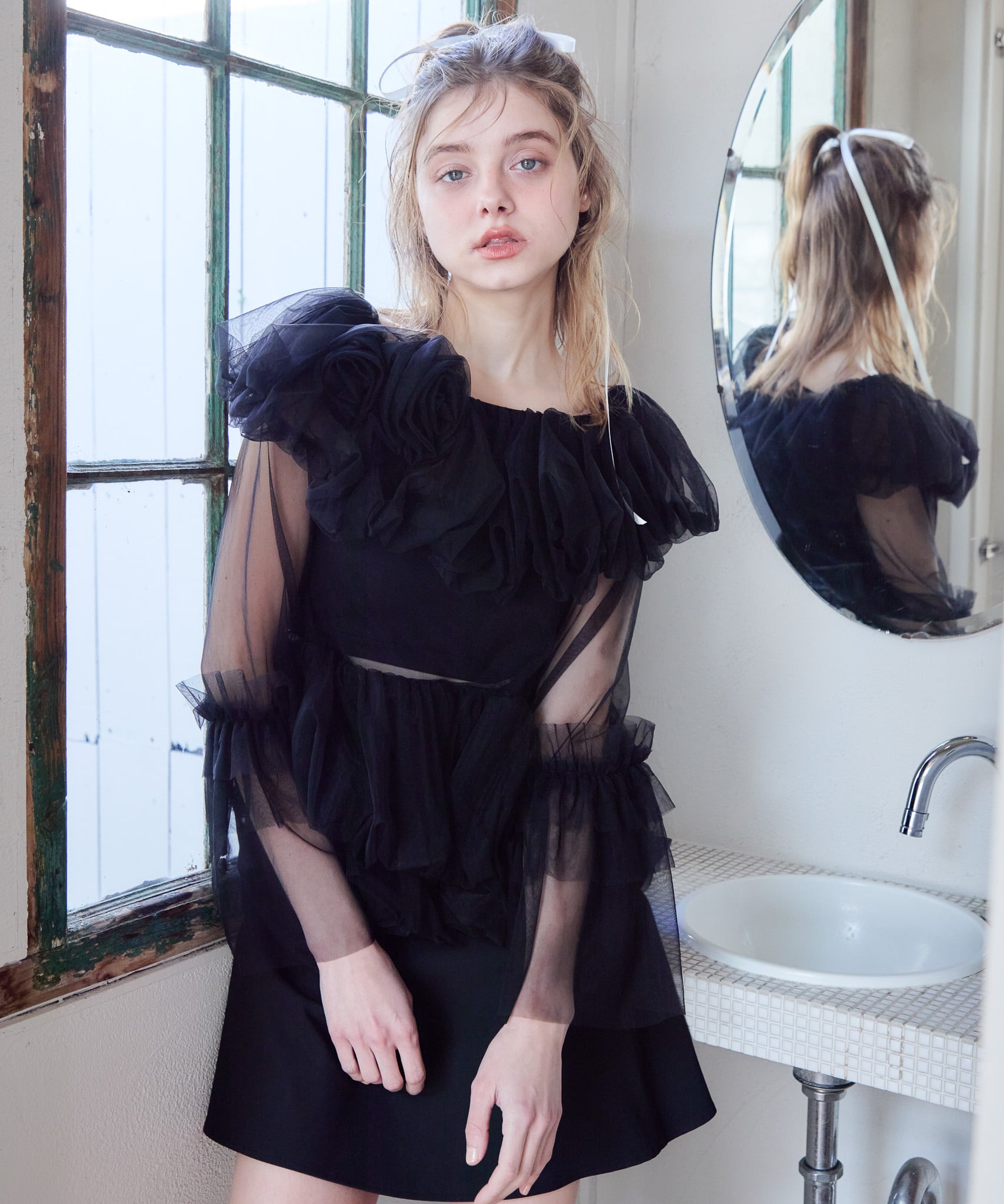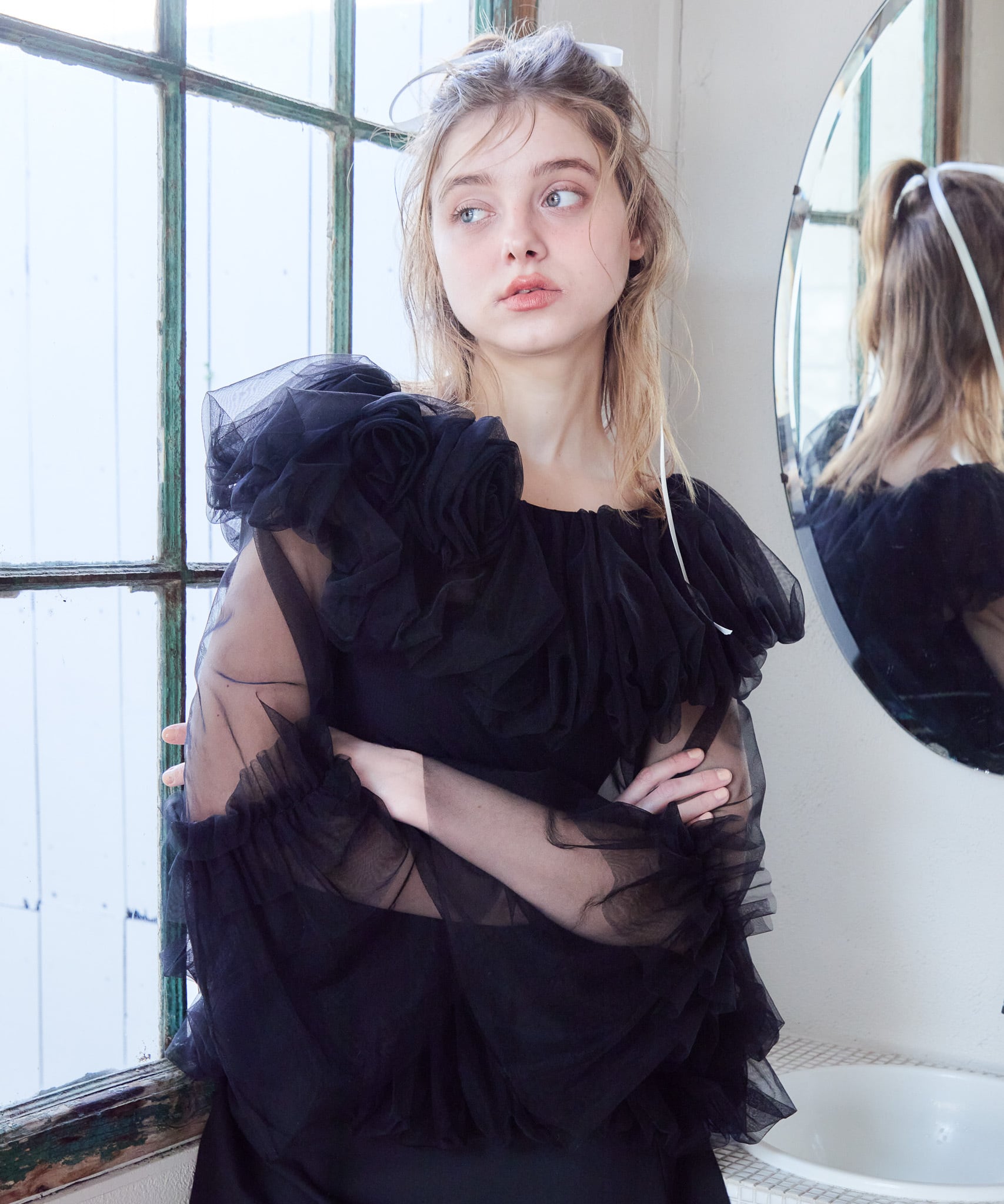 デコルテに薔薇のモチーフのついたチュールのブラウス。