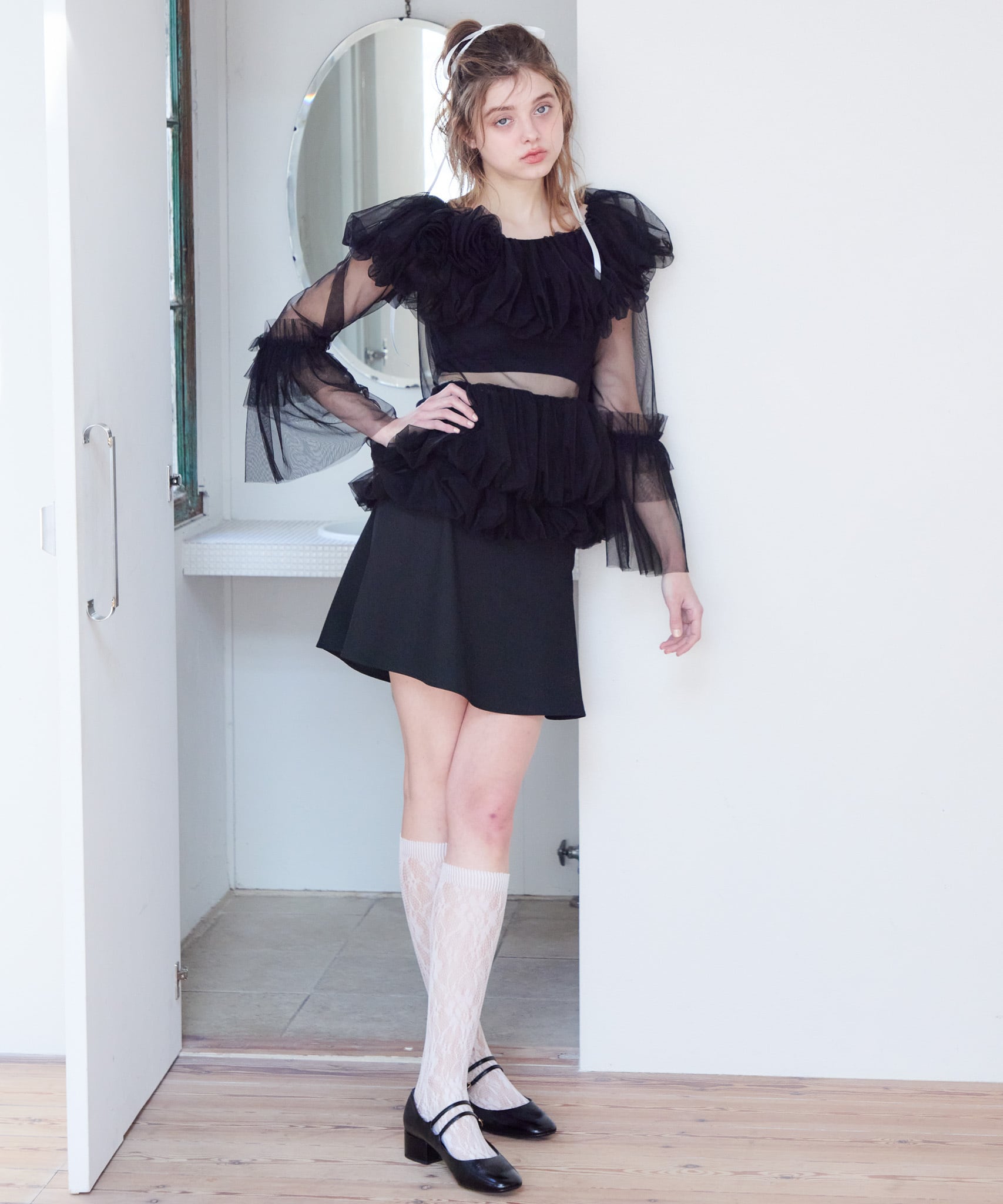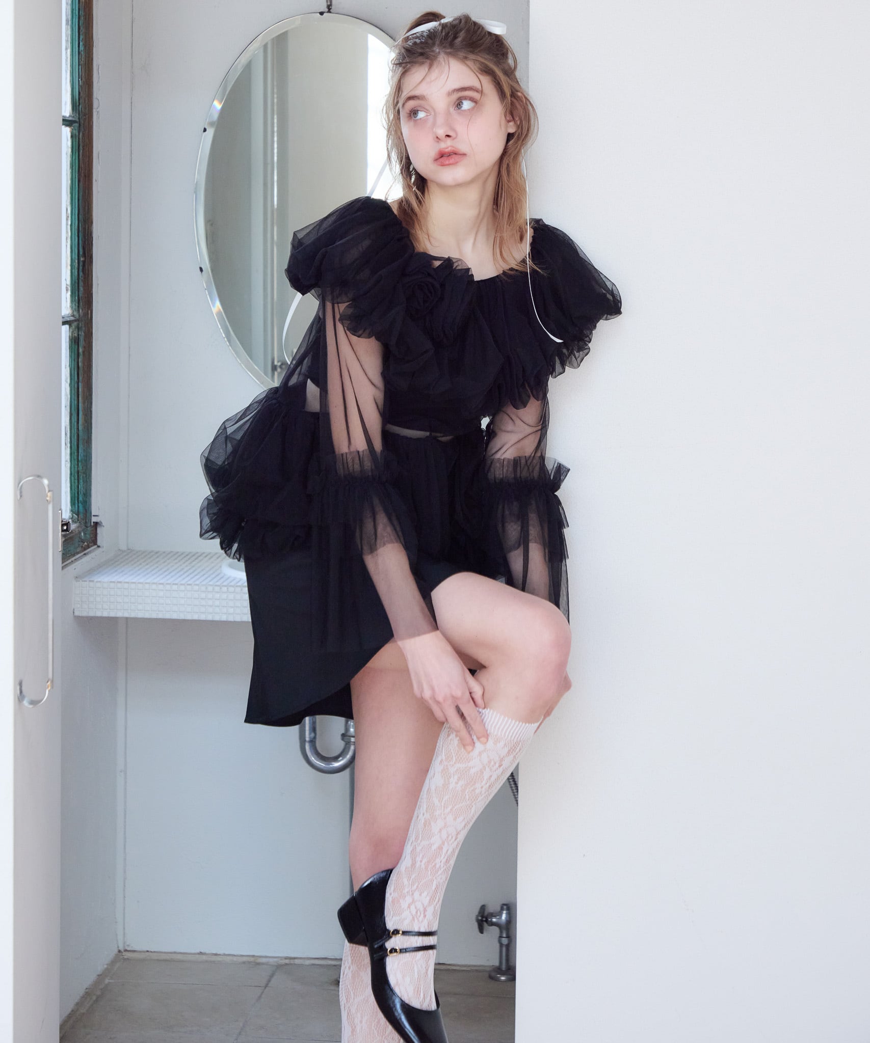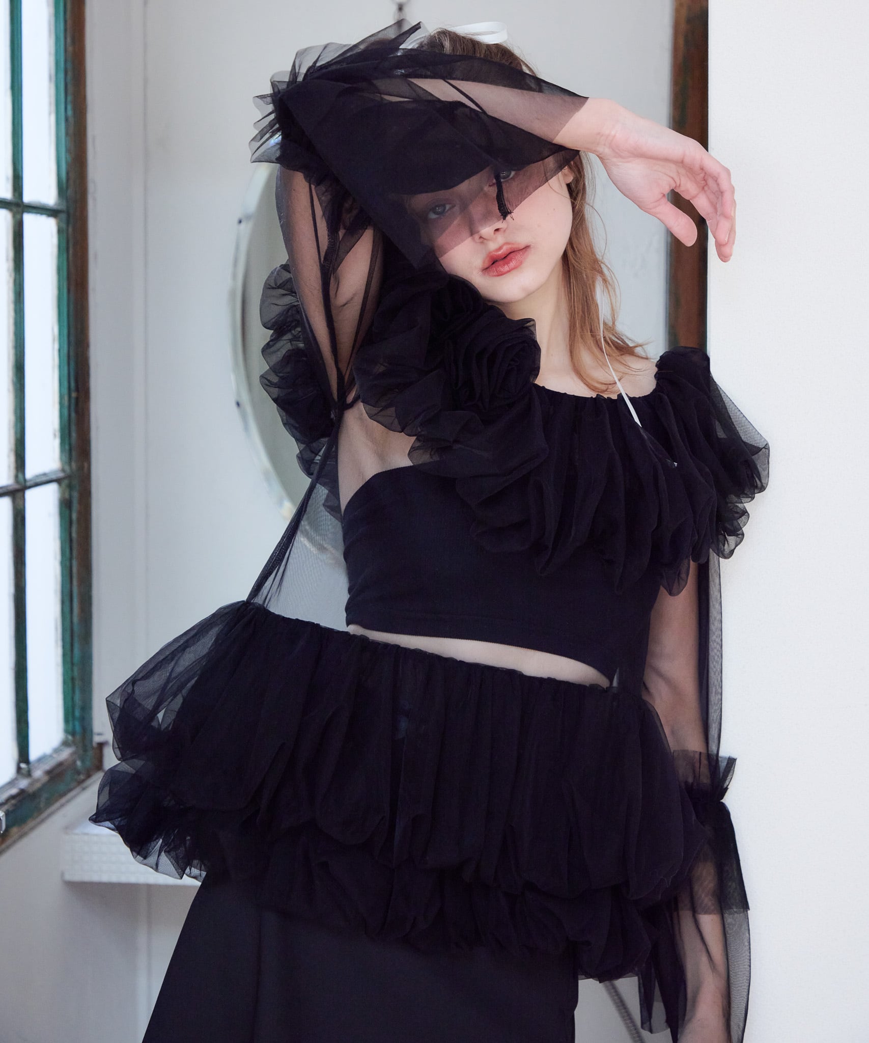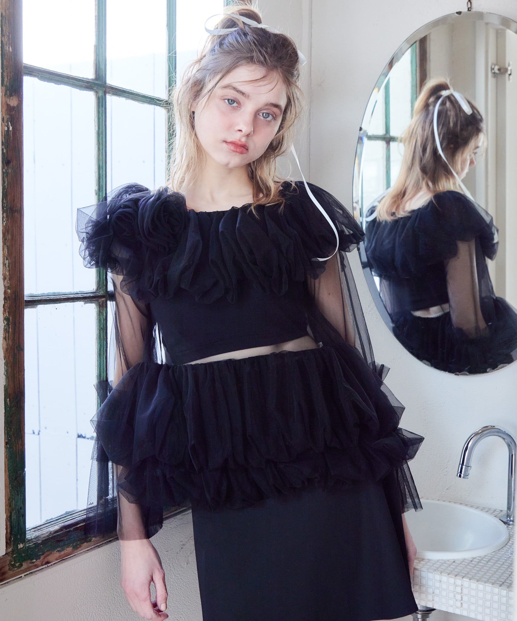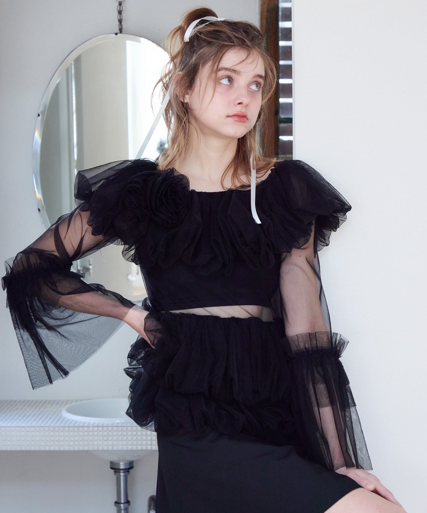 デコルテに薔薇のモチーフのついたチュールのブラウス。