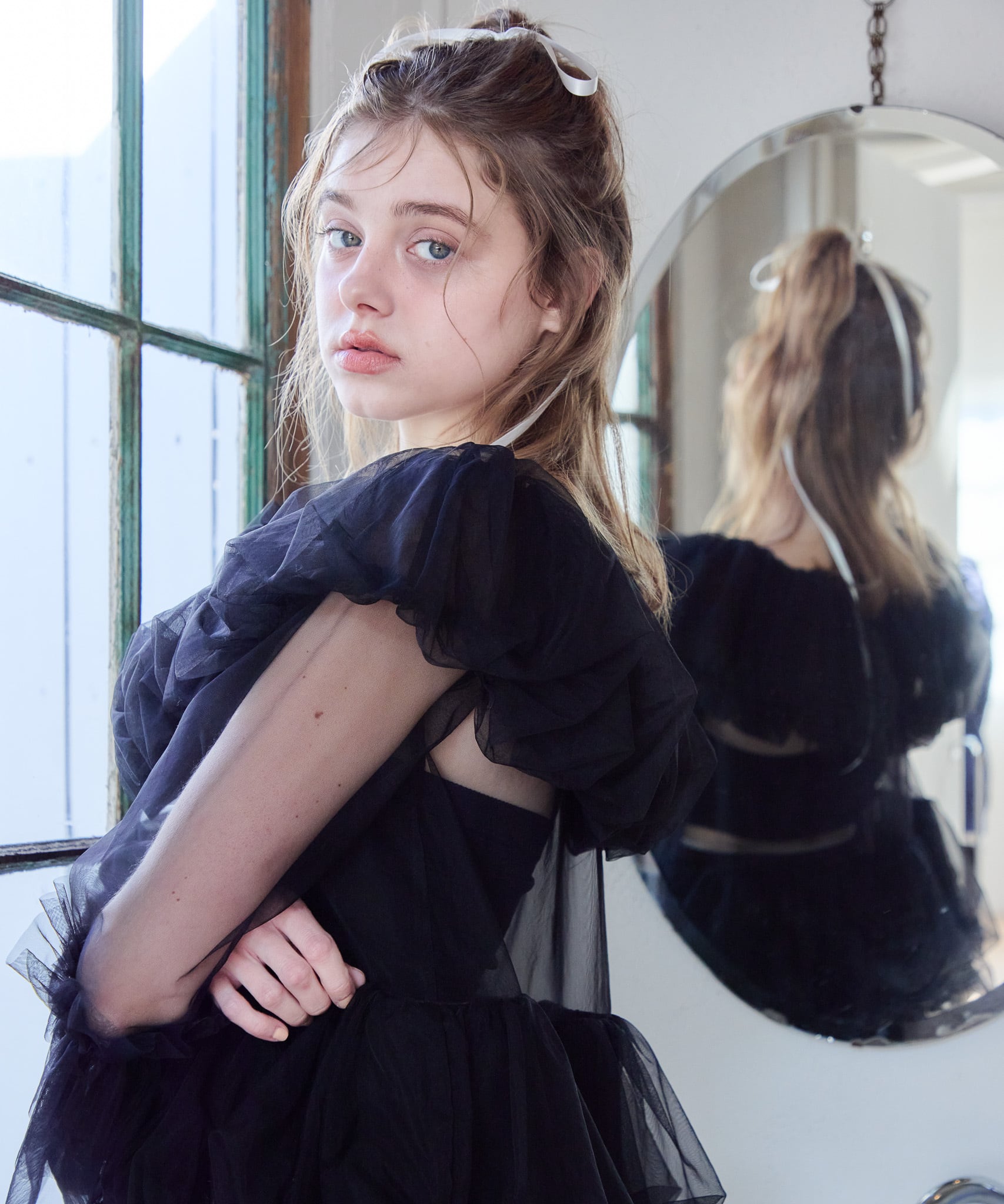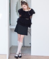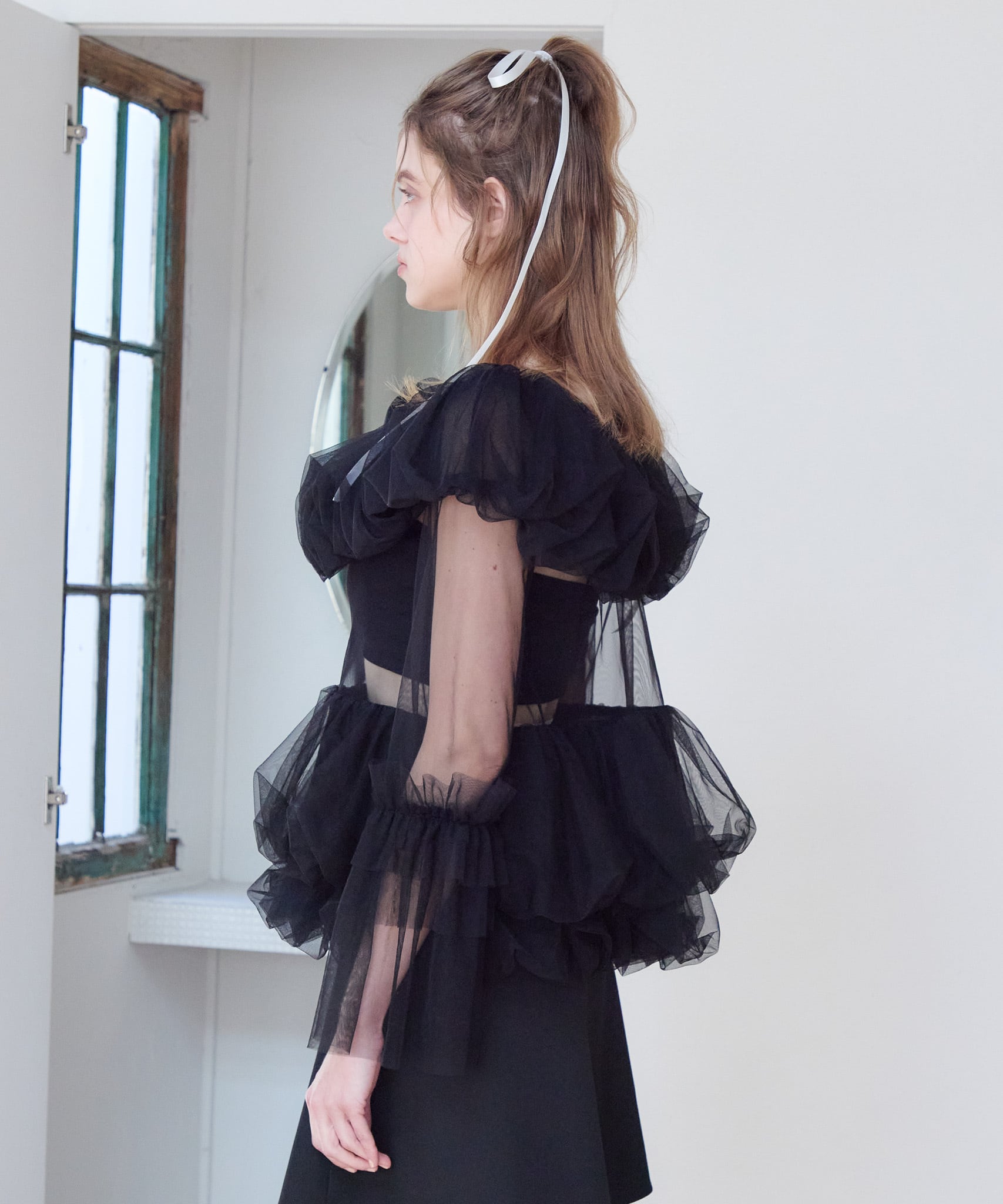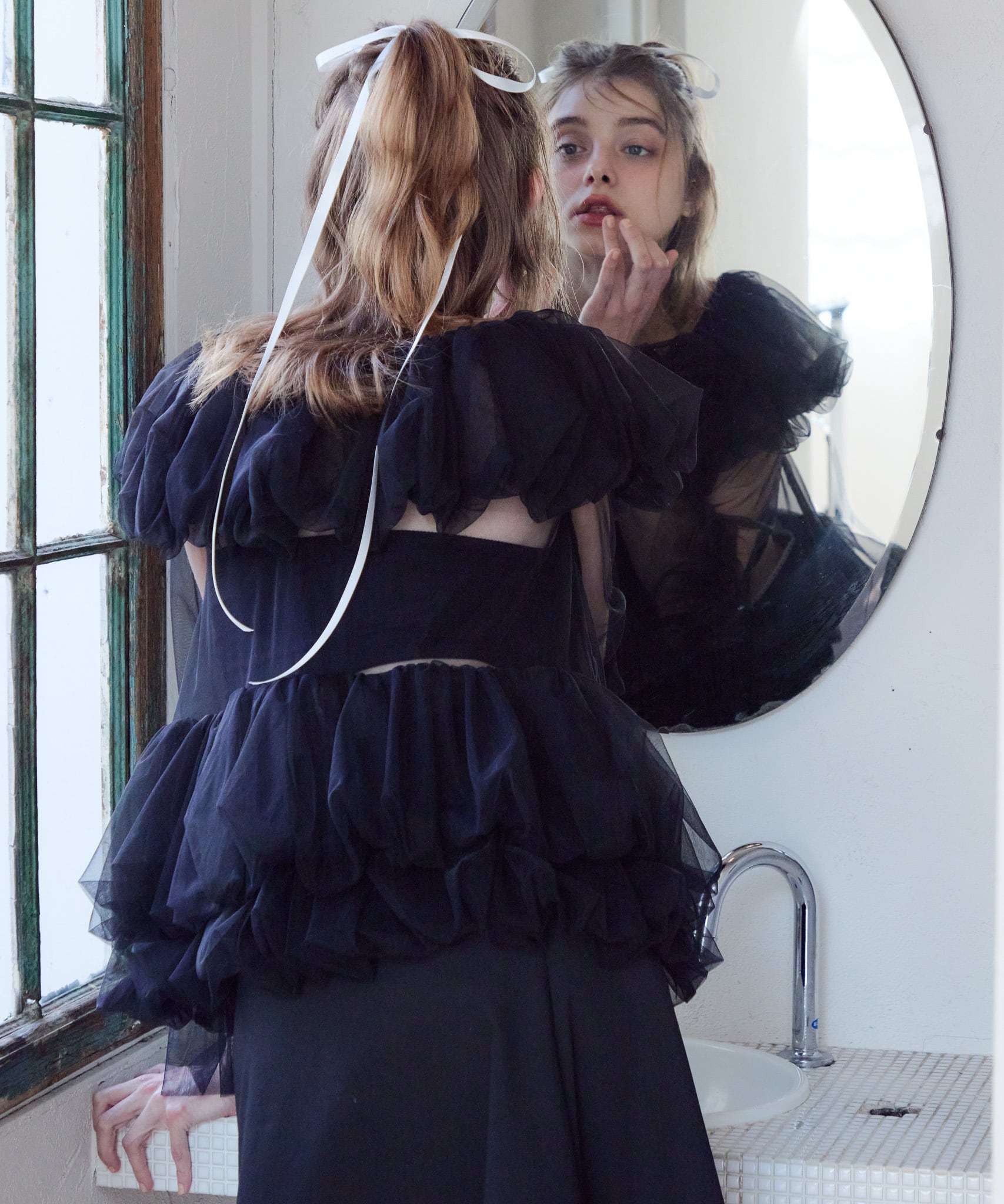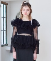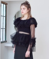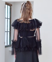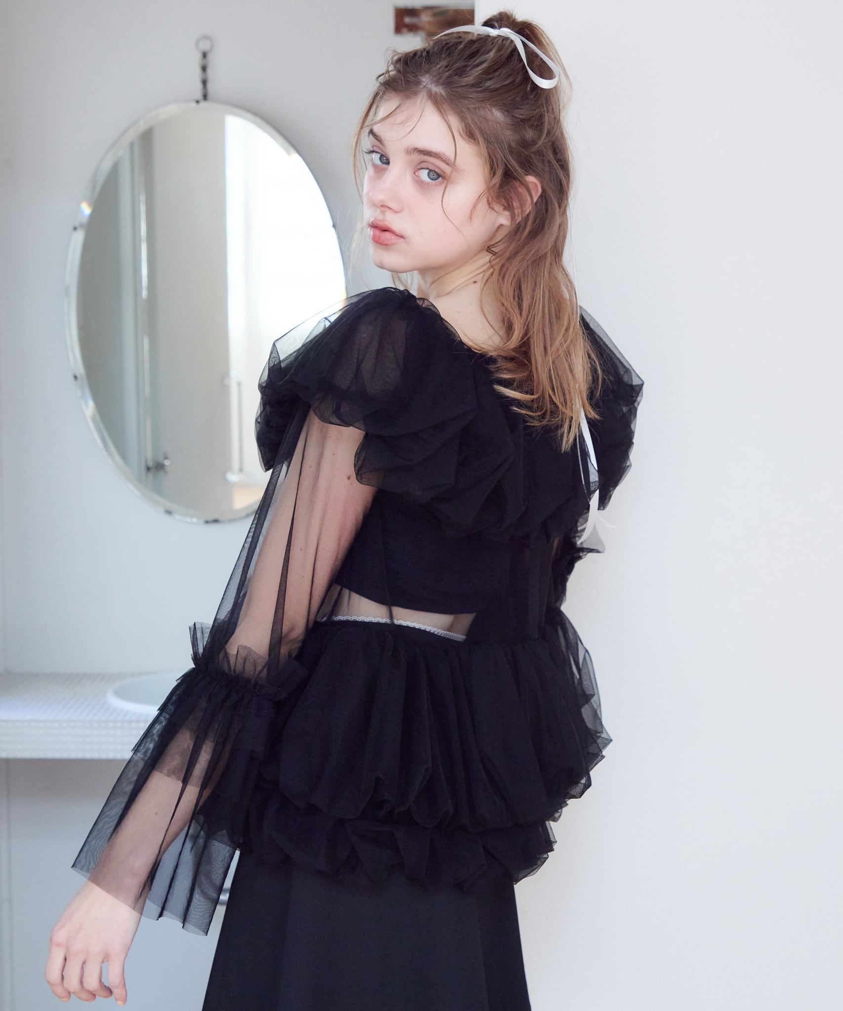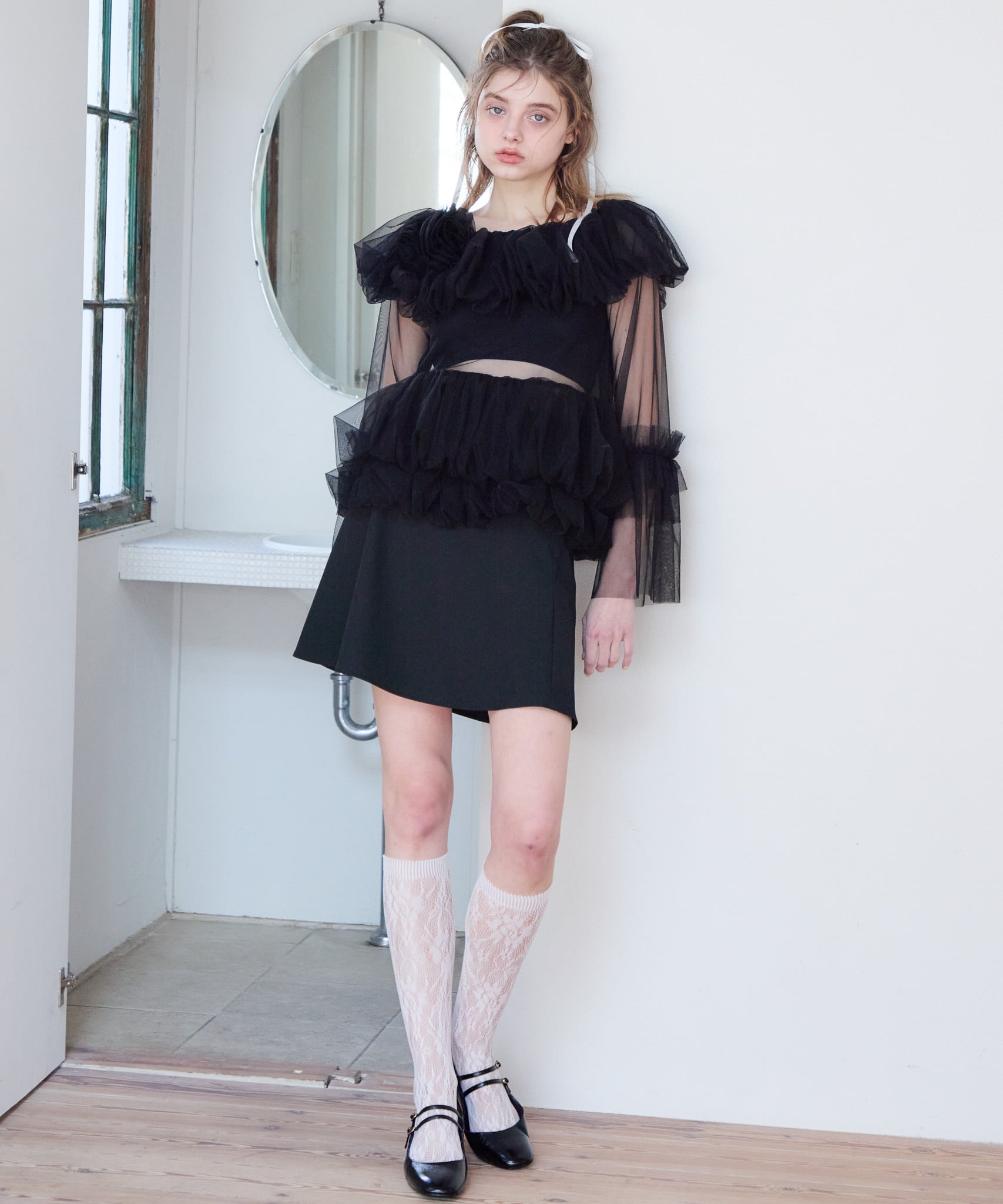 デコルテに薔薇のモチーフのついたチュールのブラウス。