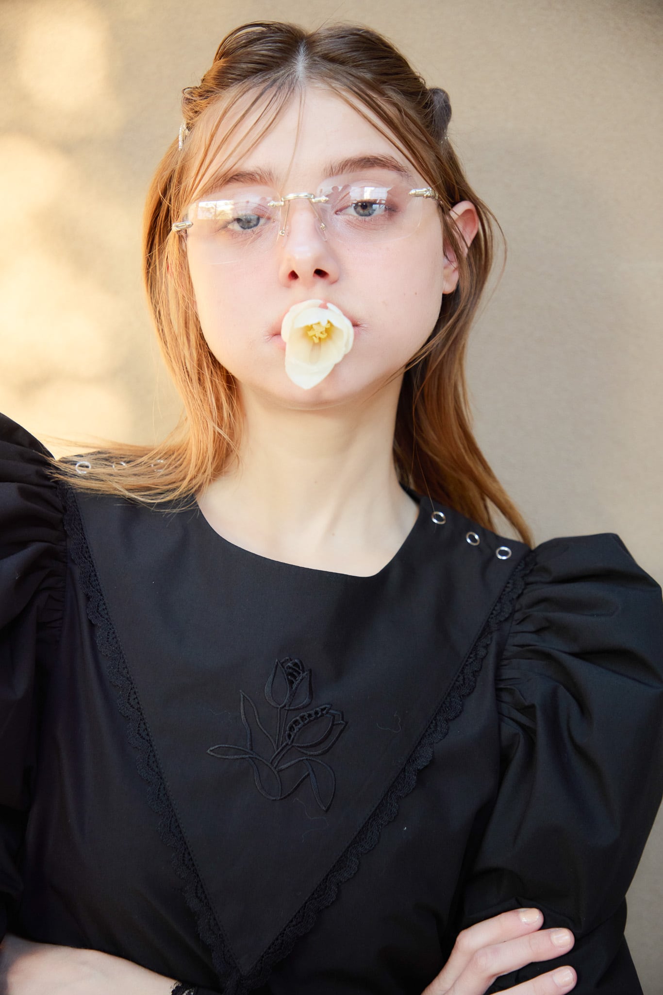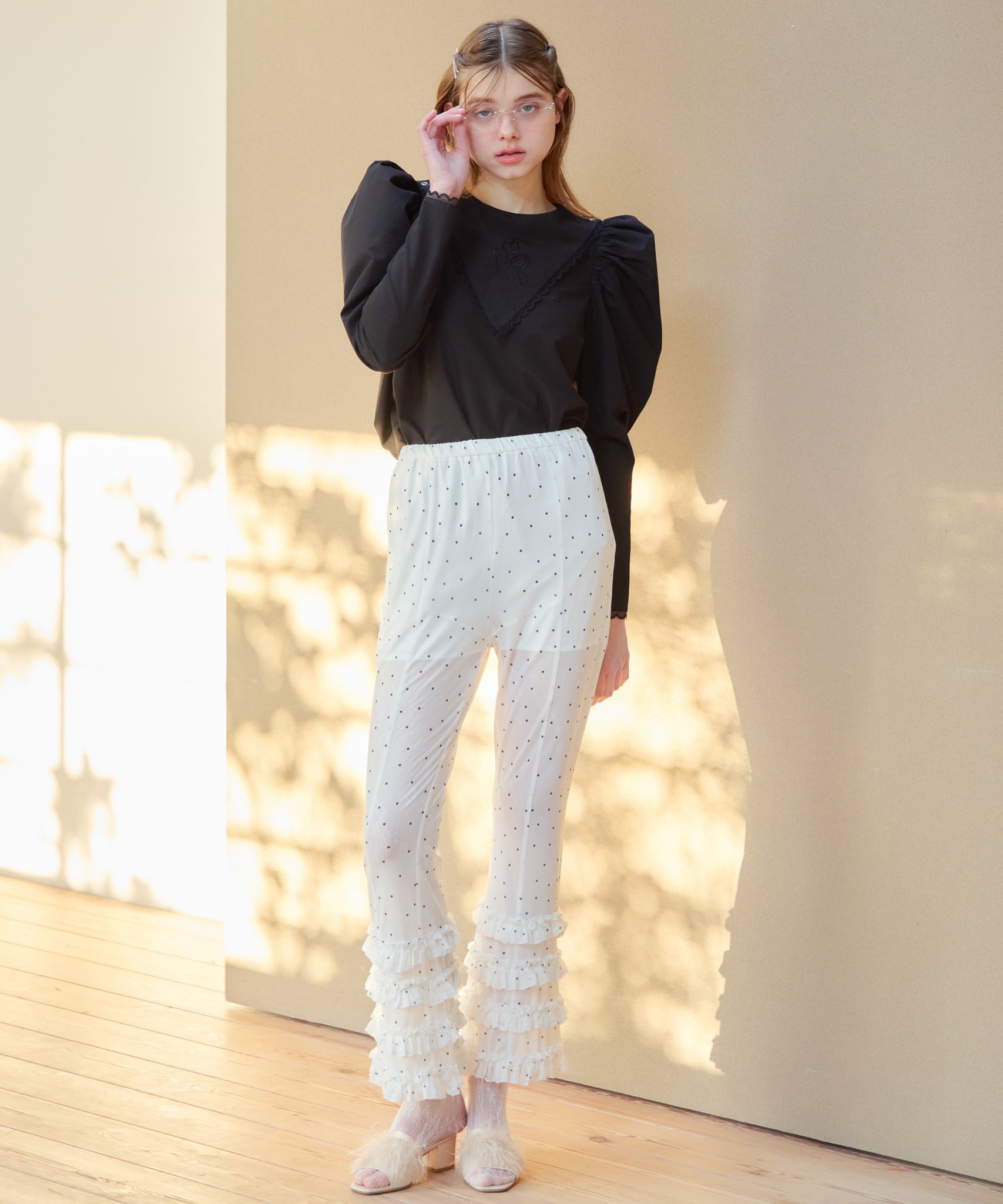 チューリップ刺繍ボリュームスリーブブラウス