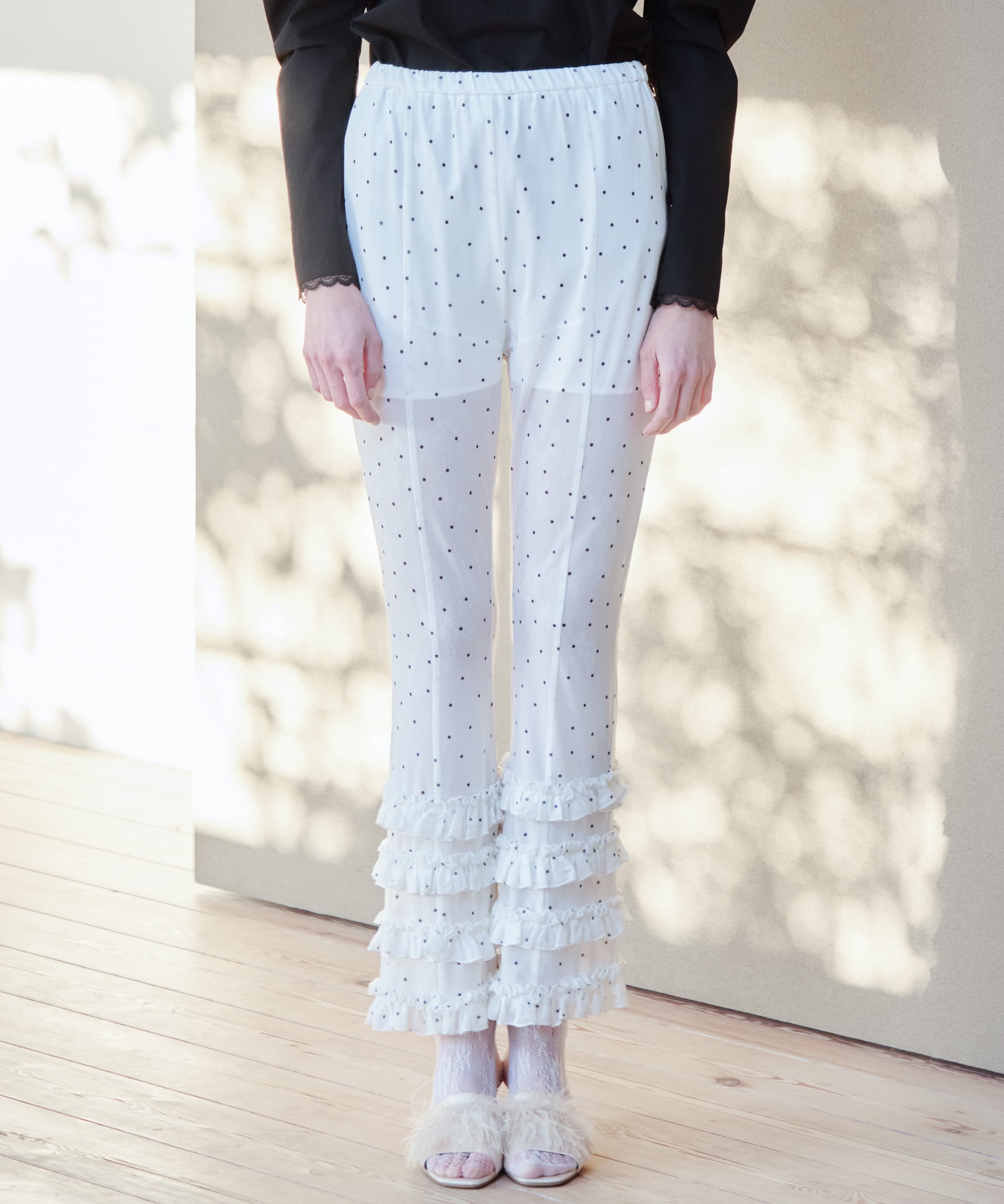 チュールにプリントを施した、美シルエットパンツ。