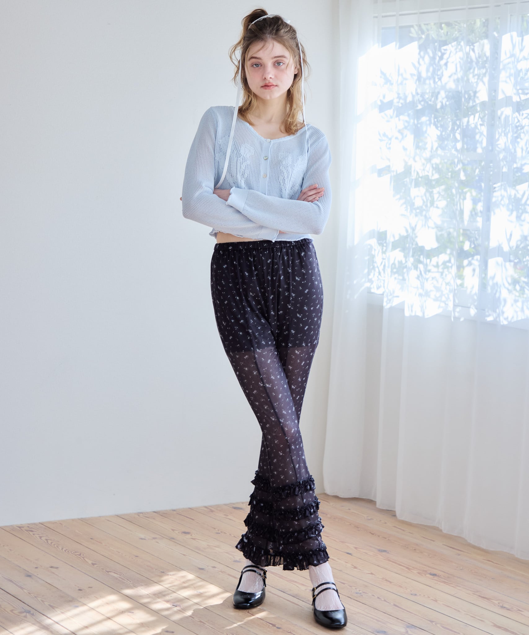 チュールにプリントを施した、美シルエットパンツ。
