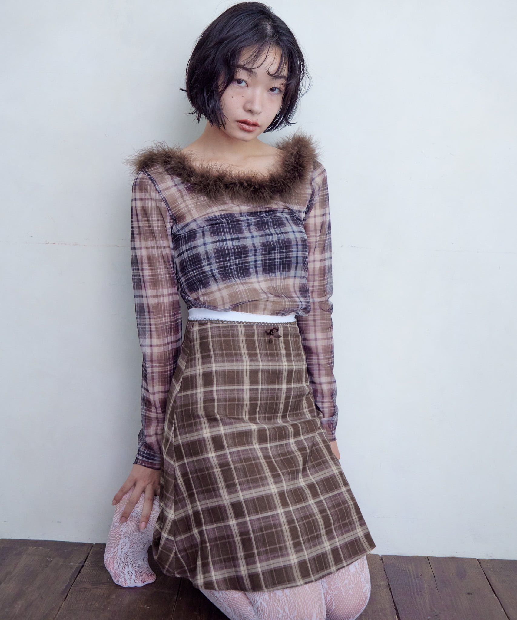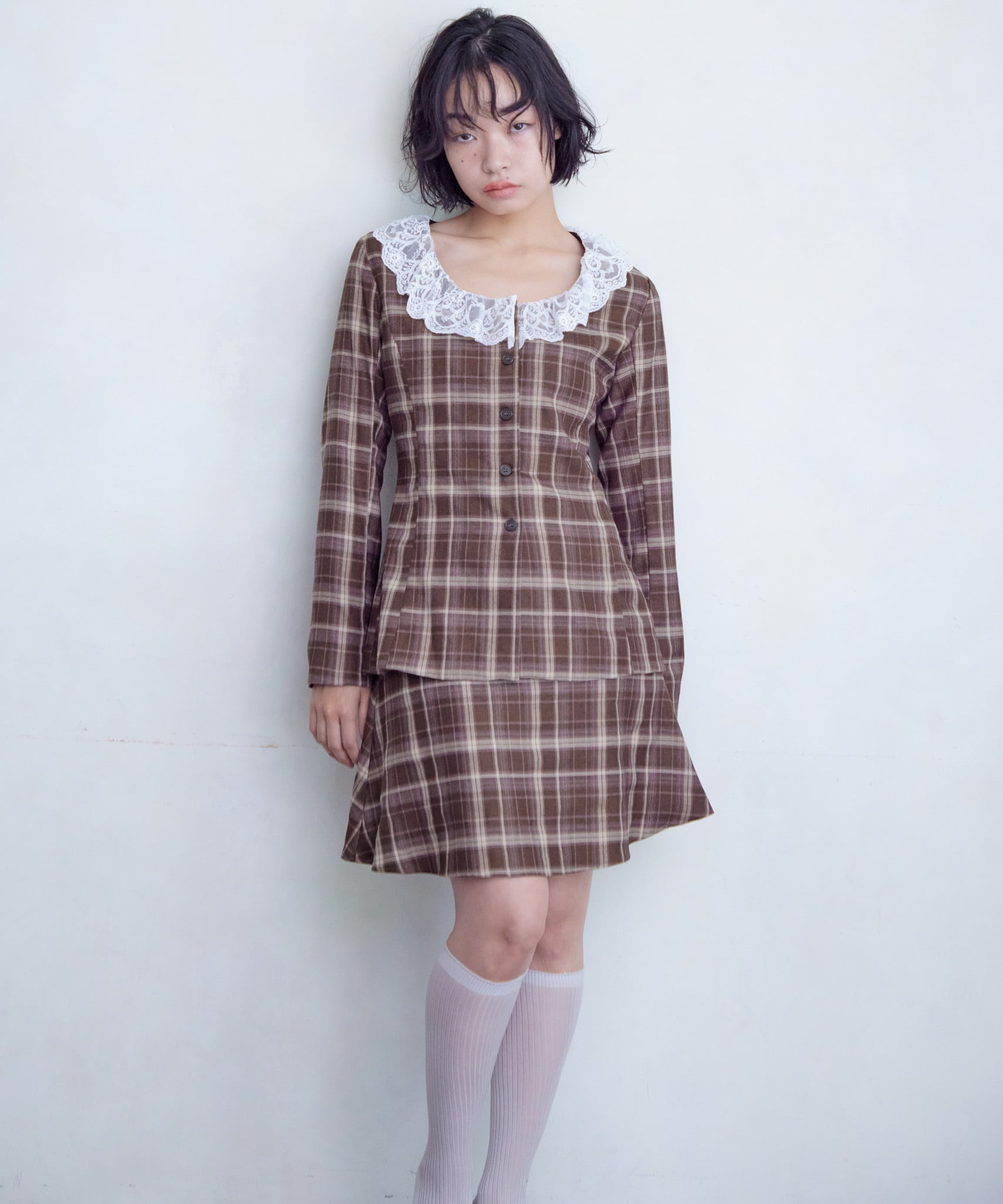 スーツ生地でモードな印象に。blackとgrayは無地、brownはチェック柄でトラッドに仕上げました。