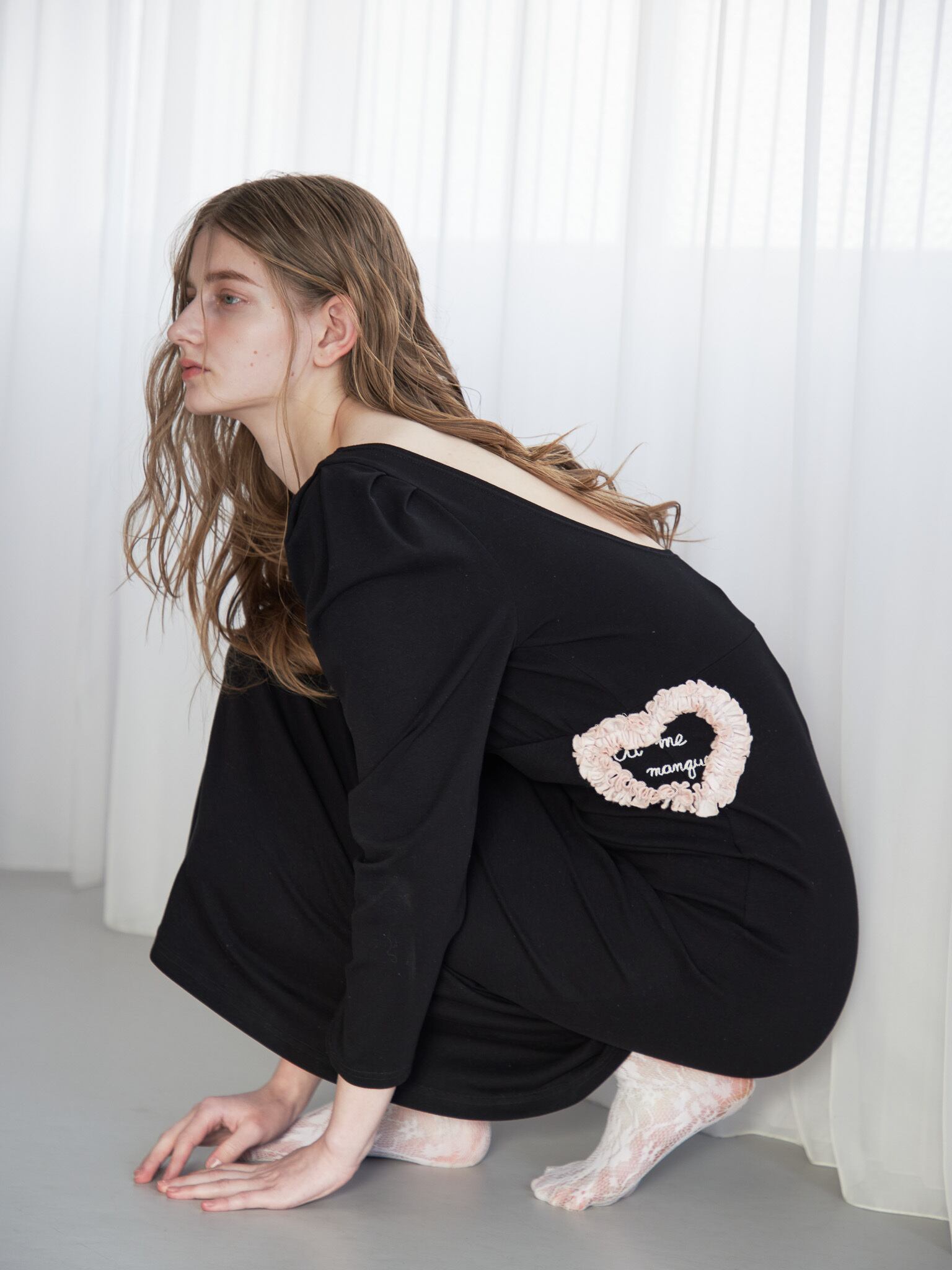 ハートのフリルの中に施した刺繍のフランス語 “Tu me manques” が “I miss you”を意味するロマンティックなワンピース。