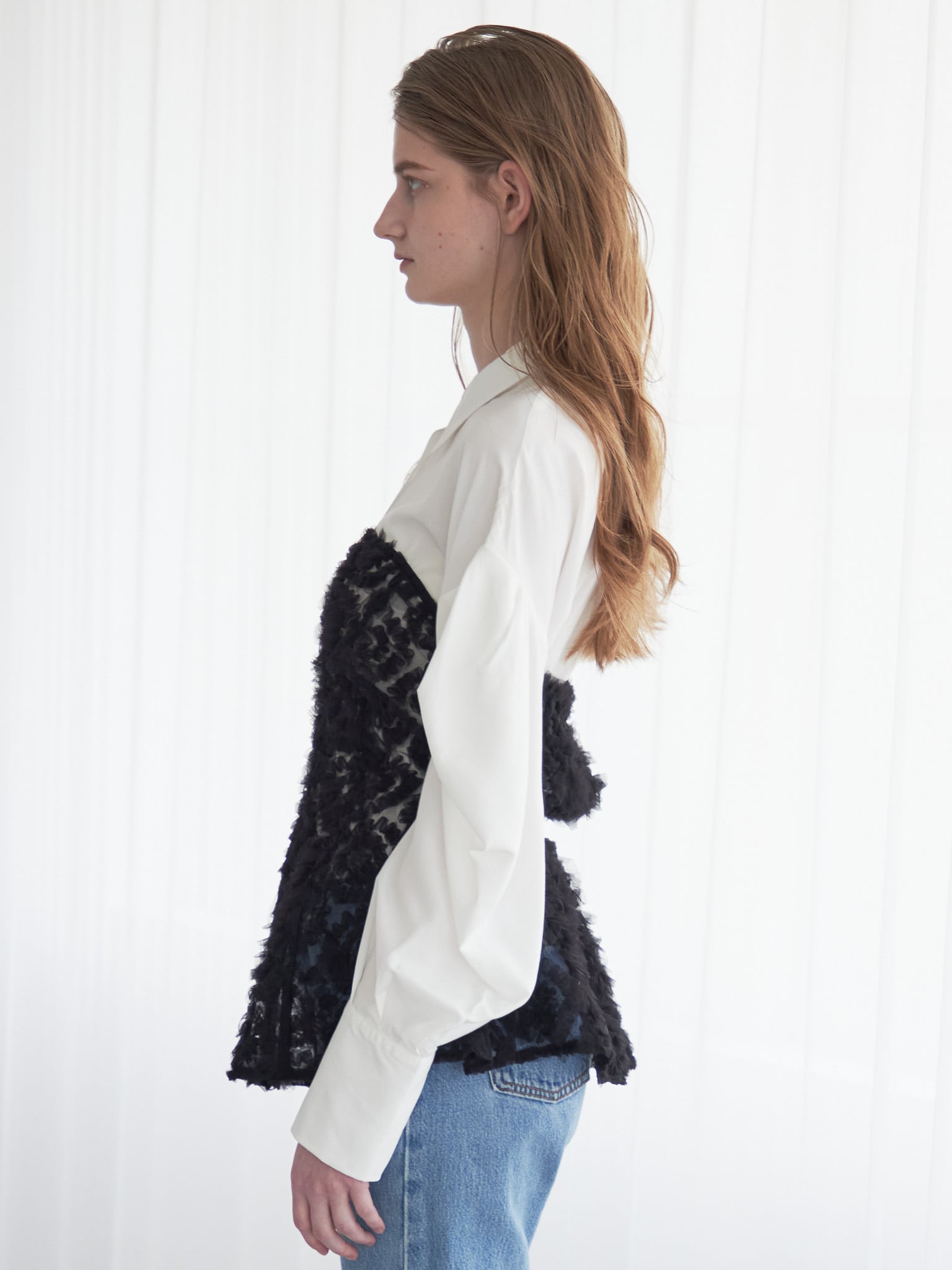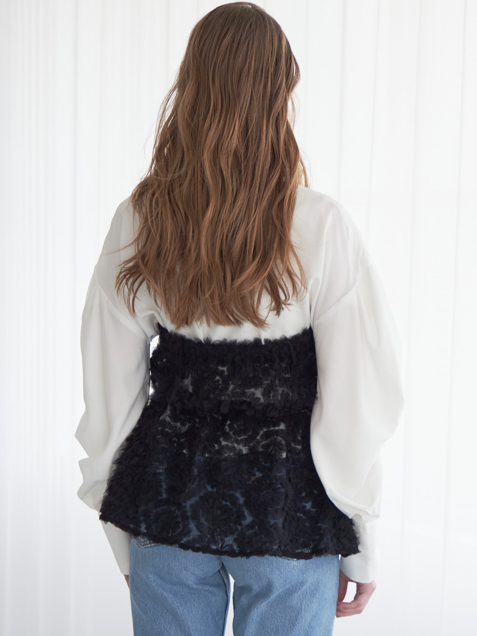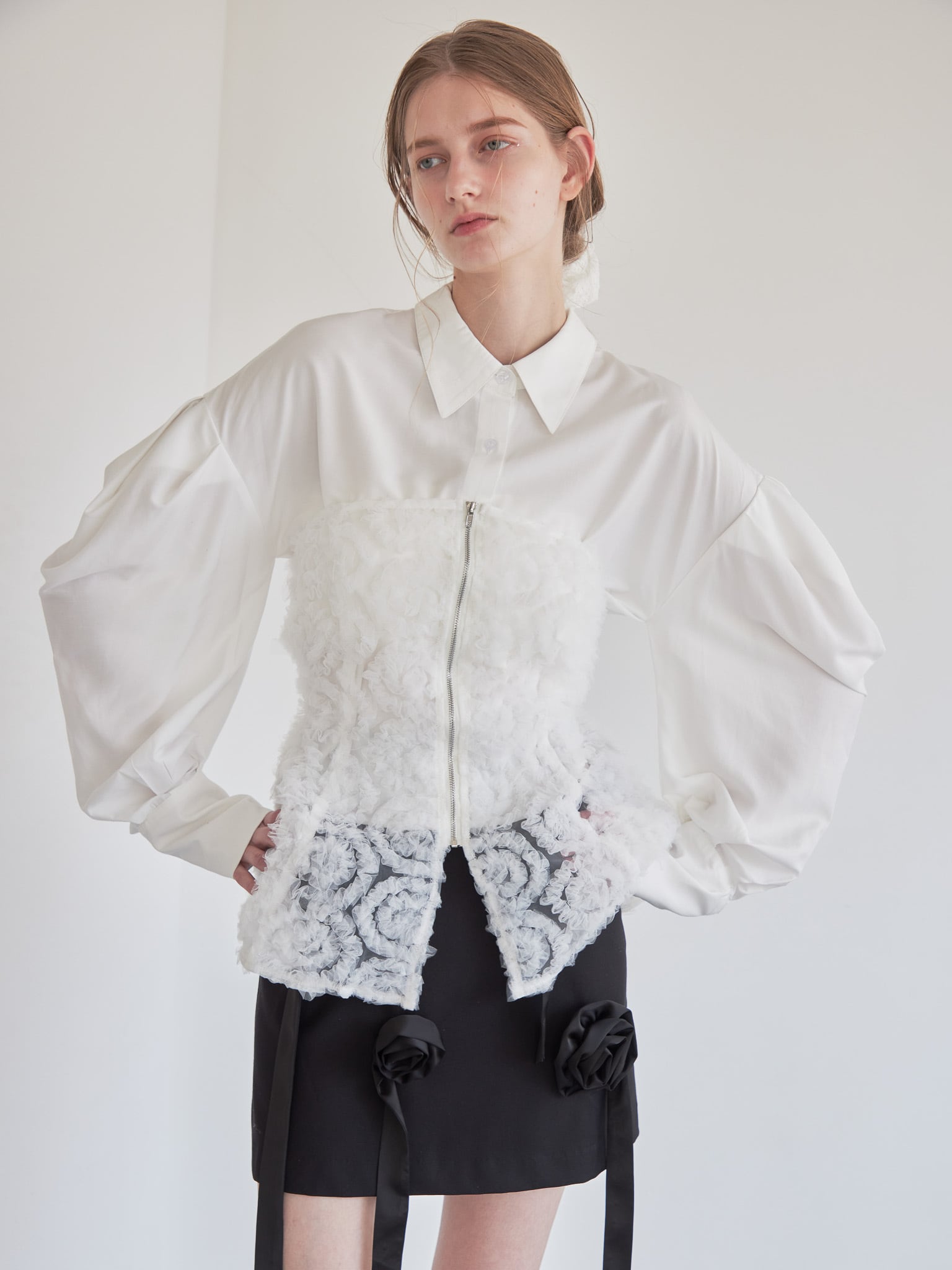 立体的なチュールのベアトップとシャツのセット。