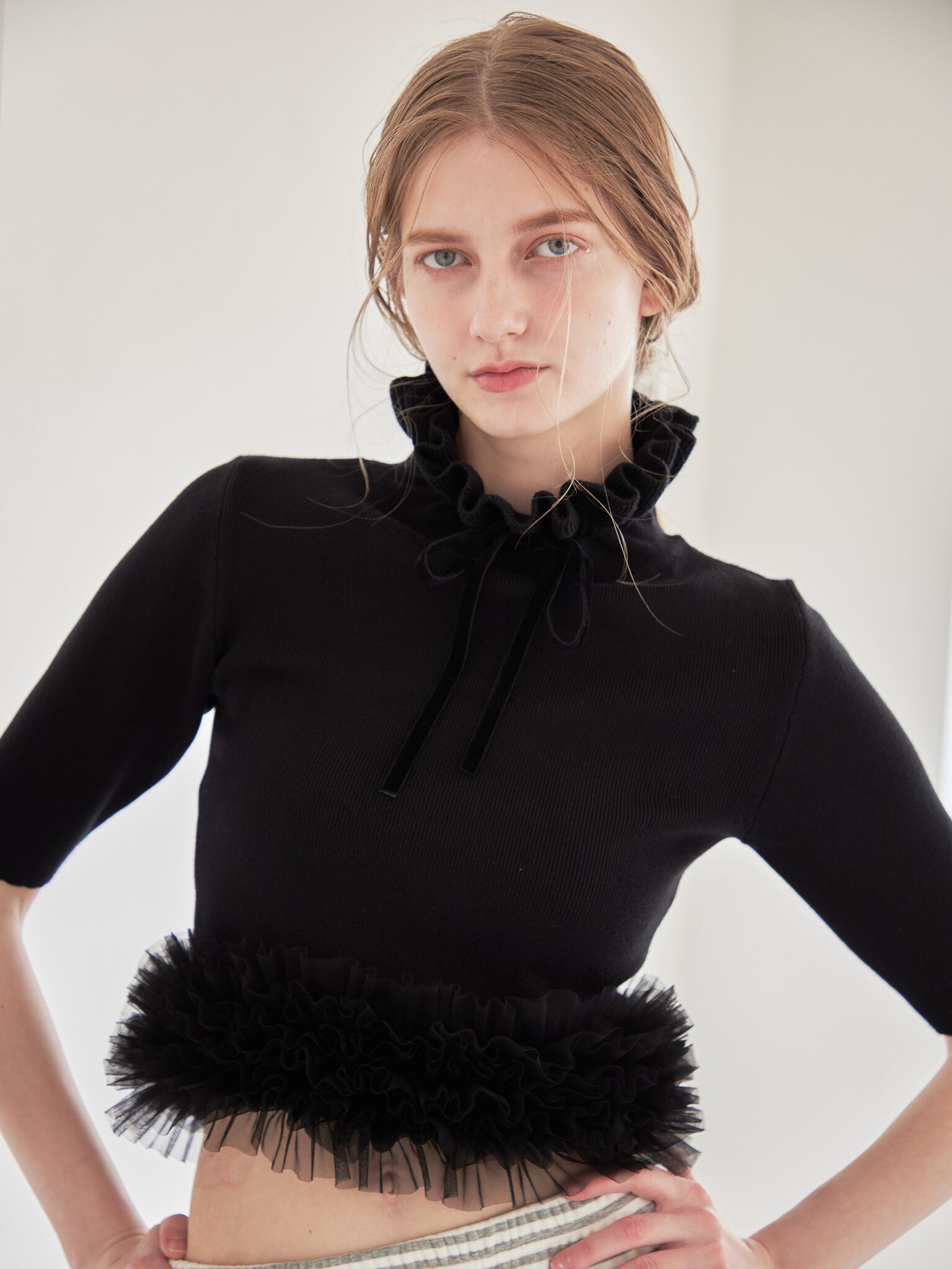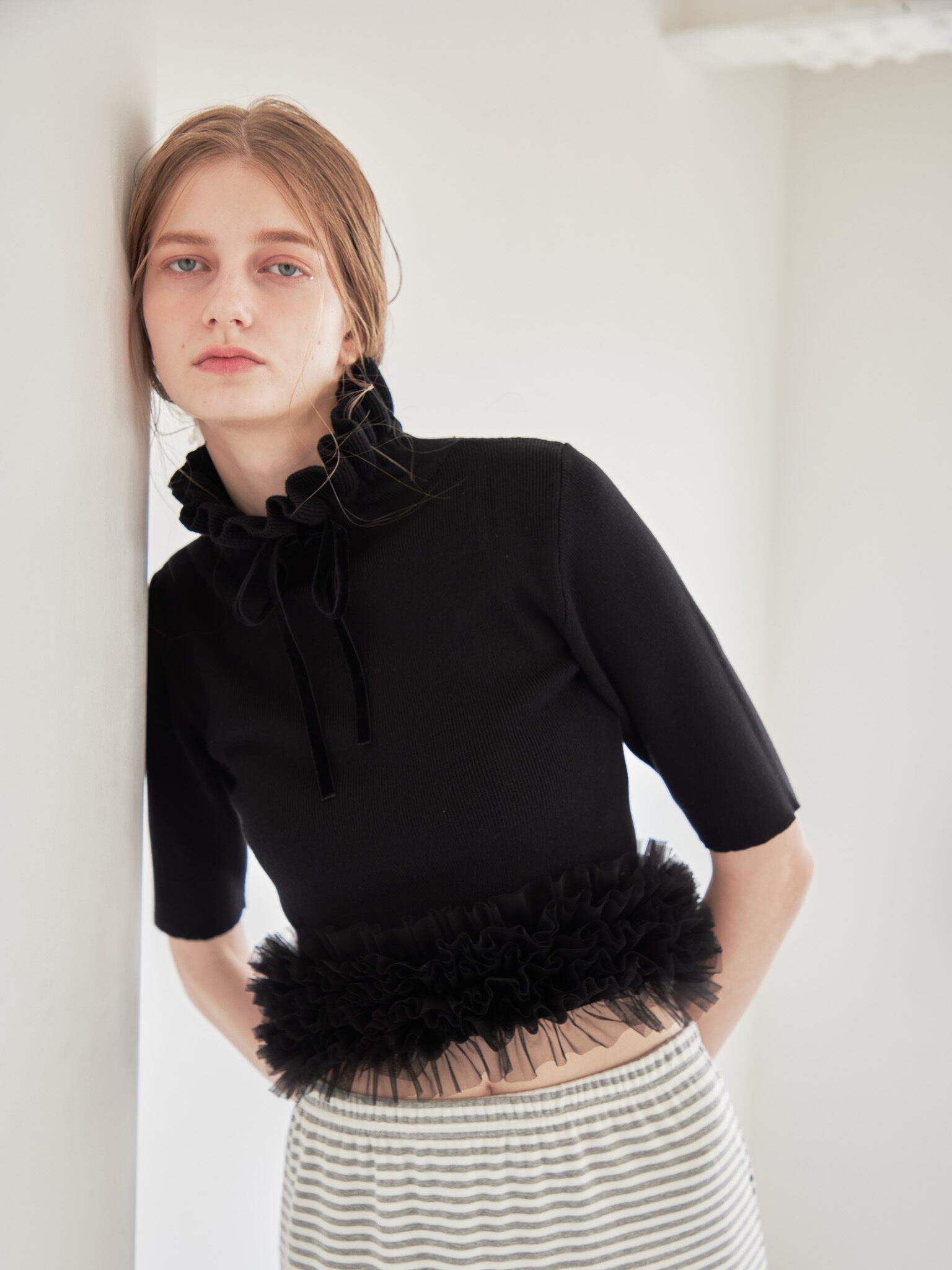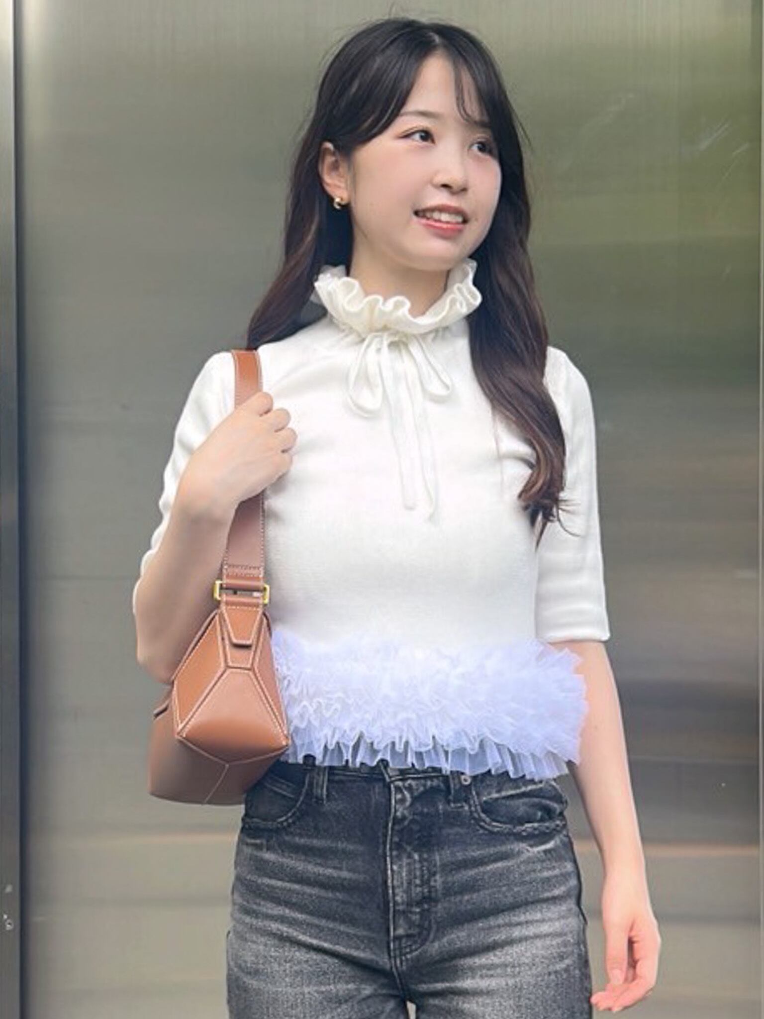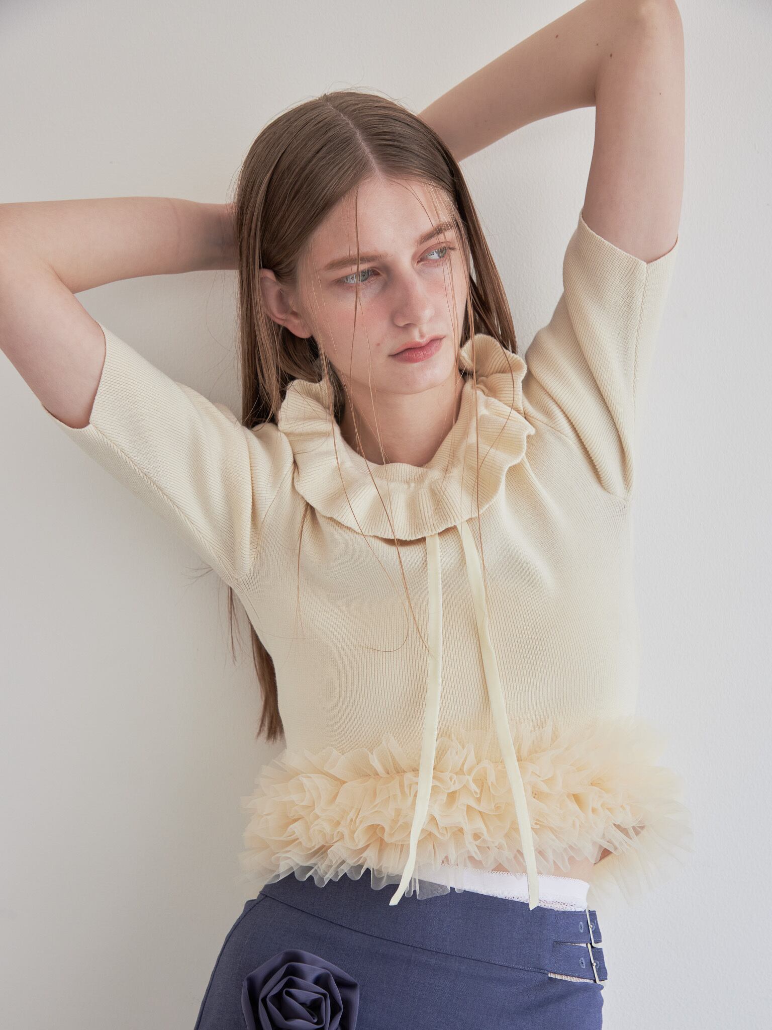 裾にボリュームのあるチュールをドッキングしたリブニットトップス。