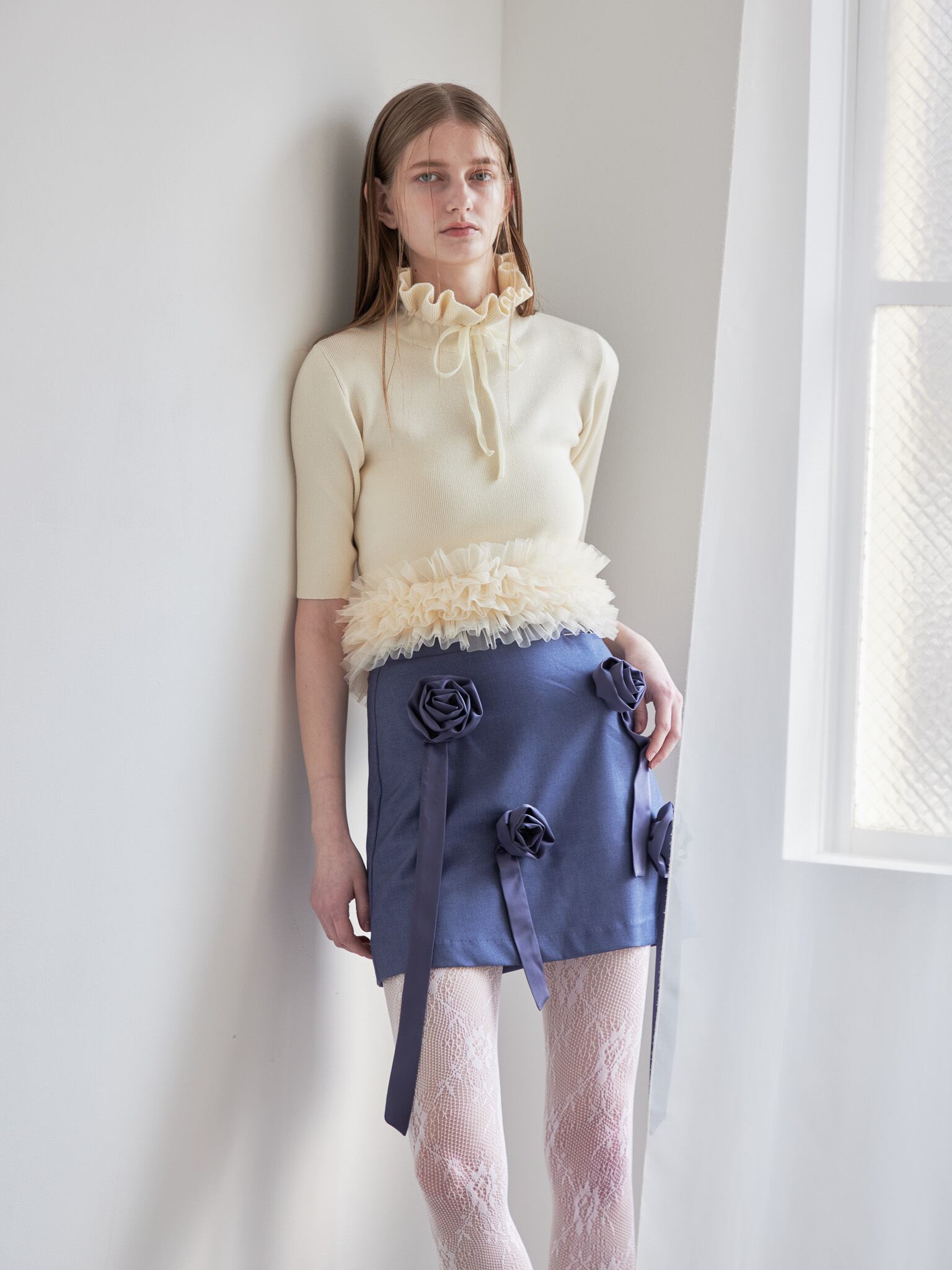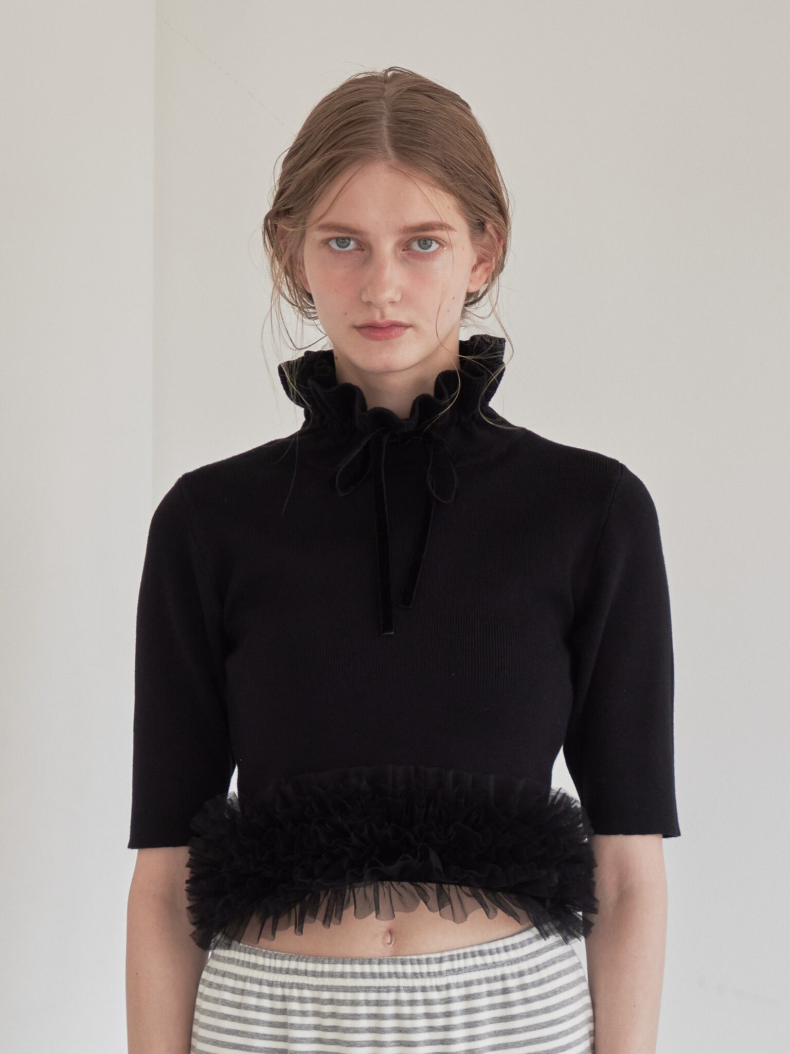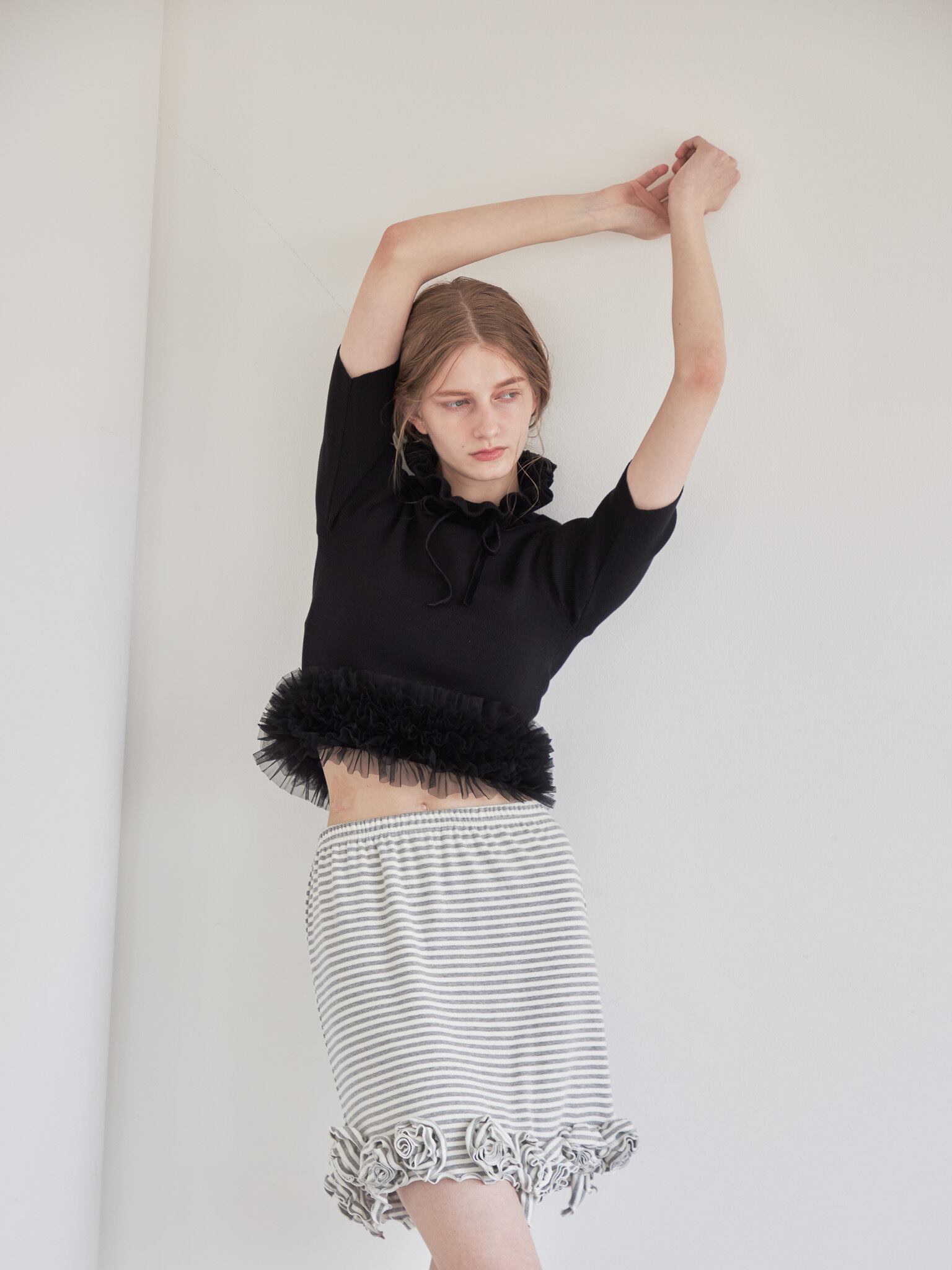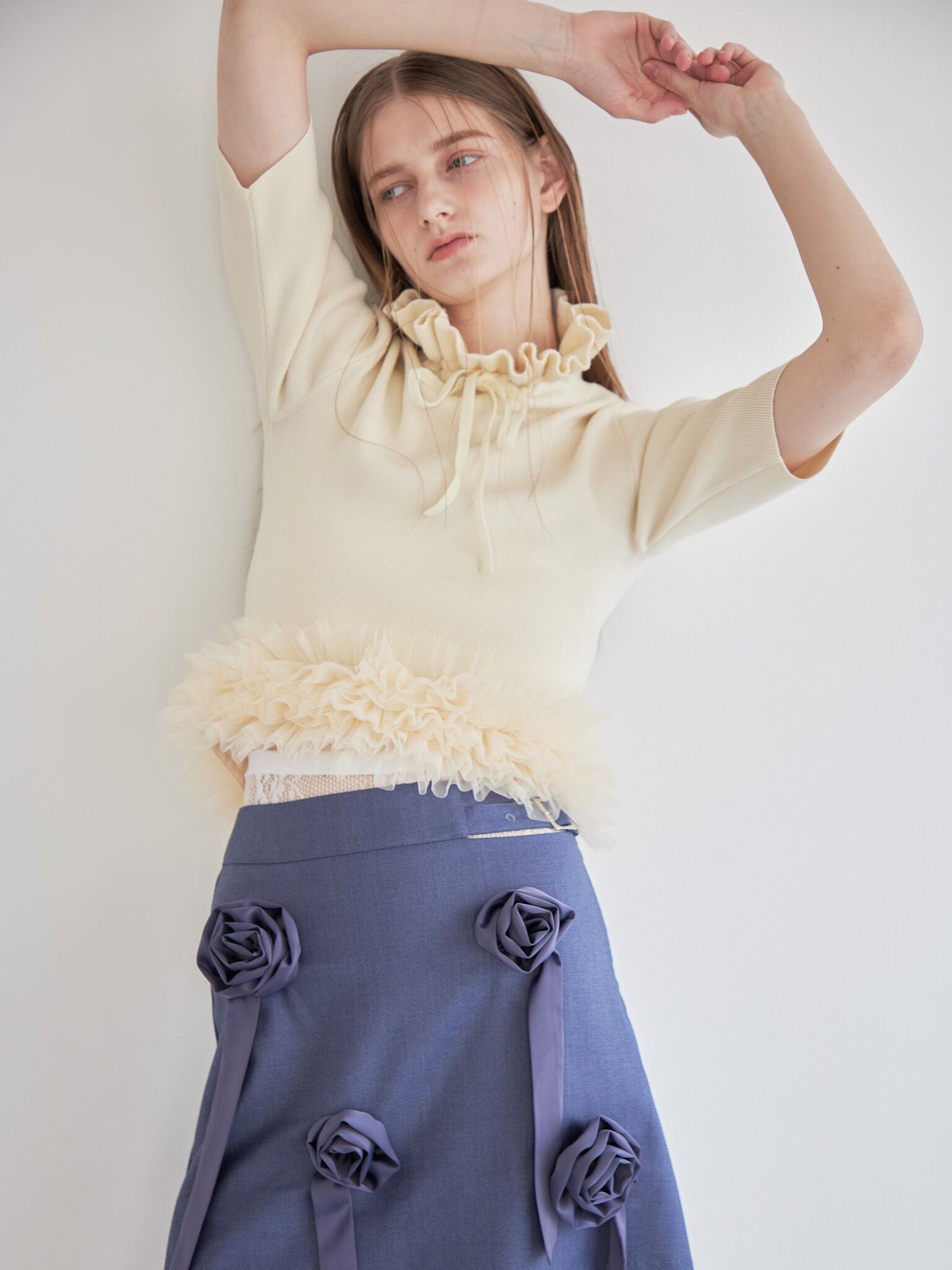 裾にボリュームのあるチュールをドッキングしたリブニットトップス。