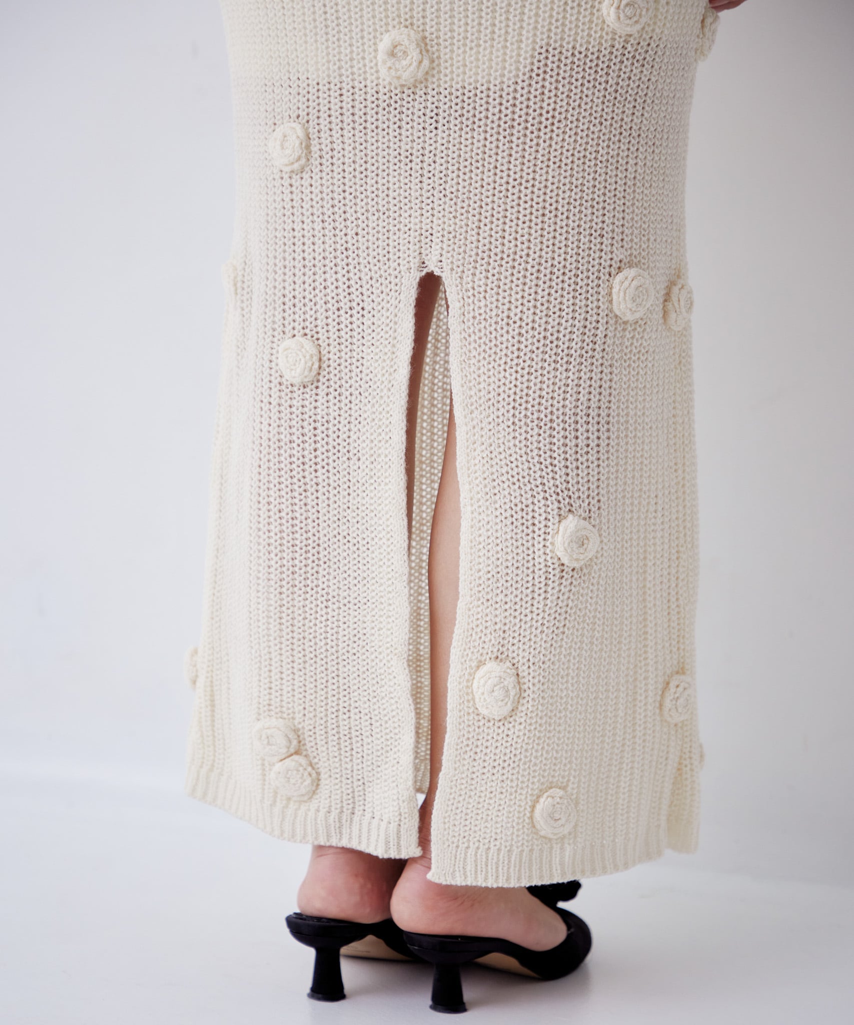ニット同素材で編んだ薔薇の花をふんだんにちりばめたワンピース。