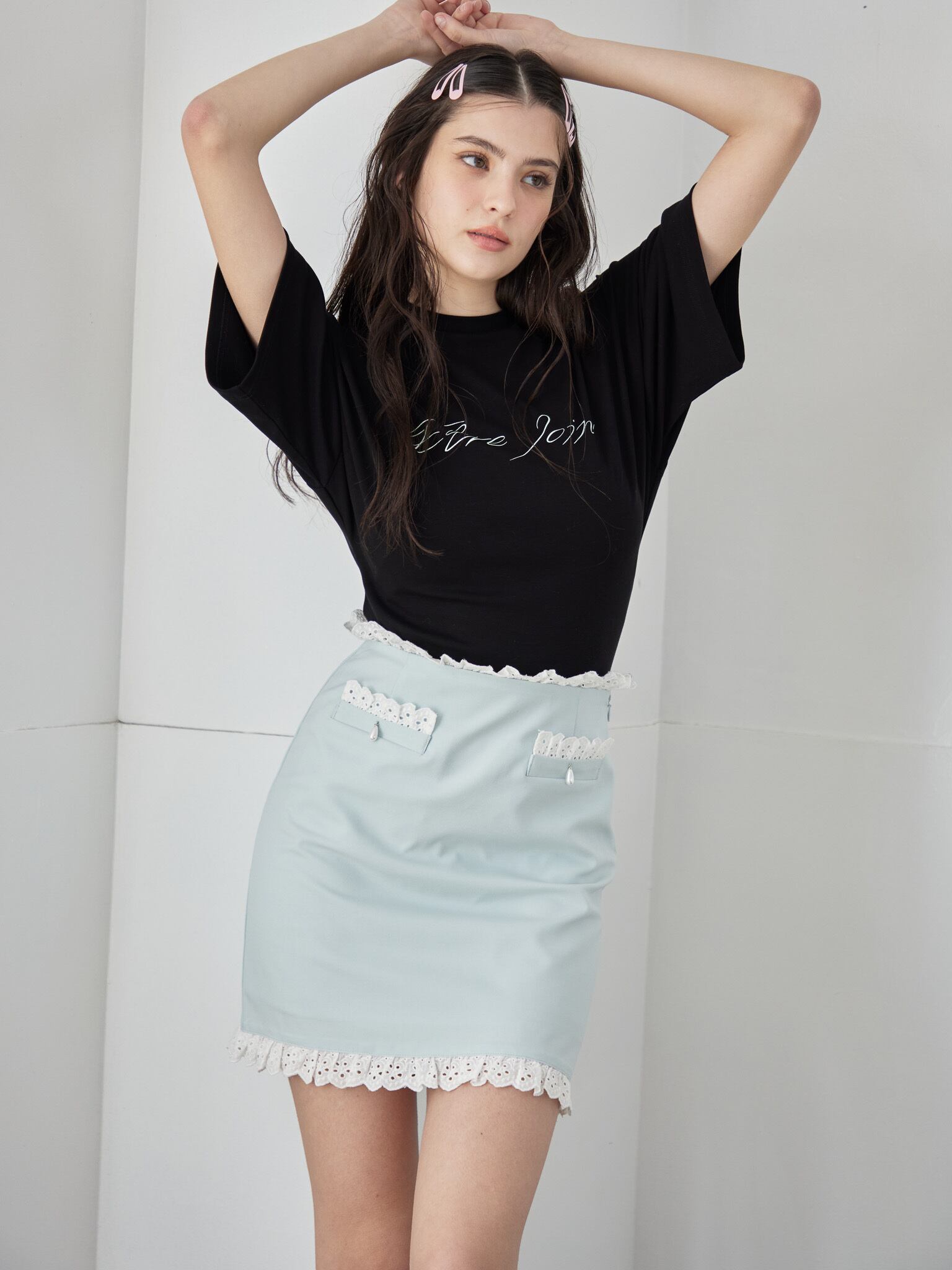 Tシャツをインしたり、短丈のトップスと合わせていただいたりと、ウエストのレースを見せるのがキュート♡ポケットには、推しの小物やキーホルダーを見せる収納するのもおすすめ♡