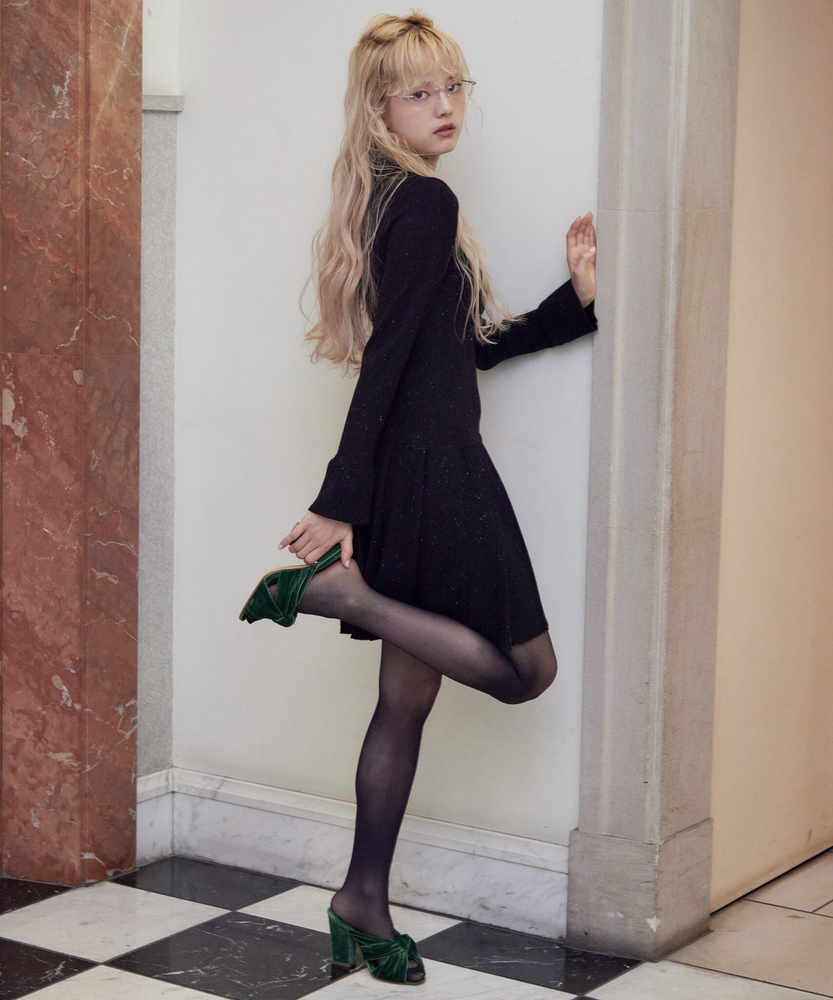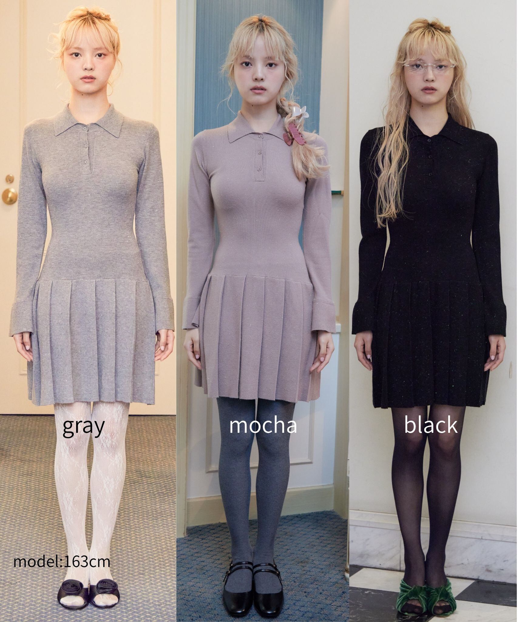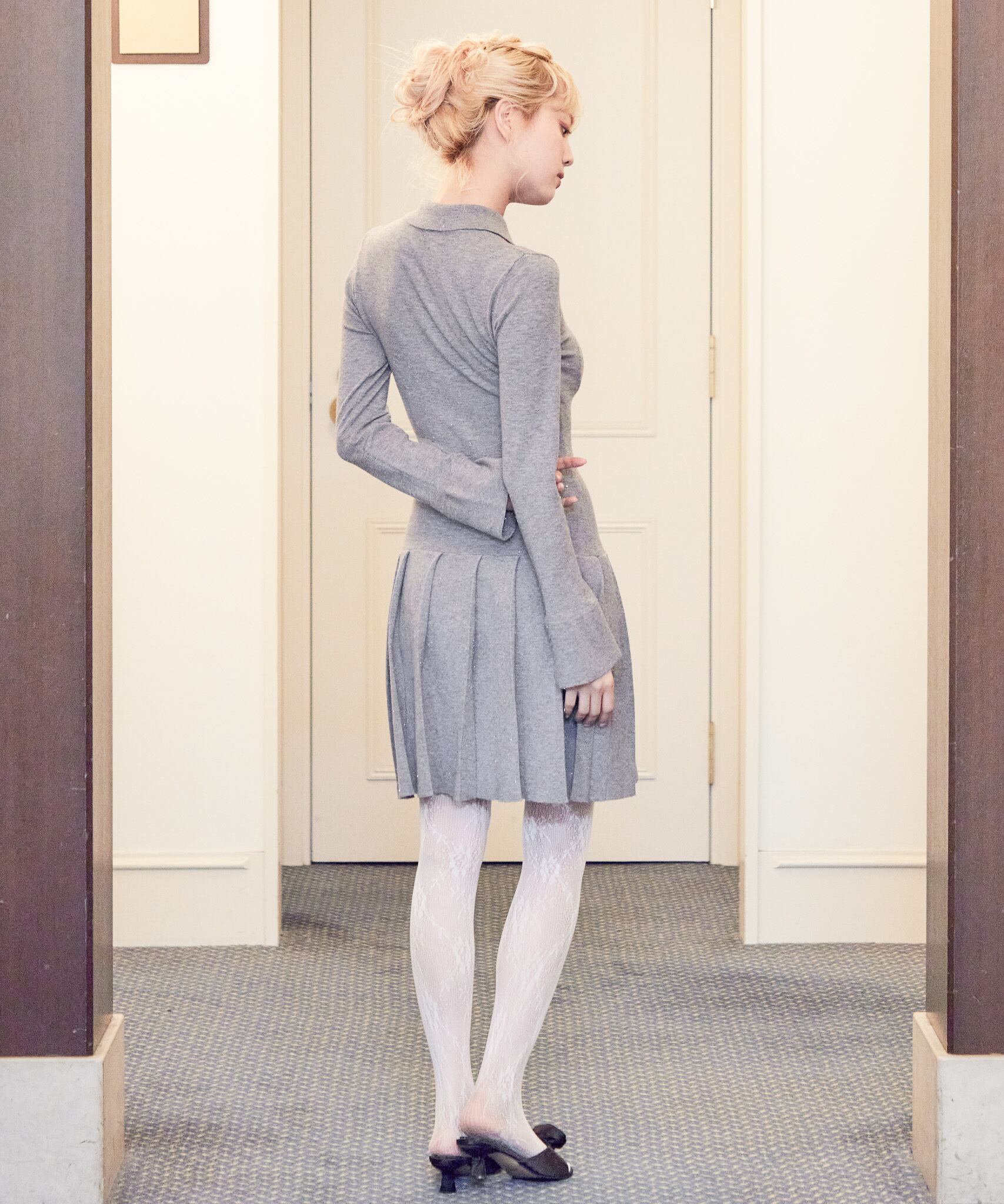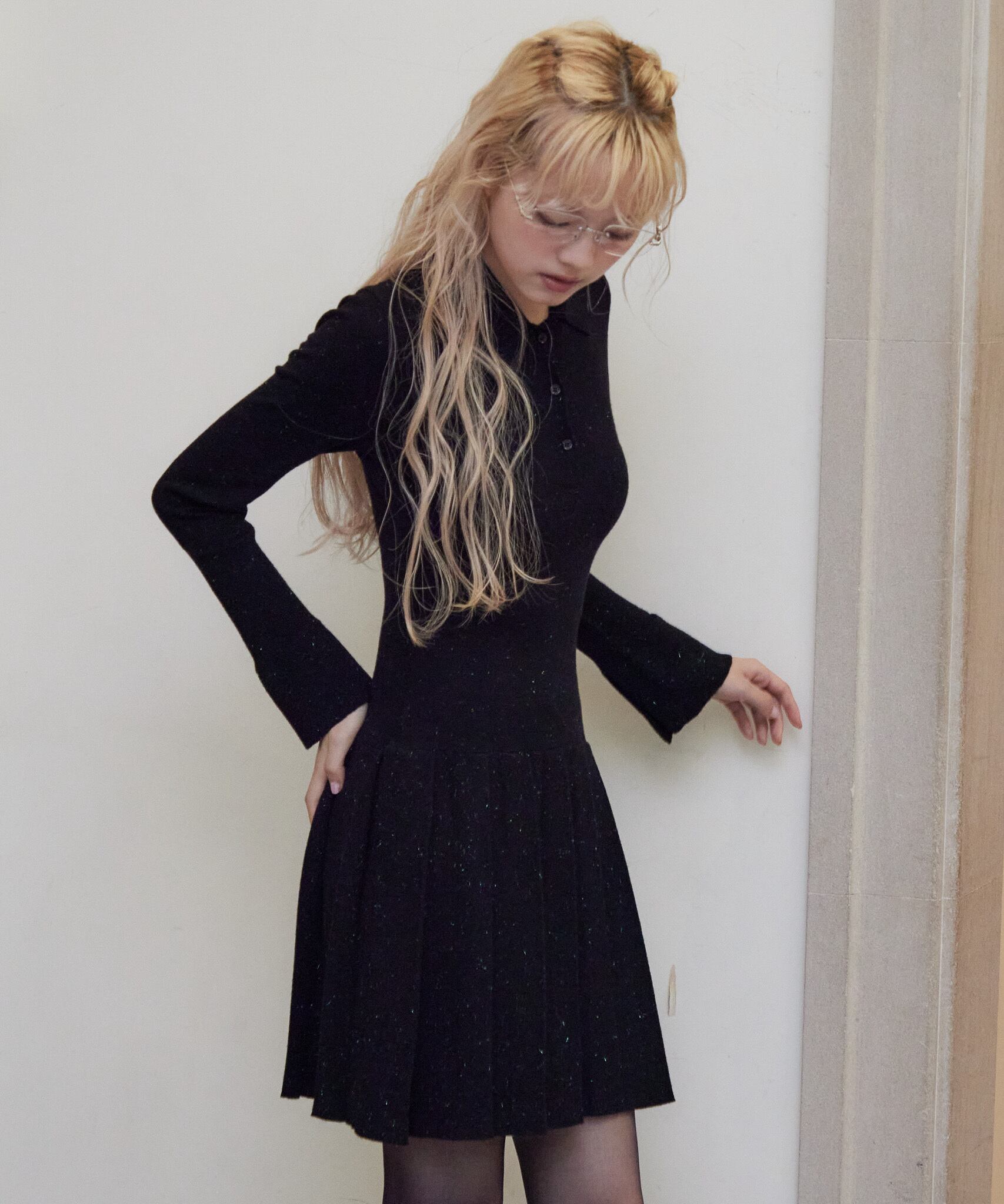 ローウエストプリーツラメニットワンピース / Low waist pleated glitter knit dress 【125046】