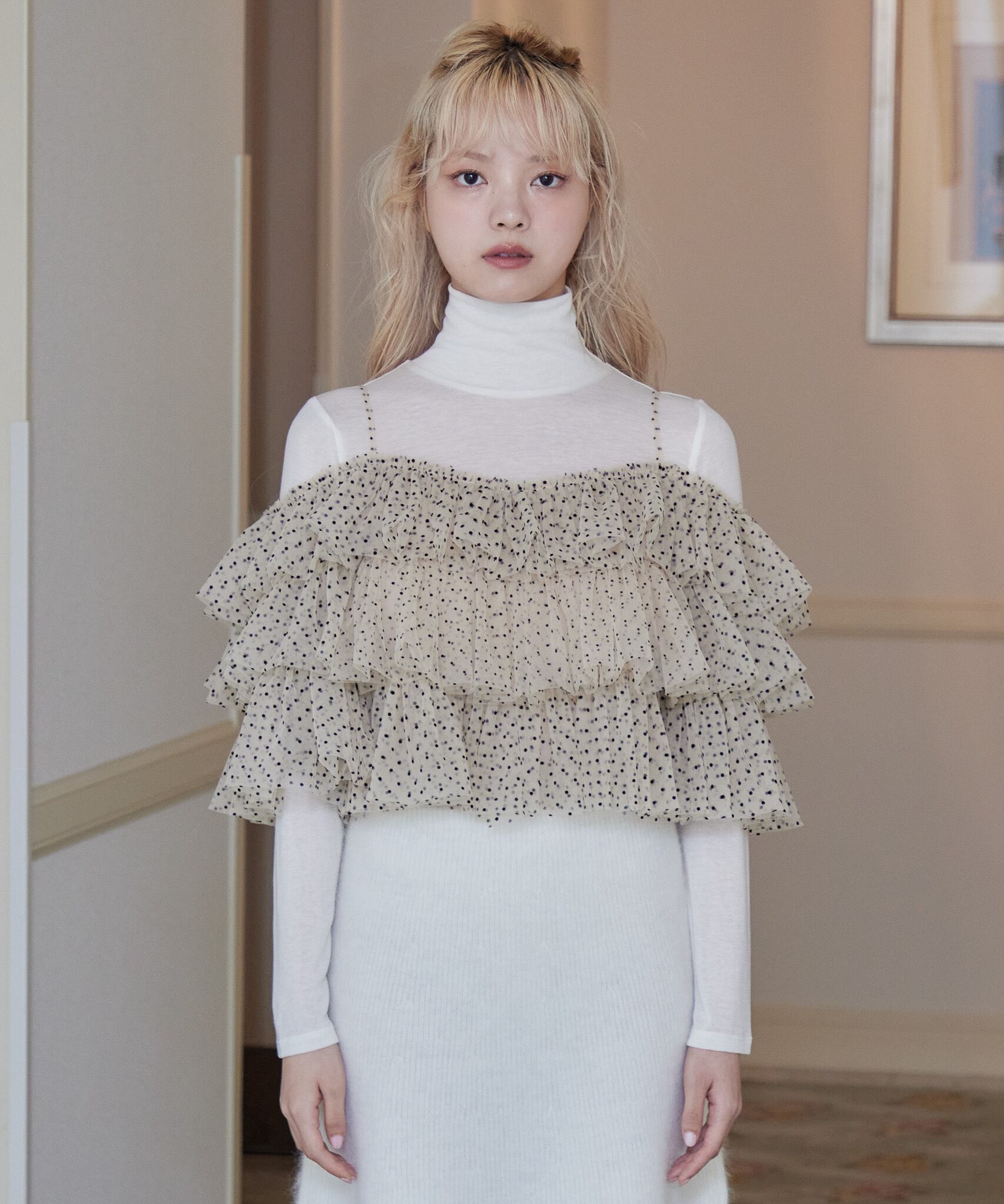 たっぷりのフリルのキャミソールと、タートルネックニットのセット。