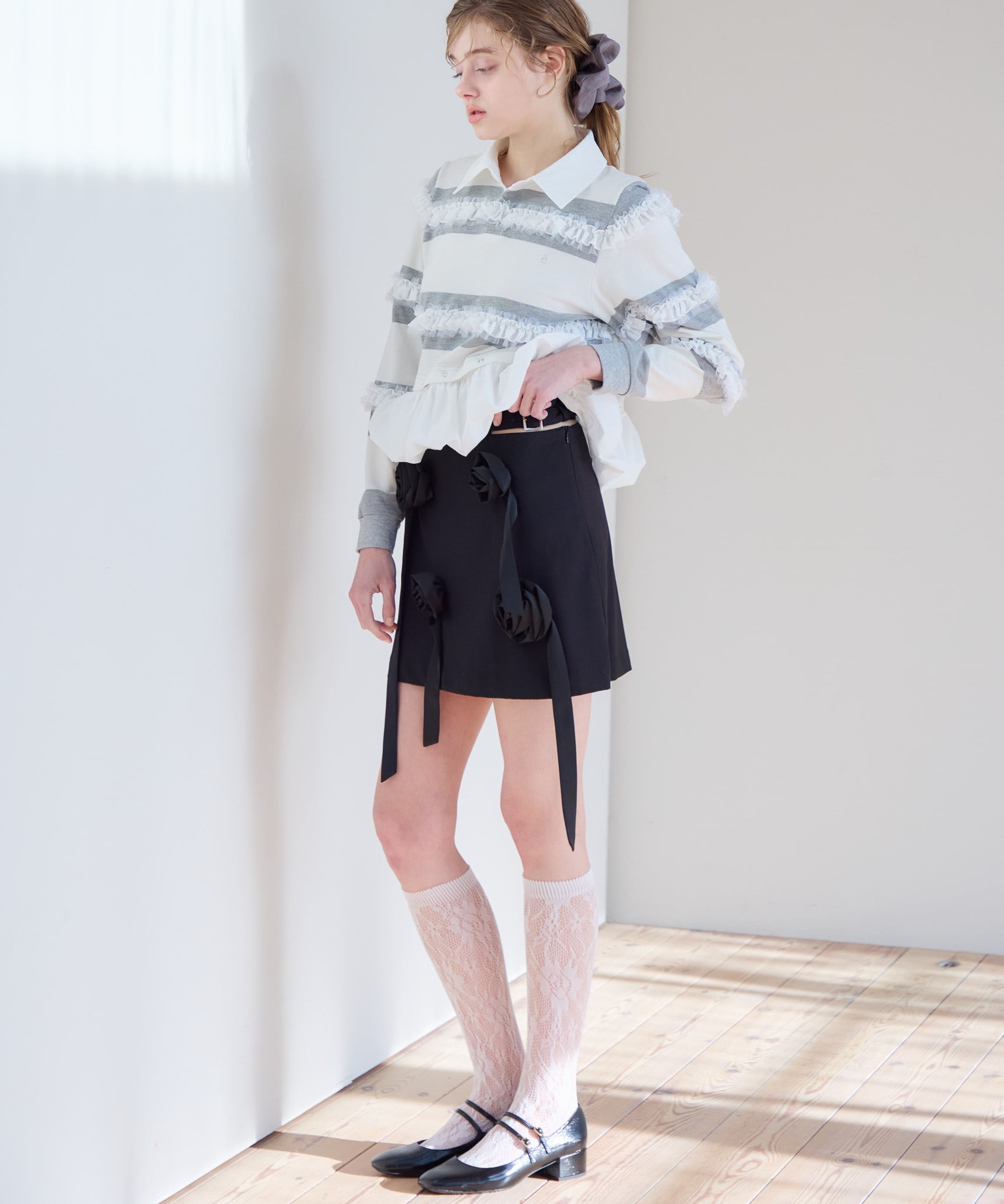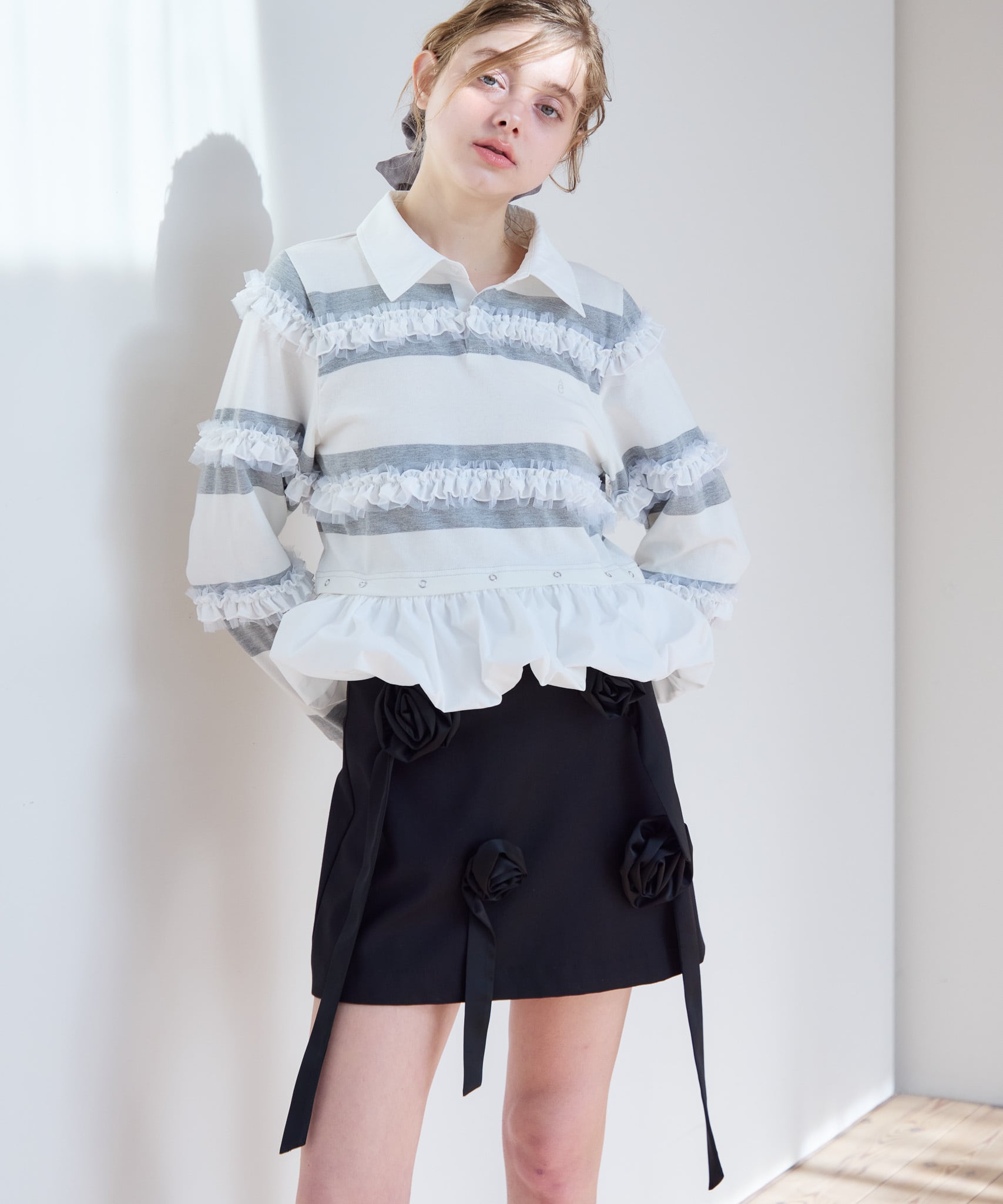 サテンのバラモチーフでガーリーとモードが絶妙なバランスのミニスカート。ウエストの左脇の2本のベルトでウエスト幅の調整が可能です。2本のベルトの間からのヘルシーな肌見せがポイント。レースのストッキングや、レースのパンツの上に重ねるとトレンド感抜群です。