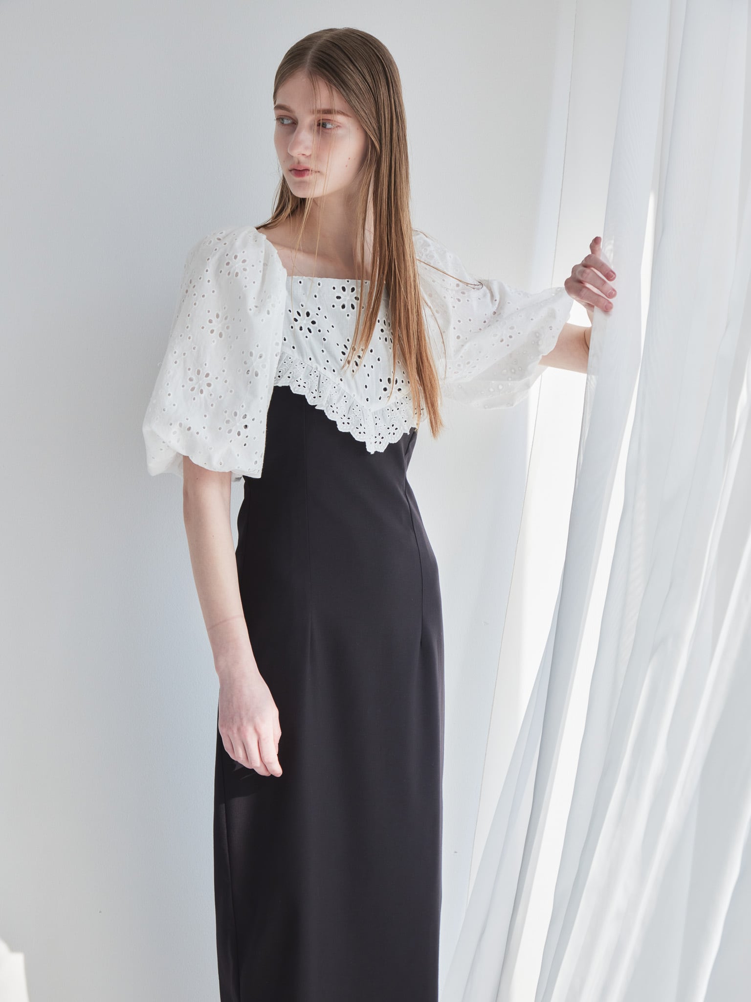 刺繍のコットン生地をスカーフのようにカッティングしドッキングしたワンピース。ノスタルジックでロマンティックな雰囲気を演出します。ボリュームのあるパフスリーブがアイラインのボディシルエットとのバランス抜群です。スカートの後ろの裾にベンツ開きがありアイラインながらも足さばきはgood。後ろファスナーで着用でき、後ろウエストのリボンを結んでボディにフィットさせてご着用いただけます。