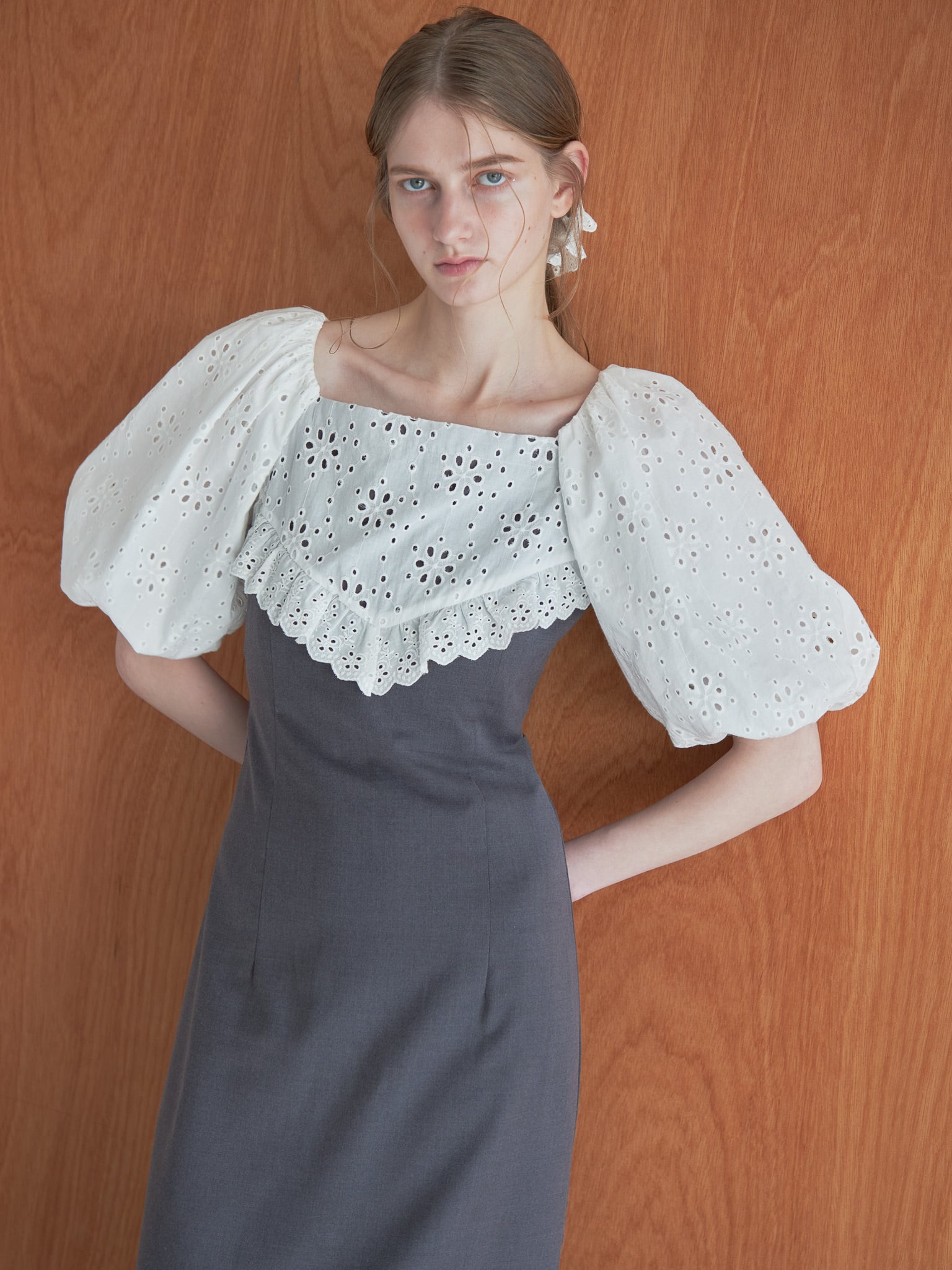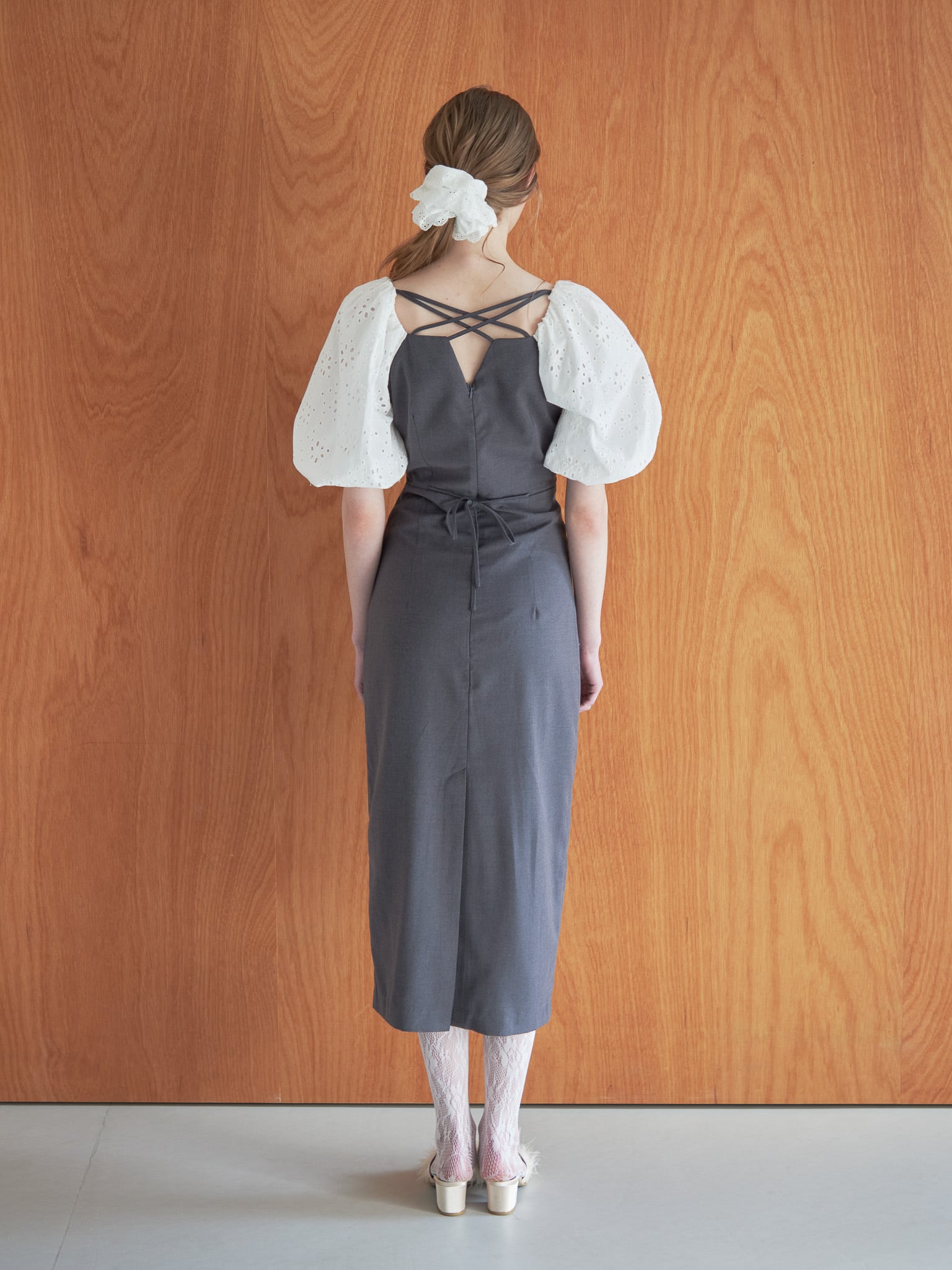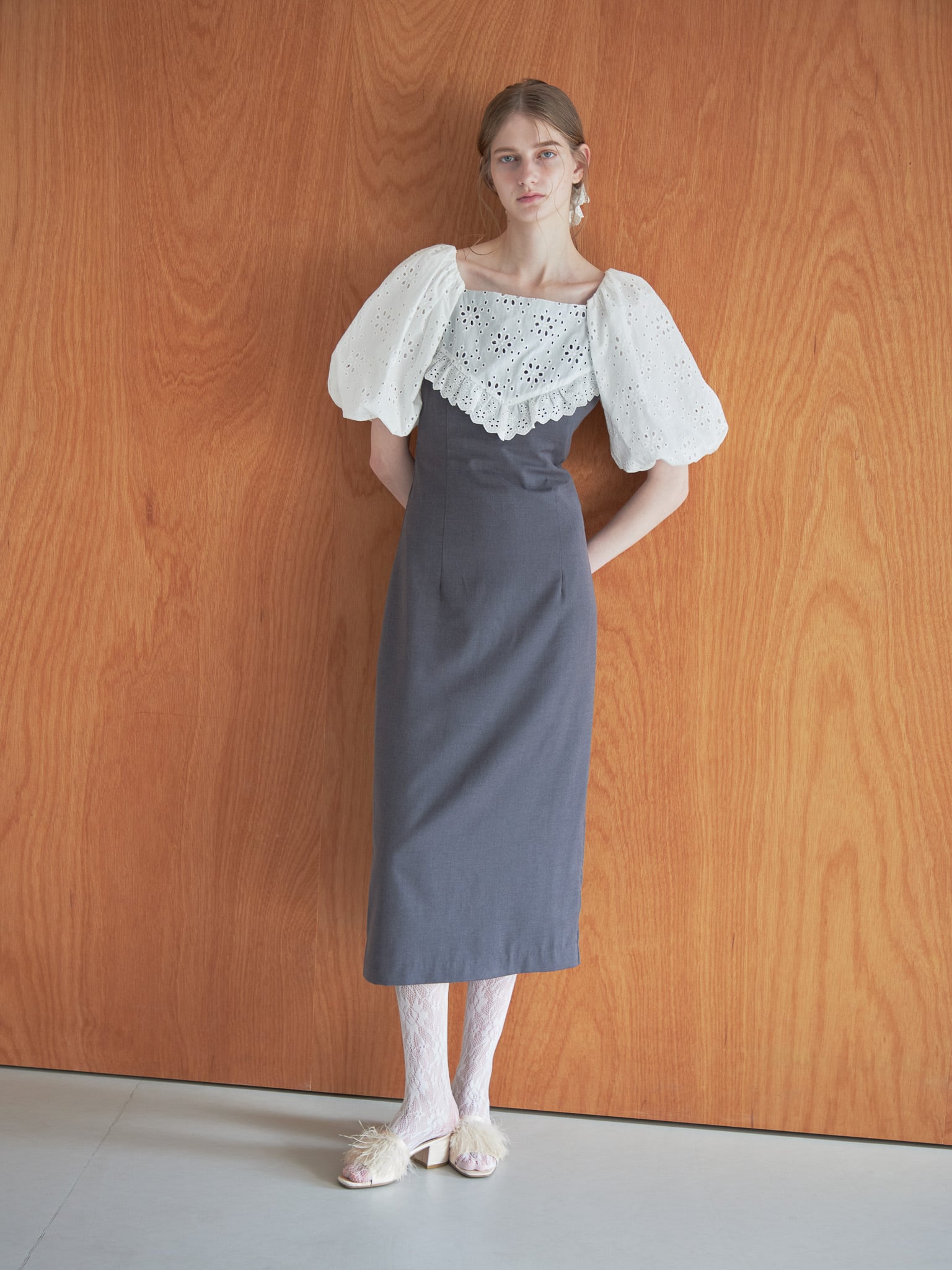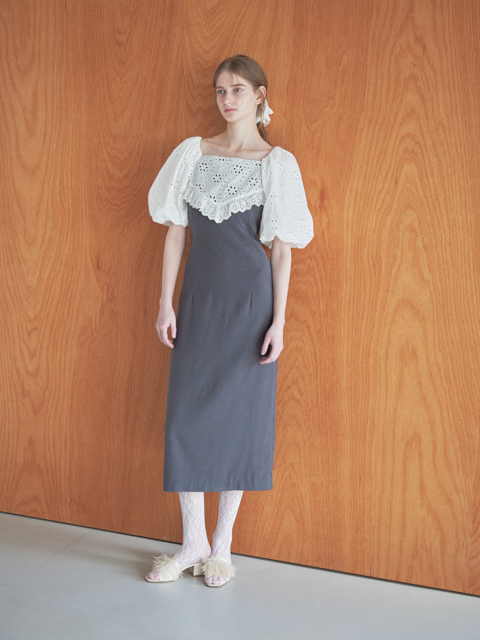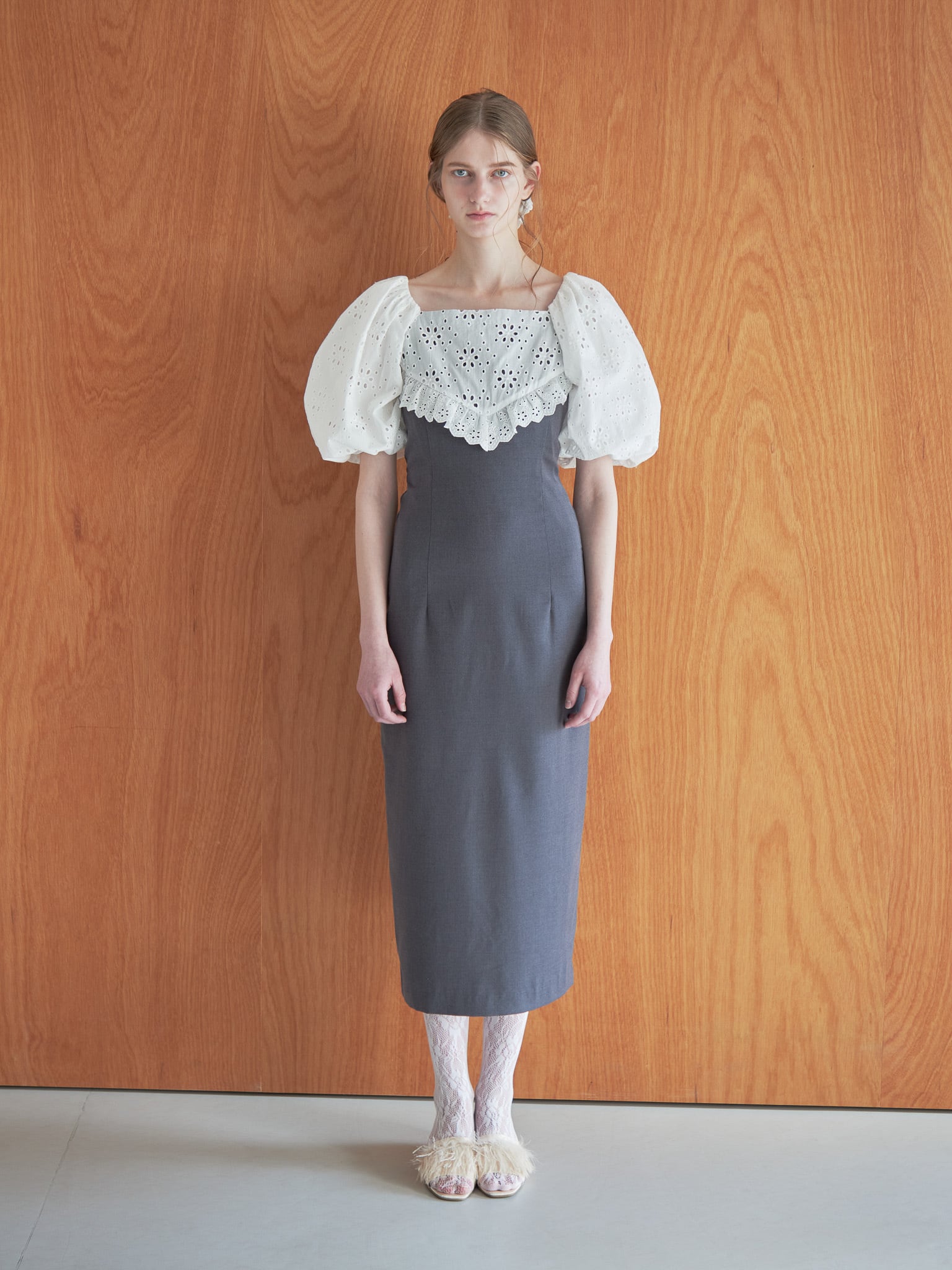 刺繍のコットン生地をスカーフのようにカッティングしドッキングしたワンピース。ノスタルジックでロマンティックな雰囲気を演出します。ボリュームのあるパフスリーブがアイラインのボディシルエットとのバランス抜群です。スカートの後ろの裾にベンツ開きがありアイラインながらも足さばきはgood。後ろファスナーで着用でき、後ろウエストのリボンを結んでボディにフィットさせてご着用いただけます。