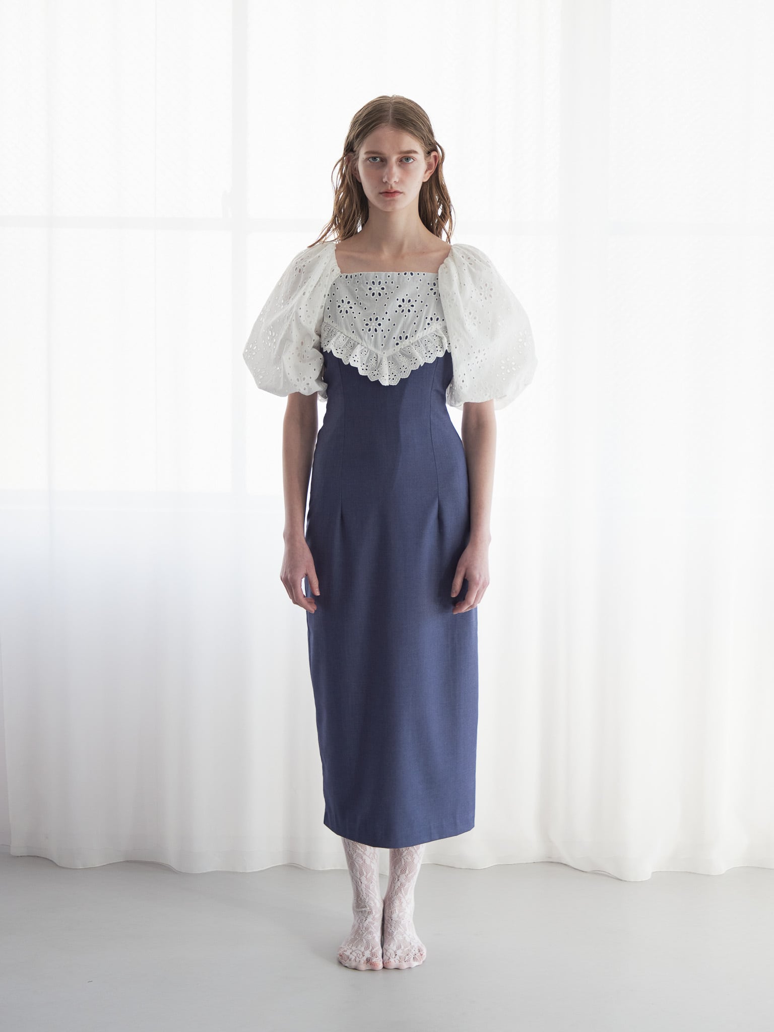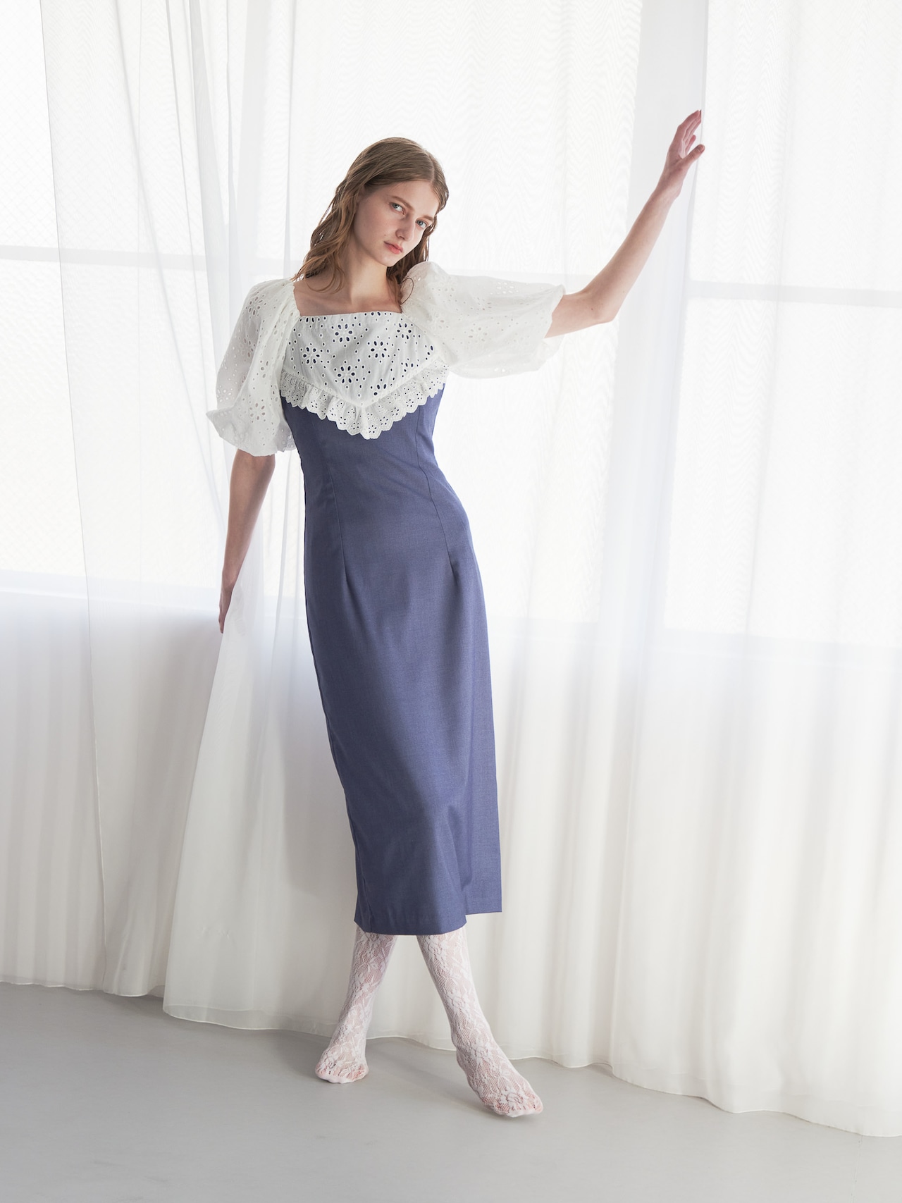 刺繍のコットン生地をスカーフのようにカッティングしドッキングしたワンピース。ノスタルジックでロマンティックな雰囲気を演出します。ボリュームのあるパフスリーブがアイラインのボディシルエットとのバランス抜群です。スカートの後ろの裾にベンツ開きがありアイラインながらも足さばきはgood。後ろファスナーで着用でき、後ろウエストのリボンを結んでボディにフィットさせてご着用いただけます。