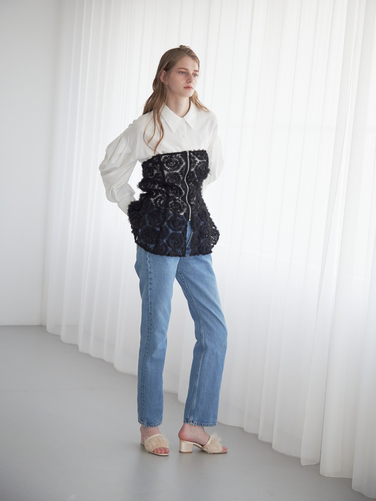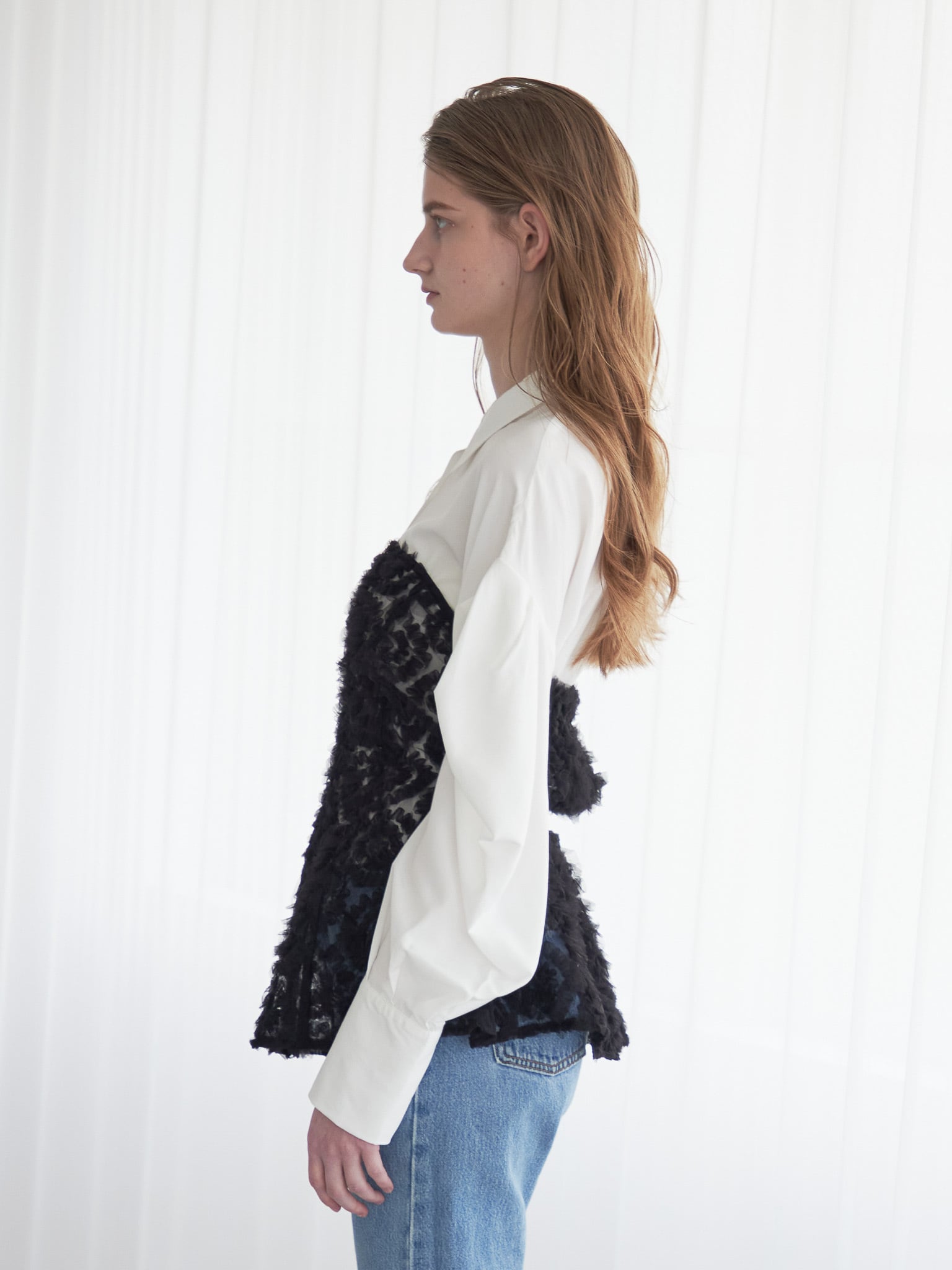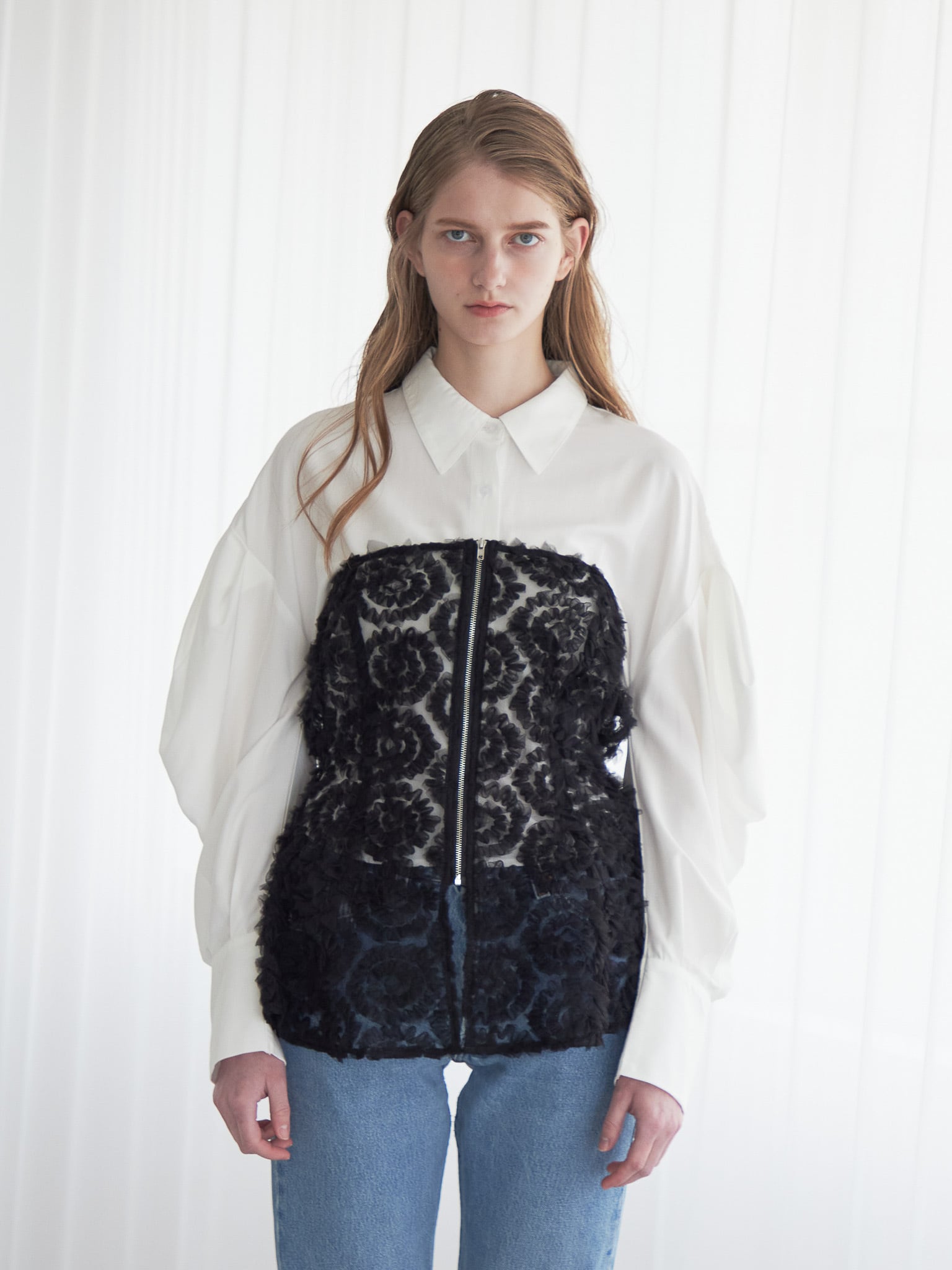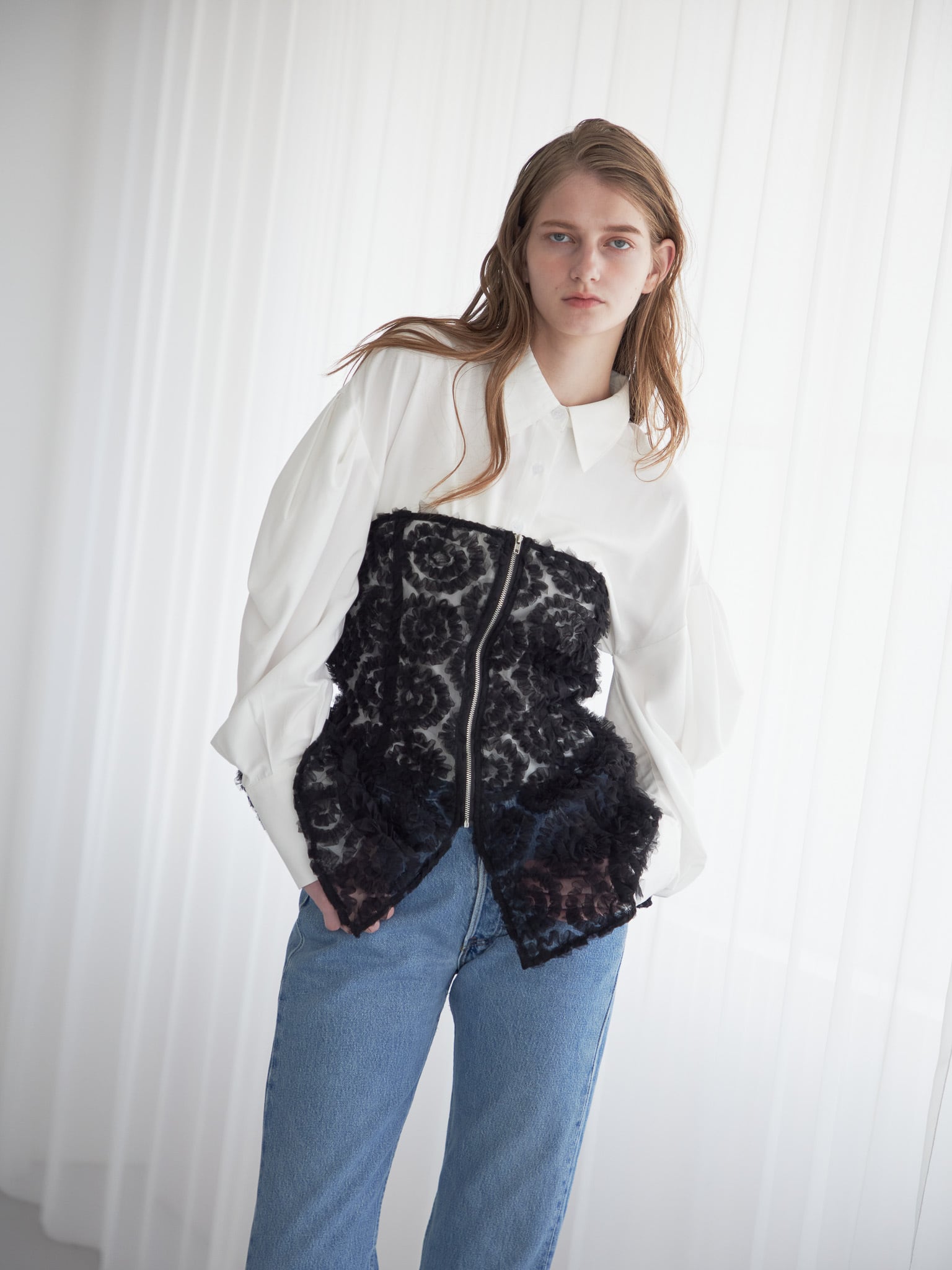 立体的なチュールのベアトップとシャツのセット。ベアトップはフロントのファスナーで開閉し着脱できます。ベアトップのバスト後ろはゴムになっているので、ボディにフィットします。セットのシャツと合わせたり、お手持ちのニットなどと合わせてもコーデのアクセントになり便利です。タックでボリュームたっぷりの袖のシャツは1枚でも使え、モードな気分を上げてくれます。1セットあると様々なシーンで着回しが叶います。