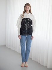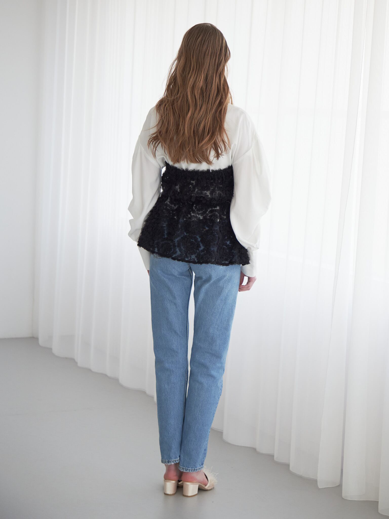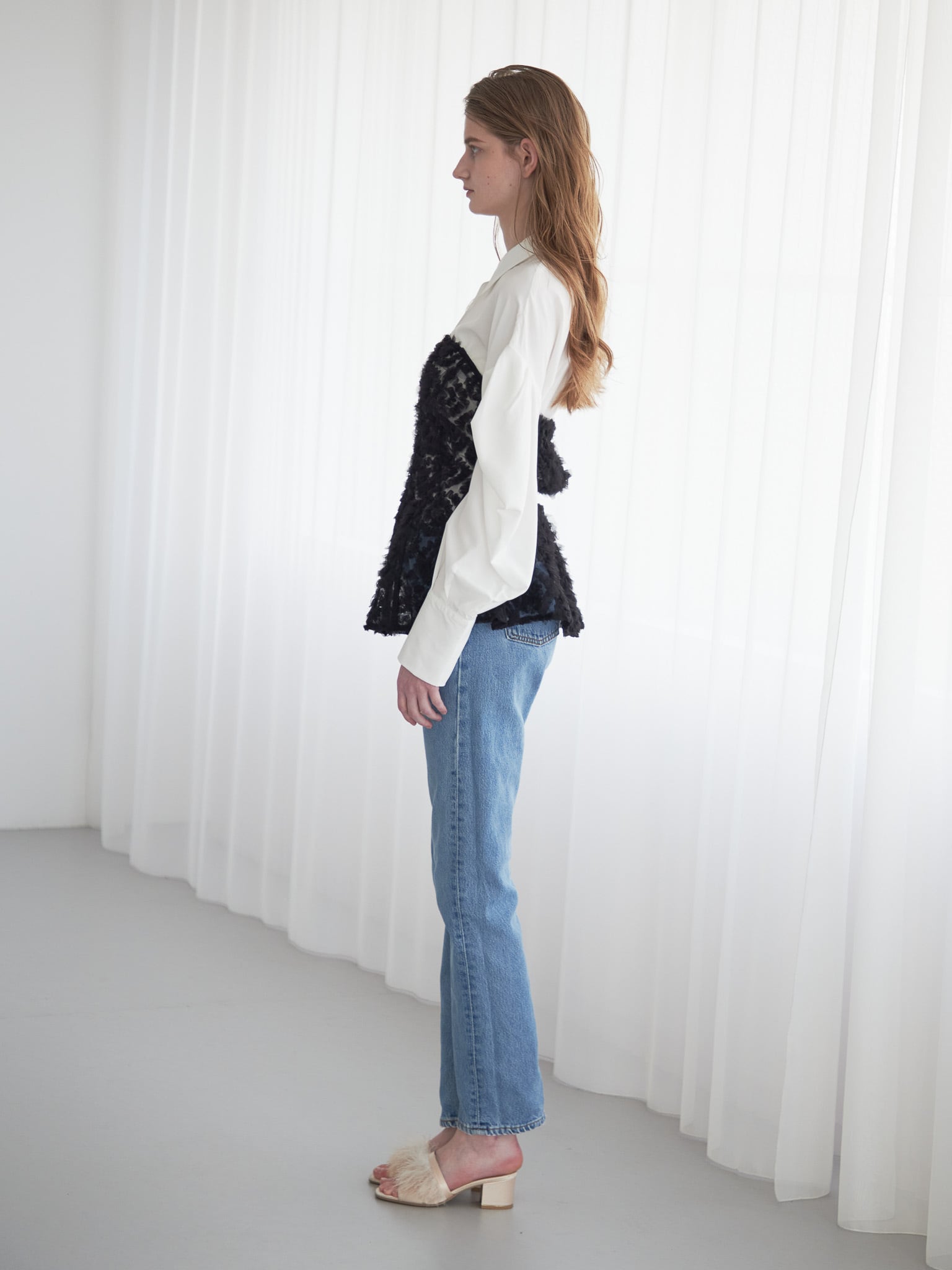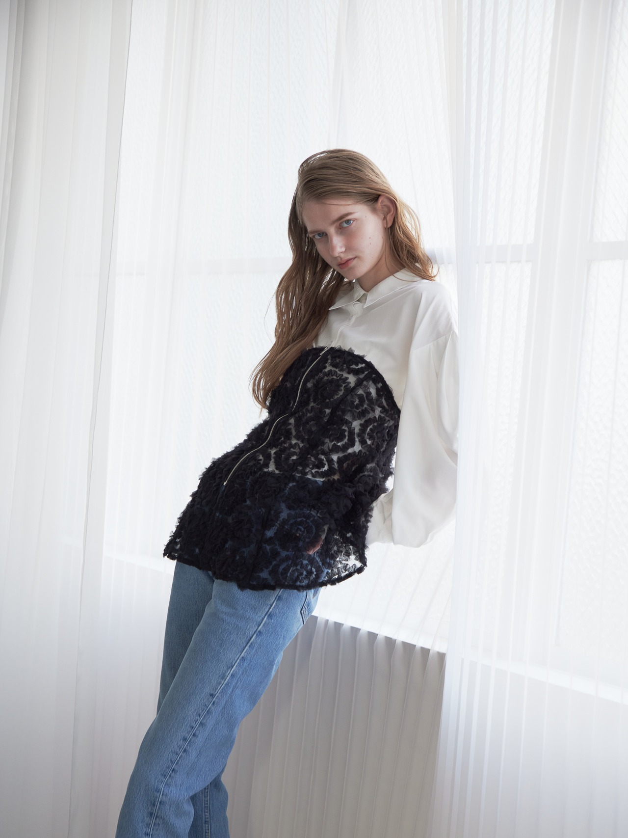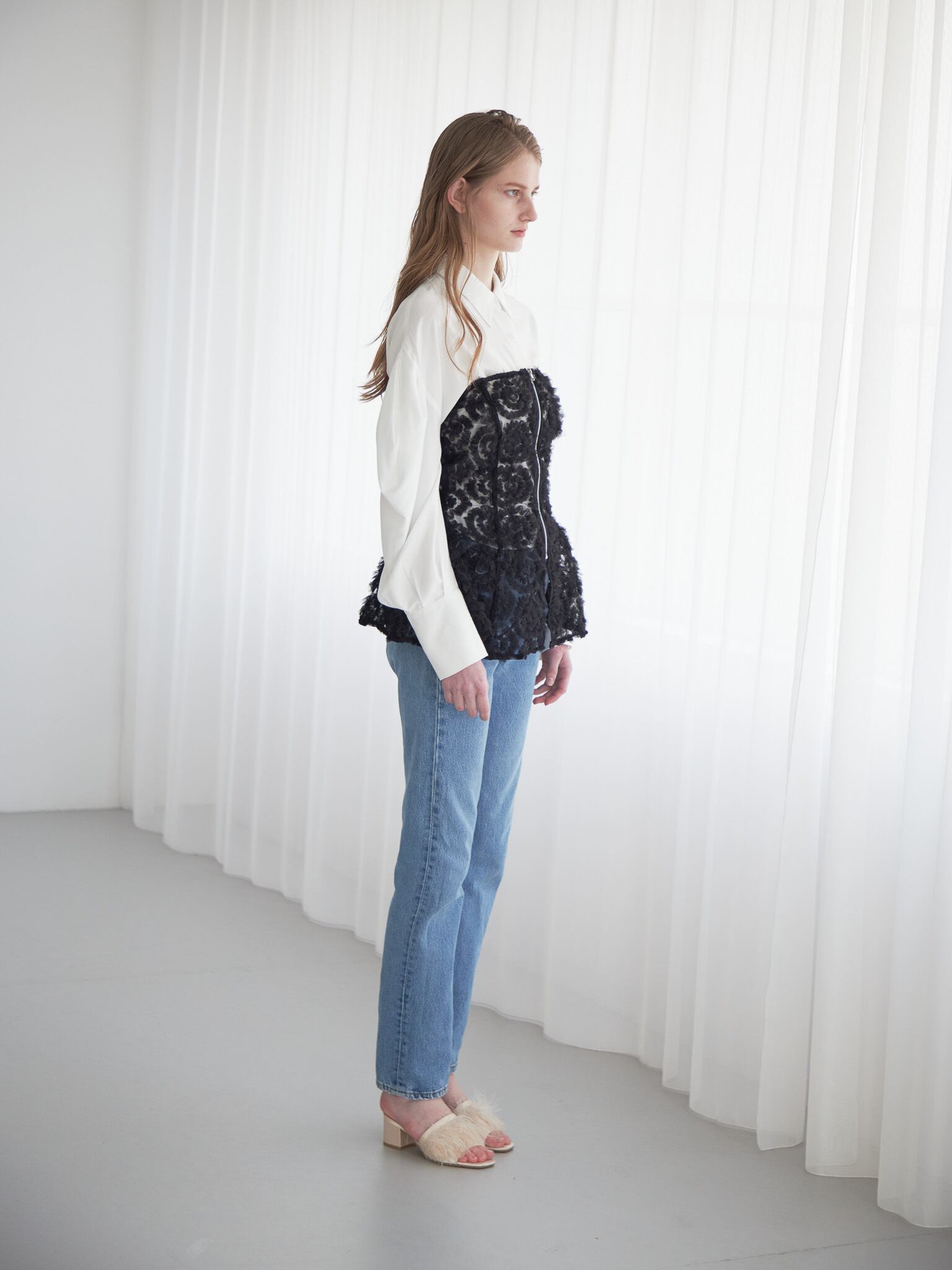 立体的なチュールのベアトップとシャツのセット。ベアトップはフロントのファスナーで開閉し着脱できます。ベアトップのバスト後ろはゴムになっているので、ボディにフィットします。セットのシャツと合わせたり、お手持ちのニットなどと合わせてもコーデのアクセントになり便利です。タックでボリュームたっぷりの袖のシャツは1枚でも使え、モードな気分を上げてくれます。1セットあると様々なシーンで着回しが叶います。